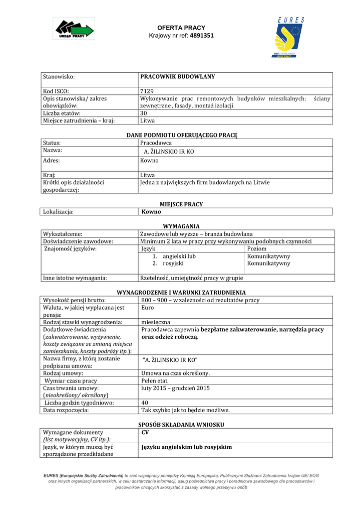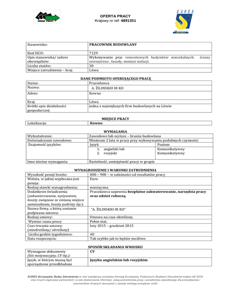 OFERTA PRACY Krajowy nr ref: 4891351 Stanowisko: PRACOWNIK BUDOWLANY Kod ISCO: Opis stanowiska/ zakres obowiązków: Liczba etatów: Miejsce zatrudnienia – kraj: 7129 Wykonywanie prac remontowych budynków mieszkalnych: zewnętrzne , fasady, montaż izolacji. 30 Litwa Status: Nazwa: Adres: Kraj: Krótki opis działalności gospodarczej: Lokalizacja: Wykształcenie: Doświadczenie zawodowe: Znajomość języków: Inne istotne wymagania: ściany DANE PODMIOTU OFERUJĄCEGO PRACĘ Pracodawca A. ŽILINSKIO IR KO Kowno Litwa Jedna z największych firm budowlanych na Litwie MIEJSCE PRACY Kowno WYMAGANIA Zawodowe lub wyższe – branża budowlana Minimum 2 lata w pracy przy wykonywaniu podobnych czynności Język Poziom 1. angielski lub Komunikatywny 2. rosyjski Komunikatywny Rzetelność, umiejętność pracy w grupie WYNAGRODZENIE I WARUNKI ZATRUDNIENIA Wysokość pensji brutto: 800 – 900 – w zależności od rezultatów pracy Waluta, w jakiej wypłacana jest Euro pensja: Rodzaj stawki wynagrodzenia: miesięczna Dodatkowe świadczenia Pracodawca zapewnia bezpłatne zakwaterowanie, narzędzia pracy (zakwaterowanie, wyżywienie, oraz odzież roboczą. koszty związane ze zmianą miejsca zamieszkania, koszty podróży itp.): Nazwa firmy, z którą zostanie "A. ŽILINSKIO IR KO" podpisana umowa: Rodzaj umowy: Umowa na czas określony. Wymiar czasu pracy Pełen etat. Czas trwania umowy: luty 2015 – grudzień 2015 (nieokreślony/ określony) Liczba godzin tygodniowo: 40 Data rozpoczęcia: Tak szybko jak to będzie możliwe. Wymagane dokumenty (list motywacyjny, CV itp.): Język, w którym muszą być sporządzone przedkładane SPOSÓB SKŁADANIA WNIOSKU CV Języku angielskim lub rosyjskim EURES (Europejskie Służby Zatrudnienia) to sieć współpracy pomiędzy Komisją Europejską, Publicznymi Służbami Zatrudnienia krajów UE/ EOG oraz innych organizacji partnerskich, w celu dostarczania informacji, usług pośrednictwa pracy i poradnictwa zawodowego dla pracodawców i pracowników chcących skorzystać z zasady wolnego przepływu osób dokumenty: Do kogo należy wysłać dokumenty: (do pracodawcy/ doradcy EURES) Kandydaci proszeni są o przesłanie CV do doradcy EURES z Wojewódzkiego Urzędu Pracy w Białymstoku Gdzie należy wysłać dokumenty: (adres, adres e-mail, nr faksu z kodem kraju itp.) email: [email protected] – w tytule emaila proszę wpisać - Litwa - pracownik budowlany Tel. 85 74 97 235 WUP w Białymstoku, ul. Pogodna 22 15-354 Białystok Goda Maciulevičienė – doradca EURES z Litwy, Kaunas Local Labour Exchange E. Ožeškienės street 37, LT-44254 Kaunas, Lithuania Tel.: +370 37 225 279 Fax.: +370 37 225 605 Email: [email protected] Dane teleadresowe doradcy EURES lub przedstawiciela pracodawcy: WAŻNOŚĆ Data publikacji: Termin przedkładania podań o pracę / zakończenia ważności oferty: 23.02.2015 Do odwołania Uprzejmie informujemy, że skontaktujemy się wyłącznie z wybranymi kandydatami. UWAGA: 1. Umowa z zagranicznym pracodawcą zostanie zawarta zgodnie z prawem kraju zatrudnienia. Oznacza to, że wszystkie roszczenia odnośnie do warunków, które obejmuje umowa, można kierować wyłącznie do odpowiedniego sądu w kraju zatrudnienia. Publiczne służby zatrudnienia (EURES) nie mogą pośredniczyć ani reprezentować pracownika w sądzie kraju zatrudnienia w przypadku sporu z pracodawcą. 2. Publiczne służby zatrudnienia (EURES) dokładają wszelkich starań, aby zapewnić rzetelność i wiarygodność ofert pracy zgłoszonych w lokalnym urzędzie pracy. Należy wyjaśnić, że oferta pracy została zgłoszona przez stronę trzecią i EURES nie odpowiada za ewentualne rozbieżności między warunkami pracy określonymi w ofercie pracy i warunkami oferowanymi przez potencjalnego pracodawcę. 3. Publiczne służby zatrudnienia (EURES) informują, że będą zbierać, przetwarzać i przekazywać potencjalnym pracodawcom zgodnie z przepisami dotyczącymi ochrony danych osobowych wszystkie dane osobowe dostarczone przez osoby poszukujące pracy. EURES (Europejskie Służby Zatrudnienia) to sieć współpracy pomiędzy Komisją Europejską, Publicznymi Służbami Zatrudnienia krajów UE/ EOG oraz innych organizacji partnerskich, w celu dostarczania informacji, usług pośrednictwa pracy i poradnictwa zawodowego dla pracodawców i pracowników chcących skorzystać z zasady wolnego przepływu osób