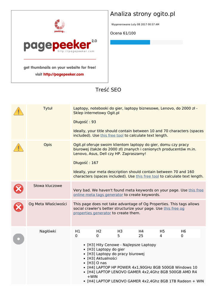 Analiza strony ogito.pl Wygenerowane Luty 08 2017 00:57 AM Ocena 61/100 Treść SEO Tytuł Laptopy, notebooki do gier, laptopy biznesowe, Lenovo, do 2000 zł Sklep internetowy Ogit.pl Długość : 93 Ideally, your title should contain between 10 and 70 characters (spaces included). Use this free tool to calculate text length. Opis Ogit.pl oferuje swoim klientom laptopy do gier, domu czy pracy biurowej (także do 2000 zł) znanych i cenionych producentów m.in. Lenovo, Asus, Dell czy HP. Zapraszamy! Długość : 167 Ideally, your meta description should contain between 70 and 160 characters (spaces included). Use this free tool to calculate text length. Słowa kluczowe Very bad. We haven't found meta keywords on your page. Use this free online meta tags generator to create keywords. Og Meta Właściwości Nagłówki This page does not take advantage of Og Properties. This tags allows social crawler's better structurize your page. Use this free og properties generator to create them. H1 0 H2 0 H3 5 H4 25 H5 4 H6 0 [H3] Hity Cenowe - Najlepsze Laptopy [H3] Laptopy do gier [H3] Laptopy do pracy biurowej [H3] Aktualności [H3] O nas [H4] LAPTOP HP POWER 4x1,90GHz 8GB 500GB Windows 10 [H4] LAPTOP LENOVO GAMER 4x2,4Ghz 8GB 500GB AMD R4 +WIN [H4] LAPTOP LENOVO GAMER 4x2,4Ghz 8GB 1TB Radeon + WIN Treść SEO 10 [H4] DUŻY LAPTOP LENOVO 4x1,8Ghz 8GB 500GB RADEON + WIN [H4] LAPTOP LENOVO POWER 100 4x2,66Ghz 8GB SSD240 +WIN [H4] LAPTOP ASUS DO GIER 4x2,4Ghz 8GB 1TB GEFORCE Win10 [H4] LAPTOP ASUS DO GIER 4x2,4Ghz 8GB 1TB GEFORCE Win10 [H4] LAPTOP LENOVO Do GIER 4x1,9Ghz 8GB SSD GEFORCE WIN [H4] Laptop LENOVO GAMER i5-5200U 8GB 1TB GeFORCE + BONUS 500zł [H4] LAPTOP ASUS DO GIER i5-5200 8GB GRAFA2GB 1TB WIN10 [H4] LAPTOP LENOVO MEGA 4x2,8GHz Full HD 8GB SSHD1TB R5M330 2GB+WIN [H4] LENOVO GAMER 500 i5 16GB 1TB SSHD RADEON R9-2GB WIN 10 [H4] LAPTOP HP POWER 4x1,90GHz 8GB 500GB Windows 10 [H4] MOCNY LAPTOP ASUS core i3 4GB 1TB + Windows 10 [H4] DUŻY LAPTOP LENOVO 4x1,8Ghz 8GB 500GB RADEON + WIN [H4] LAPTOP LENOVO POWER 100 4x2,66Ghz 8GB SSD240 +WIN [H4] LENOVO THINKPAD i7-6500U 8GB SSD240 R7 2GB WIN10 [H4] LENOVO THINKPAD i7-6500U 15.6" IPS Full HD 16GB SSD240 R7 2GB WIN10 [H4] 30 dni na zwrot [H4] Darmowa wysyłka [H4] 100% zadowolenia [H4] Kontakt [H4] Zobacz Ogit na Facebook [H4] Newsletter [H4] Sprawdz Ogit.pl na: [H5] Najlepsze laptopy na prezent świąteczny dla mężczyzny! [H5] Jak wybrać laptopa w zależności od ceny i rodzaju? [H5] Najnowsze Laptopy – Kwiecień 2016 [H5] Jak wybrać laptop do gier? – Sprawdź nasze porady! Obrazy We found 23 images on this web page. 1 alt attributes are empty or missing. Add alternative text so that search engines can better understand the content of your images. Współczynnik Text/HTML Ratio : 21% Good, this page's ratio of text to HTML code is higher than 15, but lower than 25 percent. Flash Perfect, no Flash content has been detected on this page. Treść SEO Ramka Too Bad, you have Iframes on the web pages, this mean that content in an Iframe cannot be indexed. SEO Linki URL Rewrite Good. Your links looks friendly! Podkreślenia w adresach URL Perfect! No underscores detected in your URLs. Linki na stronie We found a total of 8 links including 0 link(s) to files Statistics External Links : noFollow 0% External Links : Passing Juice 100% Internal Links 0% Linki na stronie Anchor Type Juice Hity cenowe External Passing Juice Laptopy do pracy External Passing Juice Laptopy dla graczy External Passing Juice Asus External Passing Juice Dell External Passing Juice HP External Passing Juice Lenovo External Passing Juice Akcesoria External Passing Juice SEO słowa kluczowe Chmura - słowa kluczowe gier dla 199,00 asus laptopy laptop 1tb SEO słowa kluczowe ogit.pl 8gb lenovo Słowa kluczowe spójność Keyword Content laptopy 19 laptop 18 lenovo 17 8gb 15 ogit.pl 11 Tytuł Słowa kluczowe Opis Użyteczność - Usability Url Domain : ogito.pl Długość : 8 Favicon Great, your website has a favicon. Printability We could not find a Print-Friendly CSS. Język Good. Your declared language is pl. Dublin Core This page does not take advantage of Dublin Core. Document Doctype HTML 5 Kodowanie Perfect. Your declared charset is UTF-8. Nagłówki Document W3C Validity Błędy : 0 Ostrzeżenia : 0 Email Privacy Great no email address has been found in plain text! Nieaktualne HTML Great! We haven't found deprecated HTML tags in your HTML. Porady prędkości Excellent, your website doesn't use nested tables. Too bad, your website is using inline styles. Great, your website has few CSS files. Perfect, your website has few JavaScript files. Mobile Mobile Optimization Apple Icon Meta Viewport Tag Flash content Powered by TCPDF (www.tcpdf.org)
