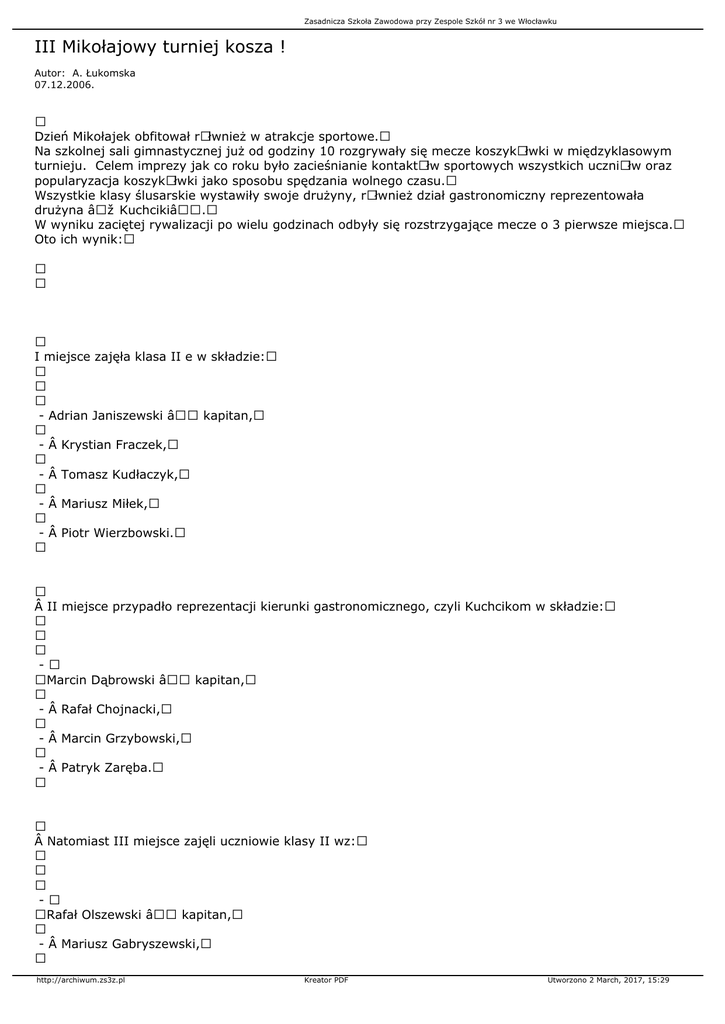 Zasadnicza Szkoła Zawodowa przy Zespole Szkół nr 3 we Włocławku III Mikołajowy turniej kosza ! Autor: A. Łukomska 07.12.2006. Dzień Mikołajek obfitował rÃłwnież w atrakcje sportowe. Na szkolnej sali gimnastycznej już od godziny 10 rozgrywały się mecze koszykÃłwki w międzyklasowym turnieju. Celem imprezy jak co roku było zacieśnianie kontaktÃłw sportowych wszystkich uczniÃłw oraz popularyzacja koszykÃłwki jako sposobu spędzania wolnego czasu. Wszystkie klasy ślusarskie wystawiły swoje drużyny, rÃłwnież dział gastronomiczny reprezentowała drużyna „Kuchciki―. W wyniku zaciętej rywalizacji po wielu godzinach odbyły się rozstrzygające mecze o 3 pierwsze miejsca. Oto ich wynik: I miejsce zajęła klasa II e w składzie: - Adrian Janiszewski – kapitan, -  Krystian Fraczek, -  Tomasz Kudłaczyk, -  Mariusz Miłek, -  Piotr Wierzbowski.  II miejsce przypadło reprezentacji kierunki gastronomicznego, czyli Kuchcikom w składzie: - Marcin Dąbrowski – kapitan, -  Rafał Chojnacki, -  Marcin Grzybowski, -  Patryk Zaręba.  Natomiast III miejsce zajęli uczniowie klasy II wz: - Rafał Olszewski – kapitan, -  Mariusz Gabryszewski, http://archiwum.zs3z.pl Kreator PDF Utworzono 2 March, 2017, 15:29 Zasadnicza Szkoła Zawodowa przy Zespole Szkół nr 3 we Włocławku -  Łukasz Wiśniewski, -  Łukasz ZiÃłłkowski, -  Łukasz ZiÃłłkowski.  Tytuł MVP finału czyli najbardziej wartościowego zawodnika turnieju otrzymało dwÃłch uczniÃłw: - Adrian Janiszewski (29 punktÃłw zdobytych w meczach), - Marcin Dąbrowski (25 punktÃłw).  Wszyscy uczestnicy turnieju zostali obdarowani słodkimi nagrodami. Gratulujemy zwycięzcom!!! http://archiwum.zs3z.pl Kreator PDF Utworzono 2 March, 2017, 15:29