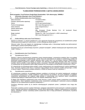 Paweł Bartoszewicz, Tłumacz Przysięgły Języka Angielskiego, ul. Bielawska 36c/122, 05-520 Konstancin-Jeziorna TŁUMACZENIE POŚWIADCZONE Z JĘZYKA ANGIELSKIEGO -/Skrót prospektu: Fund Partners Kredyt Bank Sustainables 1 (Nr referencyjny: 300698)-/i) Informacje dotyczące sicav Fund Partners-/(1) Krótka charakterystyka sicav Fund Partners-/Data utworzenia: 10 kwietnia 2002 r. Państwo członkowskie rejestracji: Luksemburg-/Status: UCITS typu parasolowego-/Podmiot Zarządzający: KBC Asset Management S.A.-/Okres istnienia: okres nieograniczony-/Waluta referencyjna: EUR-/Depozytariusz: KBL European Private Bankers S.A., 43 boulevard L-2955 Luksemburg-/Biegły rewident: Deloitte S.A., 560, rue de Neudorf, L-2220 Luksemburg-/Promotor: KBC Asset Management S.A.-/-/(2) Krótka definicja celów sicav Fund Partners-/- Royal, Zgodnie ze statutem i w ramach określonych w nim ograniczeń Zarząd jest upoważniony do kształtowania polityki inwestycyjnej poszczególnych subfunduszy, na które składają się aktywa spółki.-/-. Głównym celem Sicav jest dążenie do największego możliwego zysku z lokowanego kapitału przy jednoczesnym przestrzeganiu zasady dywersyfikacji ryzyka.-/Ponieważ UCITS typu parasolowego przyznano „paszport europejski”, polityka inwestycyjna jest regulowana przez Część I Ustawy.-/-/(3) Opodatkowanie sicav Fund Partners-/- (a) Opodatkowanie Sicav-/- Zgodnie z obecnie obowiązującymi przepisami prawa luksemburskiego i powszechną praktyką Sicav nie podlega opodatkowaniu dochodów w Luksemburgu. Jednak Sicav jest zobowiązane do zapłaty w Luksemburgu podatku od subskrypcji wynoszącego 0,05% wartości aktywów netto w skali roku, o ile nie podano inaczej w Załącznikach. Powyższy podatek przypada do zapłaty co kwartał i jest obliczany na podstawie aktywów netto Sicav na koniec kwartału. Oprócz podatku z tytułu rejestracji spółki w wysokości 1200 EUR, płatnego jednorazowo przy rejestracji, w Luksemburgu nie są pobierane żadne opłaty skarbowe ani inne podatki od emisji tytułów uczestnictwa w Sicav.W Luksemburgu nie obowiązują żadne podatki z tytułu zrealizowanych lub niezrealizowanych zysków kapitałowych Sicav. Dochody uzyskane przez Sicav z inwestycji mogą podlegać różnym stawkom podatku potrącanego u źródła w danych krajach. Wspomniany podatek potrącany u źródła nie zawsze może być odzyskany.-/(b) Opodatkowanie uczestników-/- W Luksemburgu uczestnicy nie podlegają żadnemu podatkowi od dochodu lub zysków kapitałowych, podatkowi dochodowemu potrącanemu u źródła, podatkowi z tytułu darowizn lub spadków, ani innym podatkom (z wyjątkiem uczestników zamieszkałych lub mających stałą siedzibę w Luksemburgu oraz niektórych byłych mieszkańców Luksemburga będących właścicielami ponad 10% kapitału zakładowego Sicav).-/W Belgii zyski kapitałowe zrealizowane przez osoby fizyczne z tytułu wykupu tytułów uczestnictwa nie podlegają opodatkowaniu. Zyski kapitałowe zrealizowane przez uczestników posiadających osobowość prawną podlegają mającym do nich zastosowanie przepisom podatkowym.-/Powyższe informacje oparte są na obecnie obowiązujących przepisach prawa i praktykach oraz mogą ulec zmianie.-/Potencjalni uczestnicy powinni uzyskać informacje i zasięgnąć odpowiednich porad prawnych w zakresie przepisów prawa i regulacji dotyczących opodatkowania i kontroli obrotu dewizowego, mających zastosowanie do subskrypcji, zakupu, posiadania, wykupu i sprzedaży tytułów uczestnictwa Sicav w kraju pochodzenia, zamieszkania, rezydencji lub utworzenia.-/-/- Strona 1 z 9 (4) Częstotliwość i miejsce/sposób publikacji i udostępniania cen sicav Fund Partners-/- Informacje na temat wartości aktywów netto na jeden tytuł uczestnictwa każdego subfunduszu oraz cen emisji i wykupu można uzyskać w siedzibie Sicav lub od depozytariusza lub podmiotów świadczących usługi finansowe i ich oddziałów.-/(5) Koszty lub prowizje opłacane przez sicav Fund Partners-/- Sicav będzie ponosić wszelkie koszty przypadające do zapłaty przez Sicav, w tym między innymi koszt zmiany statutu oraz koszty operacyjne obejmujące między innymi:-/(a) Koszty dystrybucji-/- Sicav może wypłacać prowizje od sprzedaży dystrybutorom wprowadzającym do obrotu tytuły uczestnictwa subfunduszy. W takim przypadku sposób naliczania i wysokość procentowa prowizji zostaną wskazane w opisie danego subfunduszu.-/(b) Pozostałe koszty-/ wynagrodzenie i określone koszty Zarządu;-/- prowizja dla Podmiotu Zarządzającego;-/- prowizja dla depozytariusza i ewentualnie jego banków-korespondentów (wyliczana na podstawie zwyczajowych opłat bankowych z tytułu deponowania aktywów i przechowywania papierów wartościowych, płatna co kwartał jako kwota procentowa aktywów netto);-/- wynagrodzenie dla biegłych rewidentów;-/- wynagrodzenie za usługi prawnicze;-/- wydatki na publikację prospektu oraz rocznych i półrocznych sprawozdań Sicav oraz pozostałych informacji dla uczestników, a także opłaty i podatki, prowizje dla pośredników i opłaty rejestracyjne, opłaty za druk papierów wartościowych i wszelkie kwoty należne organom nadzorczym krajów, w których tytuły uczestnictwa są oferowane w sprzedaży;-/- wydatki związane z rejestracją spółki, szacowane na 12 500 EUR, które będą amortyzowane przez okres pięciu lat od pierwszego dnia następującego po zakończeniu okresu pierwotnej subskrypcji;-/- prowizje dla pośredników;-/- podatki płatne przez Sicav;-/- opłaty z tytułu rejestracji Sicav i utrzymania wpisu rejestracyjnego przez organy rządowe.-/- W odniesieniu do inwestorów każdy subfundusz jest traktowany jako odrębny podmiot.-/Prawa wierzycieli w stosunku do subfunduszu lub związane z utworzeniem, funkcjonowaniem lub likwidacją subfunduszu są ograniczone do aktywów subfunduszu. Aktywa subfunduszu będą wykorzystywane wyłącznie na rzecz wierzycieli, których prawa powstały ws