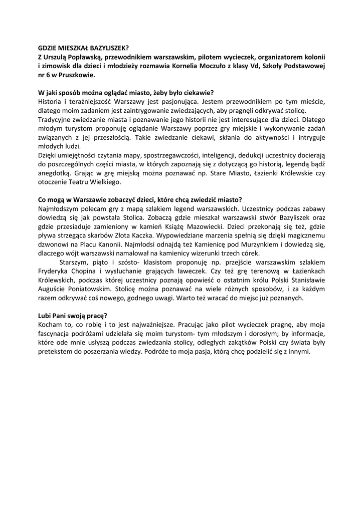 GDZIE MIESZKAŁ BAZYLISZEK? Z Urszulą Popławską, przewodnikiem warszawskim, pilotem wycieczek, organizatorem kolonii i zimowisk dla dzieci i młodzieży rozmawia Kornelia Moczuło z klasy Vd, Szkoły Podstawowej nr 6 w Pruszkowie. W jaki sposób można oglądać miasto, żeby było ciekawie? Historia i teraźniejszość Warszawy jest pasjonująca. Jestem przewodnikiem po tym mieście, dlatego moim zadaniem jest zaintrygowanie zwiedzających, aby pragnęli odkrywać stolicę. Tradycyjne zwiedzanie miasta i poznawanie jego historii nie jest interesujące dla dzieci. Dlatego młodym turystom proponuję oglądanie Warszawy poprzez gry miejskie i wykonywanie zadań związanych z jej przeszłością. Takie zwiedzanie ciekawi, skłania do aktywności i intryguje młodych ludzi. Dzięki umiejętności czytania mapy, spostrzegawczości, inteligencji, dedukcji uczestnicy docierają do poszczególnych części miasta, w których zapoznają się z dotyczącą go historią, legendą bądź anegdotką. Grając w grę miejską można poznawać np. Stare Miasto, Łazienki Królewskie czy otoczenie Teatru Wielkiego. Co mogą w Warszawie zobaczyć dzieci, które chcą zwiedzić miasto? Najmłodszym polecam gry z mapą szlakiem legend warszawskich. Uczestnicy podczas zabawy dowiedzą się jak powstała Stolica. Zobaczą gdzie mieszkał warszawski stwór Bazyliszek oraz gdzie przesiaduje zamieniony w kamień Książę Mazowiecki. Dzieci przekonają się też, gdzie pływa strzegąca skarbów Złota Kaczka. Wypowiedziane marzenia spełnią się dzięki magicznemu dzwonowi na Placu Kanonii. Najmłodsi odnajdą też Kamienicę pod Murzynkiem i dowiedzą się, dlaczego wójt warszawski namalował na kamienicy wizerunki trzech córek. Starszym, piąto i szósto- klasistom proponuję np. przejście warszawskim szlakiem Fryderyka Chopina i wysłuchanie grających ławeczek. Czy też grę terenową w Łazienkach Królewskich, podczas której uczestnicy poznają opowieść o ostatnim królu Polski Stanisławie Auguście Poniatowskim. Stolicę można poznawać na wiele różnych sposobów, i za każdym razem odkrywać coś nowego, godnego uwagi. Warto też wracać do miejsc już poznanych. Lubi Pani swoją pracę? Kocham to, co robię i to jest najważniejsze. Pracując jako pilot wycieczek pragnę, aby moja fascynacja podróżami udzielała się moim turystom- tym młodszym i dorosłym; by informacje, które ode mnie usłyszą podczas zwiedzania stolicy, odległych zakątków Polski czy świata były pretekstem do poszerzania wiedzy. Podróże to moja pasja, którą chcę podzielić się z innymi.