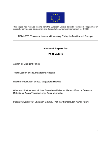 This project has received funding from the European Union’s Seventh Framework Programme for research, technological development and demonstration under grant agreement no. 290694. TENLAW: Tenancy Law and Housing Policy in Multi-level Europe National Report for POLAND Author: dr Grzegorz Panek Team Leader: dr hab. Magdalena Habdas National Supervisor: dr hab. Magdalena Habdas Other contributors: prof. dr hab. Stanisława Kalus, dr Mariusz Fras, dr Grzegorz Matusik, dr Agata Twardoch, mgr Anna Majewska Peer reviewers: Prof. Christoph Schmid, Prof. Per Norberg, Dr. Anneli Kährik 1 National Report for Poland Table of Contents 1 Housing situation 1.1 General features 1.2 Historical evolution of the national housing situation and housing policy 1.3 Current situation 1.4 Types of housing tenures 1.5 Other general aspects 2 Economic urban and social factors 2.1 Current situation of the housing market 2.2 Issues of price and affordability 2.3 Tenancy contracts and investment 2.4 Other economic factors 2.5 Effects of the current crisis 2.6 Urban aspects of the housing situation 2.7 Social aspects of the housing situation 3 Housing policies and related policies 3.1 Introduction 3.2 Governmental actors 3.3 Housing policies 3.4 Urban policies 3.5 Energy policies 3.6 Subsidization 3.7 Taxation 4 Regulatory types of rental and intermediate tenures 4.1 Classifications of different types of regulatory tenures 4.2 Regulatory types of tenures without a public task 4.3 Regulatory types of tenures with a public task 5 Origins and development of tenancy law 6 Tenancy regulation and its context 6.1 General introduction 6.2 Preparation and negotiation of tenancy contracts 6.3 Conclusion of tenancy contracts 6.4 Contents of tenancy contracts 6.5 Implementation of tenancy contracts 6.6 Termination of tenancy contracts 6.7 Enforcing tenancy contracts 6.8 Tenancy law and procedure “in action” 7 Effects of EU law and policies on national tenancy policies and law 7.1 EU policies and legislation affecting national housing policies 2 7.2 7.3 EU policies and legislation affecting national housing law Table of transposition of EU legislation 8. Typical national cases (with short solutions) 8.1 - 8.10 9. Tables 9.1 Literature 9.2 Cases 9.3 Abbreviations 3 1. Housing situation 1.1. General features The current situation on the housing market cannot be understood without the knowledge of historical background. The evolution of legal institutions (and specific tenures) is going to be thoroughly discussed at the beginning of Part II of the report. At this point, it seems important to define historical phenomena which led to the present situation. The most striking problem regarding the housing situation in Poland is scarcity of housing units. The number of units per 1000 inhabitants is the second lowest in Europe, following Albania. 1 This problem and its scale has multiple grounds and requires much time, as well as political attention to be addressed properly. In 2008, the proportion of houses erected before 1989 to the overall number of residential houses amounted to 84,8. 2 Over the past 20 years, the housing stock has not grown sufficiently. The increase in the number of permanently occupied units was lower between 1989 and 2002 (8.5%) than in the years 1979-1988 (14.9%). 3 Nearly 30% of units in municipal buildings in the cities still came from before 1918, with only every tenth constructed after 1970. Housing premises owned by mainly state run employers are much younger. Almost half of their total in the cities derive from the period following 1970. Before the political transformations, all housing units in private tenement houses came from before 1945. 4 1.2. Historical evolution of the national housing situation and housing policy Please describe the historic evolution of the national housing situation and housing policies briefly. o In particular: Please describe briefly the evolution of the principal types of housing tenures from the 1990s on. Explain the growth and decline of the different tenures and the reasons why that happened (e.g. privatization or other policies). The condition of private tenements is also quite poor because of former regulation of rents which could not be freely raised even when they finally became negotiable. 5 It must be admitted, though, that certain state interventions were justified by tenant necessities. Not only communist authorities were not particularly fond of landlords. 1 M. Frąckowiak, Ekonomiczne i społeczne problemy polskiego mieszkalnictwa (Poznań: Poznańskie Towarzystwo Przyjaciół Nauk, 2008), 10. 2 Narodowe Strategiczne Ramy Odniesienia 2007 ‐ 2013, Wytyczne Ministra Rozwoju Regionalnego w zakresie programowania działań dotyczących mieszkalnictwa opracowane przez Ministerstwo Rozwoju regionalnego, MRR/H/18(2)/08/08 (governmental document). 3 R. Kierzenkowski, 'Bridging the Housing Gap in Poland', OECD Economics Department Working Papers, no. 639 (2008), 10. 4 Por. T. Billiński, H. Kulesza, Czynsze i dodatki mieszkaniowe. Uwarunkowania, konsekwencje i porady praktyczne (Warszawa ‐ Zielona Góra: Zachodnie Centrum Organizacji 1995), 33. 5 Following the enactment of the Tenants Protection Act of 21 June 2001. 4 Already in 1919 the government froze rents at the 1914 rates. 6 As another war was coming to an end, in 1944 the new government could only follow the same pattern, freezing rents at pre-war values. 7 This step referred both to private and public sector. Unfortunately, this time devastations were more widespread, and such measures did not facilitate necessary restorations of the ageing tenements in private hands. In practice, they ousted - not without actual intent of the post-war legislator - many private owners from the market, since state institutions and co-operatives could claim the title to the premises reconditioned from their own funds where the private owner failed to comply with the duty to renovate the tenement at his own expense. 8 The sit