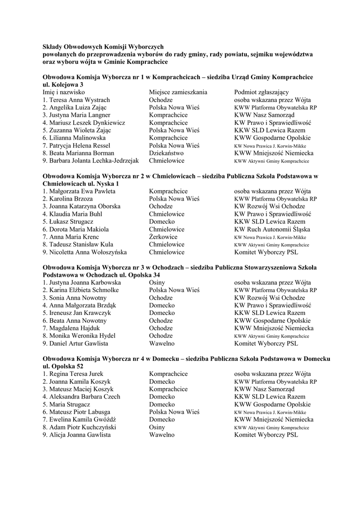 Składy Obwodowych Komisji Wyborczych powołanych do przeprowadzenia wyborów do rady gminy, rady powiatu, sejmiku województwa oraz wyboru wójta w Gminie Komprachcice Obwodowa Komisja Wyborcza nr 1 w Komprachcicach – siedziba Urząd Gminy Komprachcice ul. Kolejowa 3 Imię i nazwisko Miejsce zamieszkania Podmiot zgłaszający 1. Teresa Anna Wystrach Ochodze osoba wskazana przez Wójta 2. Angelika Luiza Zając Polska Nowa Wieś KWW Platforma Obywatelska RP 3. Justyna Maria Langner Komprachcice KWW Nasz Samorząd 4. Mariusz Leszek Dynkiewicz Komprachcice KW Prawo i Sprawiedliwość 5. Zuzanna Wioleta Zając Polska Nowa Wieś KKW SLD Lewica Razem 6. Lilianna Malinowska Komprachcice KWW Gospodarne Opolskie KW Nowa Prawica J. Korwin-Mikke 7. Patrycja Helena Ressel Polska Nowa Wieś 8. Beata Marianna Borman Dziekaństwo KWW Mniejszość Niemiecka 9. Barbara Jolanta Lechka-Jedrzejak Chmielowice KWW Aktywni Gminy Komprachcice Obwodowa Komisja Wyborcza nr 2 w Chmielowicach – siedziba Publiczna Szkoła Podstawowa w Chmielowicach ul. Nyska 1 1. Małgorzata Ewa Pawleta Komprachcice osoba wskazana przez Wójta KWW Platforma Obywatelska RP 2. Karolina Brzoza Polska Nowa Wieś 3. Joanna Katarzyna Oborska Ochodze KW Rozwój Wsi Ochodze 4. Klaudia Maria Buhl Chmielowice KW Prawo i Sprawiedliwość 5. Łukasz Strugacz Domecko KKW SLD Lewica Razem 6. Dorota Maria Makiola Chmielowice KW Ruch Autonomii Śląska 7. Anna Maria Krenc Żerkowice KW Nowa Prawica J. Korwin-Mikke KWW Aktywni Gminy Komprachcice 8. Tadeusz Stanisław Kula Chmielowice 9. Nicoletta Anna Wołoszyńska Chmielowice Komitet Wyborczy PSL Obwodowa Komisja Wyborcza nr 3 w Ochodzach – siedziba Publiczna Stowarzyszeniowa Szkoła Podstawowa w Ochodzach ul. Opolska 34 1. Justyna Joanna Karbowska Osiny osoba wskazana przez Wójta 2. Karina Elżbieta Schmolke Polska Nowa Wieś KWW Platforma Obywatelska RP 3. Sonia Anna Nowotny Ochodze KW Rozwój Wsi Ochodze 4. Anna Małgorzata Brzdąk Domecko KW Prawo i Sprawiedliwość 5. Ireneusz Jan Krawczyk Domecko KKW SLD Lewica Razem 6. Beata Anna Nowotny Ochodze KWW Gospodarne Opolskie 7. Magdalena Hajduk Ochodze KWW Mniejszość Niemiecka 8. Monika Weronika Hydel Ochodze KWW Aktywni Gminy Komprachcice 9. Daniel Artur Gawlista Wawelno Komitet Wyborczy PSL Obwodowa Komisja Wyborcza nr 4 w Domecku – siedziba Publiczna Szkoła Podstawowa w Domecku ul. Opolska 52 1. Regina Teresa Jurek Komprachcice osoba wskazana przez Wójta 2. Joanna Kamila Koszyk Domecko KWW Platforma Obywatelska RP 3. Mateusz Maciej Koszyk Komprachcice KWW Nasz Samorząd 4. Aleksandra Barbara Czech Domecko KKW SLD Lewica Razem 5. Maria Strugacz Domecko KWW Gospodarne Opolskie 6. Mateusz Piotr Labusga Polska Nowa Wieś KW Nowa Prawica J. Korwin-Mikke 7. Ewelina Kamila Gwóźdź Domecko KWW Mniejszość Niemiecka 8. Adam Piotr Kuchczyński Osiny KWW Aktywni Gminy Komprachcice 9. Alicja Joanna Gawlista Wawelno Komitet Wyborczy PSL Obwodowa Komisja Wyborcza nr 5 w Polskiej Nowej Wsi – siedziba Publiczna Szkoła Podstawowa w Polskiej Nowej Wsi ul. Lipowa 56 1. Anna Bernacka Komprachcice osoba wskazana przez Wójta 2. Małgorzata Gabriela Dudek Chmielowice KWW Nasz Samorząd 3. Maria Dorota Lysik Domecko KW Prawo i Sprawiedliwość 4. Tomasz Jan Chmura Wawelno KKW SLD Lewica Razem 5. Gabriela Jadwiga Łupak Komprachcice KWW Gospodarne Opolskie 6. Grzegorz Adam Szewczyk Polska Nowa Wieś KW Nowa Prawica J. Korwin-Mikke 7. Sandra Maria Helfrycz Polska Nowa Wieś KWW Mniejszość Niemiecka KWW Aktywni Gminy Komprachcice 8. Małgorzata Wróbel Żerkowice 9. Mariusz Jan Lauer Polska Nowa Wieś Komitet Wyborczy PSL Obwodowa Komisja Wyborcza nr 6 w Wawelnie – siedziba Publiczna Szkoła Podstawowa w Wawelnie ul. Nowowiejska 14 1. Sylwia Teresa Drass Komprachcice osoba wskazana przez Wójta 2. Barbara Teresa Weiss Polska Nowa Wieś KWW Platforma Obywatelska RP 3. Martyna Jadwiga Wittke Chmielowice KWW Nasz Samorząd 4. Daria Maria Parkitna Domecko KKW SLD Lewica Razem 5. Mirosław Leszek Łupak Komprachcice KWW Gospodarne Opolskie 6. Małgorzata Bareja-Szewczyk Polska Nowa Wieś KW Nowa Prawica J. Korwin-Mikke 7. Ditmar Eugeniusz Gawlista Wawelno KWW Mniejszość Niemiecka 8. Małgorzata Garus Komprachcice KWW Aktywni Gminy Komprachcice 9. Dominika Maria Nowak Wawelno Komitet Wyborczy PSL Obwodowa Komisja Wyborcza nr 7 w Osinach – siedziba świetlica w Osinach ul. Opolska 20 1. Maria Lauterbach Osiny osoba wskazana przez Wójta 2. Sylwia Niewrzol Polska Nowa Wieś KWW Platforma Obywatelska RP 3. Kornelia Longina Pawleta Chmielowice KWW Nasz Samorząd 4. Bożena Urszula Kościółek Domecko KW Prawo i Sprawiedliwość 5. Jarosław Bogusław Parkitny Domecko KKW SLD Lewica Razem 6. Aneta Anna Łupak Komprachcice KWW Gospodarne Opolskie 7. Ryszard Waldemar Krenc Żerkowice KW Nowa Prawica J. Korwin-Mikke 8. Monika Magdalena Golletz Osiny KWW Mniejszość Niemiecka 9. Helga Maria Klisz Osiny KWW Aktywni Gminy Komprachcice Obwodowa Komisja Wyborcza nr 8 w Komprachcicach – siedziba Samorządowy Ośrodek Kultury w Komprachcicach ul. Niemodlińska 2 1. Danuta Teresa Bugla Komprachcice osoba wskazana przez Wójta KWW Platforma Obywatelska RP 2. Beata Helena Bugla Komprachcice 3. Marcin Piotr Pawleta Chmielowice KWW Nasz Samorząd 4. Magdalena Kosciółek Domecko KW Prawo i Sprawiedliwość 5.Alfred Niewrzol Polska Nowa Wieś KKW SLD Lewica Razem 6. Ewa Teresa Łucka Domecko KWW Gospodarne Opolskie 7. Justyna Marta Rozmarynowska Polska Nowa Wieś KW Nowa Prawica J. Korwin-Mikke 8. Justyna Agnieszka Zając Komprachcice KWW Mniejszość Niemiecka 9. Katarzyna Joanna Cichos Komprachcice KWW Aktywni Gminy Komprachcice