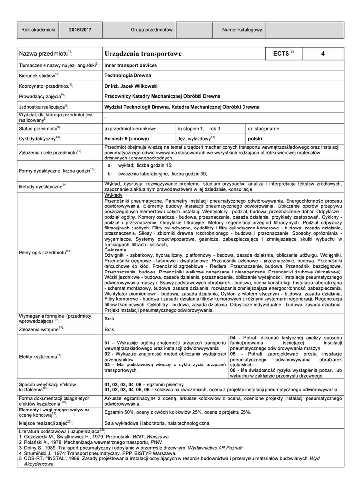 Rok akademicki: Grupa przedmiotów: 2016/2017 Nazwa przedmiotu1): Numer katalogowy: ECTS 2) Urządzenia transportowe 4 Tłumaczenie nazwy na jęz. angielski3): Inner transport devices Kierunek studiów4): Technologia Drewna 5) Koordynator przedmiotu : Dr inż. Jacek Wilkowski Prowadzący zajęcia6): Pracownicy Katedry Mechanicznej Obróbki Drewna 7) Jednostka realizująca : Wydział Technologii Drewna, Katedra Mechanicznej Obróbki Drewna Wydział, dla którego przedmiot jest realizowany8): - 9) Status przedmiotu : a) przedmiot kierunkowy b) stopień 1, Cykl dydaktyczny10): Semestr 5 (zimowy) Jęz. wykładowy11): Założenia i cele przedmiotu12): Przedmiot obejmuje wiedzę na temat urządzeń mechanicznych transportu wewnątrzzakładowego oraz instalacji pneumatycznego odwiórowywania stosowanych we wszystkich rodzajach obróbki wiórowej materiałów drzewnych i drewnopochodnych. Formy dydaktyczne, liczba godzin13): a) wykład; liczba godzin 15; b) ćwiczenia laboratoryjne; liczba godzin 30; rok 3 c) stacjonarne polski Wykład, dyskusja, rozwiązywanie problemu, studium przypadku, analiza i interpretacja tekstów źródłowych, zapoznanie z aktualnym prawodawstwem w tej dziedzinie, konsultacje. Wykłady Przenośniki pneumatyczne. Parametry instalacji pneumatycznego odwiórowywania. Energochłonność procesu odwiórowywania. Elementy budowy instalacji pneumatycznego odwiórowania. Obliczanie oporów przepływu poszczególnych elementów i całych instalacji. Wentylatory - podział, budowa, przeznaczenie dobór. Odpylacze podział ogólny. Komory osadcze - budowa, przeznaczenie, zasada działania, przykłady zastosowań. Cyklony podział i przeznaczenie. Odpylanie filtracyjne. Metody regeneracji przegród filtracyjnych. Podział odpylaczy filtracyjnych suchych. Filtry cylindryczne, cyklofiltry i filtry cylindryczno-komorowe - budowa, zasada działania, przeznaczenie. Silosy i zbiorniki drewna rozdrobnionego - budowa i przeznaczenie. Sposoby opróżniania wygarniacze. Systemy przeciwpożarowe, gaśnicze, zabezpieczające i zmniejszające skutki wybuchu w rurociągach, filtrach i silosach, Ćwiczenia Dźwigniki - zębatkowy, hydrauliczny, platformowy - budowa, zasada działania, obliczanie udźwigu. Wciągniki. Przenośniki cięgnowe - taśmowe i dwutaśmowe. Przenośniki członowe - przeznaczenie, budowa. Przenośniki łańcuchowe do kłód. Przenośniki zgrzebłowe - Redlera. Przeznaczenie, budowa. Przenośniki bezcięgnowe. Przeznaczenie, budowa. Przenośniki wałkowe napędzane i nienapędzane. Przenośniki śrubowe (ślimakowe). Wózki jezdniowe - budowa, zasada działania, przeznaczenie, obliczanie wydajności. Instalacje pneumatycznego odwiórowywania maszyn. Ssawy podstawowych obrabiarek - budowa, ocena konstrukcji. Instalacja laboratoryjna - schemat montażowy, budowa, zasada działania, rozwiązania zmniejszające energochłonność, zabezpieczenia. Wentylator promieniowy - budowa, zasada działania, Cyklon z wlotem stycznym - budowa, zasada działania, Filtry komorowe - budowa i zasada działania filtrów komorowych z różnymi systemami regeneracji. Regeneracja filtrów tkaninowych. Cyklofiltry - budowa, zasada działania. Odpylacze indywidualne - budowa, zasada działania. Projekt instalacji pneumatycznego odwiórowywania. Metody dydaktyczne14): Pełny opis przedmiotu15): Wymagania formalne (przedmioty wprowadzające)16): Brak Założenia wstępne17): Brak Efekty kształcenia18): 01 – Wykazuje ogólną znajomość urządzeń transportu wewnątrzzakładowego oraz instalacji odwiórowywania 02 - Wykazuje znajomość metod obliczania wydajności przenośników 03 - Ma podstawową wiedzę o cyklu życia urządzeń transportowych. Sposób weryfikacji efektów kształcenia19): 01, 02, 03, 04, 06 – egzamin pisemny 01, 02, 03, 04, 05, 06 – kolokwia na ćwiczeniach, ocena z projektu instalacji pneumatycznego odwiórowywania Forma dokumentacji osiągniętych efektów kształcenia 20): Elementy i wagi mające wpływ na ocenę końcową21): Arkusze egzaminacyjne z oceną, arkusze kolokwiów z oceną, ocenione projekty instalacji pneumatycznego odwiórowywania. 04 - Potrafi dokonać krytycznej analizy sposobu funkcjonowania istniejącej instalacji pneumatycznego odwiórowywania maszyn 05 - Potrafi zaprojektować prostą instalację pneumatycznego odwiórowywania obrabiarek stolarskich 06 - Ma świadomość ryzyka wystąpienia pożaru lub wybuchu w zakładzie przemysłu drzewnego Egzamin 50%, oceny z dwóch kolokwiów 25%, ocena z projektu 25%. 22) Miejsce realizacji zajęć : Sala wykładowa i laboratoria, hala technologiczna. 23) Literatura podstawowa i uzupełniająca : 1. Goździecki M., Świątkiewicz H., 1979: Przenośniki, WNT, Warszawa. 2. Polański A., 1978: Mechanizacja wewnętrznego transportu, PWN. 3. Dolny S., 1989: Transport pneumatyczny i odpylanie w przemyśle drzewnym. Wydawnictwo AR Poznań. 4. Strumiński J., 1974: Transport pneumatyczny, PPP, BISTYP Warszawa. 5. COB-RTJ "INSTAL", 1989: Zasady projektowania instalacji odpylających w resorcie budownictwa i przemysłu materiałów budowlanych. Wyd. Akcydensowe. 6. Juda J., Nowicki M., 1979: Urządzenia odpylające, PWN. 7. Malicki M., 1971: Odciągi miejscowe. PWN. 8. Materiały dostarczone w formie cyfrowej przez koordynatora przedmiotu 7. Strony internetowe producentów urządzeń UWAGI24): Wskaźniki ilościowe charakteryzujące moduł/przedmiot25): Szacunkowa sumaryczna liczba godzin pracy studenta (kontaktowych i pracy własnej) niezbędna dla osiągnięcia zakładanych efektów kształcenia18) - na tej podstawie należy wypełnić pole ECTS2: 100 (55+45) h Łączna liczba punktów ECTS, którą student uzyskuje na zajęciach wymagających bezpośredniego udziału nauczycieli akademicki 2 ECTS Łączna liczba punktów ECTS, którą student uzyskuje w ramach zajęć o charakterze praktycznym, takich jak zajęcia laboratoryjne, projektowe, itp.: 2 ECTS Tabela zgodności kierunkowych efektów kształcenia efektami 
