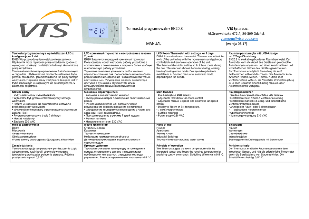 Termostat programowalny EH20.3 MANUAL Termostat programowalny z wyświetlaczem LCD z konfiguracją na 7 dni EH20.3 to przewodowy termostat pomieszczeniowy. Użytkownik może regulować pracę urządzenia zgodnie z wymogami, uzyskując bardziej komfortową i ekonomiczną pracę urządzenia. Termostat umożliwia zaprogramowania 2 stref czasowych w ciągu dnia. Użytkownik ma możliwość ustawienia trybu grzania, chłodzenia, grzania/chłodzenia lub pracy samego wentylatora. Regulacja pracy wentylatora dostępna jest w trybie manualnym 3-stopniowym lub automatycznym, w zależności od potrzeb. Główne cechy • Duży podświetlany wyświetlacz LCD • Wybieralne tryb grzania/chłodzenia/pracy samego wentylatora • Ręczne 3-stopniowe lub automatyczne sterowanie prędkością pracy wentylatora • Wyświetlanie temperatury w pomieszczeniu (Room) lub zadanej (Set) • Programowanie pracy w trybie 7 dniowym • Montaż naścienny • Zasilanie 230 VAC Miejsca zastosowania Domy Mieszkania Obszary handlowe Obiekty przemysłowe Wodne zawory dwudrogowe/trójdrogowe z siłownikiem Zasada działania Termostat odczytuje temperaturę w pomieszczeniu dzięki wbudowanemu czujnikowi i utrzymuje wymaganą temperaturę przekazując polecenia sterujące. Różnica przełączania wynosi 0,5 °C. LCD комнатный термостат с настройками в течение 7 дней EH20.3 является проводной комнатный термостат. Пользователь может настроить работу устройства в соответствии с пожеланиями и получить более удобную и экономичную работу устройства. Термостат позволяет установить до 2-х часовых периодов в течение дня. Пользователь может выбрать режим: отопления, отопления / охлаждения или только вентиляторный.. Регулировка скорости вентилятора доступна в ручном 3-х ступенчатом или в автоматическом режиме в зависимости от потребностей. Основные характеристики • Большой, с подсветкой ЖК-дисплей • Выбор режима нагрев / охлаждение / вентиляторный режим • Ручное 3-ступенчатое или автоматическое регулирование скорости вращения вентилятора • Отображение температуры в помещении ( Room) или заданной (Set) температуры. • Программирование в режиме 7 дней недели • Монтаж на стене • Напряжение питания 230 VAC Места применения Отдельные дома Квартиры Торговые помещения Небольшие промышленные объекты Двухходовые/трехходовые водяные клапаны с сервоприводом Принцип действия Термостат считывает температуру в помещении с помощью встроенного датчика и поддерживает необходимую температуру, ,передавая команды управления. Разница переключения составляет 0,5 ° C. VTS Sp. z o. o. Al.Grunwaldzka 472 A, 80-309 Gdańsk [email protected] (wersja 02.17) LCD Room Thermostat with settings for 7 days EH20.3 is a wired room thermostat. The user can adjust the work of the unit in line with the requirements and get more comfortable and economic operation of the unit. The thermostat enables setting up to 2 time zones during the day. The user can choose between heating, cooling, heating/cooling or fan mode. Fan speed regulation is available in a 3-speed manual or automatic mode, depending on the needs. Raumtemperaturregler mit LCD-Anzeige mit 7-Tage-Einstellung EH20.3 ist ein kabelgebundener Raumthermostat. Der Anwender kann die Arbeit des Gerätes an gewünschte Anforderungen anpassen, und einen komfortableren und wirtschaftlichen Betrieb des Gerätes gewährleisten. Der Thermostat ermöglicht Einstellung bis zu 2 Zeitbereichen während des Tages. Der Anwender kann zwischen Heizen, Kühlen, Heizen / Kühlen oder Ventilatorbetrieb wählen. Die Ventilator-Drehzahlregelung ist je nach Bedarf in einem 3-Gang manuell- oder Automatikbetrieb verfügbar. Main features • Big, backlighted LCD display • Adjustable Heat/Cool/Fan mode control • Adjustable manual 3-speed and automatic fan speed control • Display of Room or Set temperature. • 7 days Programmable • Surface Mounting • Power supply 230 VAC Haupteigenschaften • Großes, hintergrundbeleuchtetes LCD-Display • Einstellbare Heiz- / Kühl- / Ventilatorsteuerung • Einstellbare manuelle 3-Gang- und automatische Ventilatordrehzahlregelung • Anzeige der Raum- oder Solltemperatur. • 7 Tage/Woche Programmierbar • Oberflächenmontage • Spannungsversorgung 230 VAC Place of use Houses Apartments Trading Areas Industrial Buildings Two-way/three-way actuated water valves Einsatzorte Häuser Wohnungen Geschäftsräume Industrieobjekte Zweiwegeventile/Dreiwegventile mit Servomotor Principle of operation The Thermostat gets the room temperature with the integrated sensor and keeps the required temperature by providing control commands. Switching difference is 0.5 °C. Funktionsprinzip Der Thermostat erhält die Raumtemperatur mit dem integrierten Sensor, und hält die erforderliche Temperatur durch die Bereitstellung von Steuerbefehlen. Die Schaltdifferenz beträgt 0,5 ° C. Dane techniczne Технические данные Technical Data Technische Daten Źródło zasilania Napięcie Pr