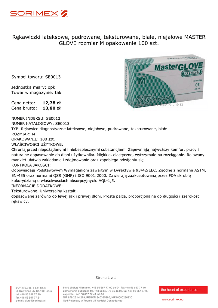 Rękawiczki lateksowe, pudrowane, teksturowane, białe, niejałowe MASTER GLOVE rozmiar M opakowanie 100 szt. Symbol towaru: SE0013 Jednostka miary: opk Towar w magazynie: tak Cena netto: Cena brutto: 12,78 zł 13,80 zł NUMER INDEKSU: SE0013 NUMER KATALOGOWY: SE0013 TYP: Rękawice diagnostyczne lateksowe, niejałowe, pudrowane, teksturowane, białe ROZMIAR: M OPAKOWANIE: 100 szt. WŁAŚCIWOŚCI UŻYTKOWE: Chronią przed niepożądanymi i niebezpiecznymi substancjami. Zapewniają najwyższy komfort pracy i naturalne dopasowanie do dłoni użytkownika. Miękkie, elastyczne, wytrzymałe na rozciąganie. Rolowany mankiet ułatwia zakładanie i zdejmowanie oraz zapobiega odwijaniu się. KONTROLA JAKOŚCI: Odpowiadają Podstawowym Wymaganiom zawartym w Dyrektywie 93/42/EEC. Zgodne z normami ASTM, EN-455 oraz normami QSR (GMP) i ISO 9001:2000. Zawierają zaakceptowaną przez FDA skrobię kukurydzianą o właściwościach absorpcyjnych. AQL-1,5. INFORMACJE DODATKOWE: Teksturowane. Uniwersalny kształt dopasowane zarówno do lewej jak i prawej dłoni. Proste palce, proporcjonalne do długości i szerokości rękawicy. Strona 1 z 1
