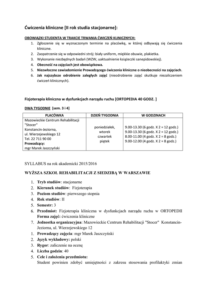 Ćwiczenia kliniczne [II rok studia stacjonarne]: OBOWIĄZKI STUDENTA W TRAKCIE TRWANIA ĆWICZEŃ KLINICZNYCH: 1. Zgłoszenie się w wyznaczonym terminie na placówkę, w której odbywają się ćwiczenia kliniczne. 2. Zaopatrzenie się w odpowiedni strój: biały uniform, miękkie obuwie, plakietka. 3. Wykonanie niezbędnych badań (WZW, uaktualnienie książeczki sanepidowskiej). 4. Obecność na zajęciach jest obowiązkowa. 5. Niezwłoczne zawiadomienie Prowadzącego ćwiczenia kliniczne o nieobecności na zajęciach. 6. Jak najszybsze odrobienie zaległych zajęć (nieodrobienie zajęć skutkuje niezaliczeniem ćwiczeń klinicznych). Fizjoterapia kliniczna w dysfunkcjach narządu ruchu [ORTOPEDIA 40 GODZ. ] DWA TYGODNIE [sem. 3 i 4] PLACÓWKA Mazowieckie Centrum Rehabilitacji "Stocer" Konstancin-Jeziorna, ul. Wierzejewskiego 12 Tel. 22 711 90 00 Prowadzący: mgr Marek Jaszczyński DZIEŃ TYGODNIA poniedziałek, wtorek czwartek piątek W GODZINACH 9.00-13.30 (6 godz. X 2 = 12 godz.) 9.00-13.30 (6 godz. X 2 = 12 godz.) 8.00-11.00 (4 godz. X 2 = 8 godz.) 9.00-12.00 (4 godz. X 2 = 8 godz.) SYLLABUS na rok akademicki 2015/2016 WYŻSZA SZKOŁ REHABILITACJI Z SIEDZIBĄ W WARSZAWIE Tryb studiów: stacjonarne Kierunek studiów: Fizjoterapia Poziom studiów: pierwszego stopnia Rok studiów: II Semestr: 3 Przedmiot: Fizjoterapia kliniczna w dysfunkcjach narządu ruchu w ORTOPEDII Forma zajęć: ćwiczenia kliniczne Jednostka organizacyjna: Mazowieckie Centrum Rehabilitacji "Stocer" KonstancinJeziorna, ul. Wierzejewskiego 12 Prowadzący zajęcia: mgr Marek Jaszczyński Język wykładowy: polski Rygor: zaliczenie na ocenę Liczba godzin: 40 Cele i założenia przedmiotu: Student powinien zdobyć umiejętności z zakresu stosowania profilaktyki zmian wtórnych, sterowania kompensacją i postępowaniem adaptacyjnym w wybranych jednostkach chorobowych Treści programowe 1. badanie ortopedyczne: a. wywiad z pacjentem b. badanie zakresu ruch w stawach kończyn dolnych, górnych oraz kręgosłupa c. pomiar długości kończyn: bezwzględnej i względnej d. pomiar obwodów kończyn e. test mięśniowy (Lovetta) 2. zespoły przeciążeniowe stawu kolanowego 3. chondromalacja stawu kolanowego 4. uszkodzenia więzadeł i łąkotek stawu kolanowego 5. zespół bolesnego barku 6. uszkodzenia stożka rotatorów 7. bark zamrożony 8. zespoły przeciążeniowe stawu łokciowego: a. łokieć tenisisty b. łokieć golfisty 9. neuropatie nerwu: a. promieniowego b. łokciowego c. pośrodkowego 10. zespoły bólowe w obrębie nadgarstka i ręki: a. zespół kanału nadgarstka i kanału Guyona b. choroba Dupuytrena c. choroba de Quervaina d. palec trzaskający 11. zespoły przeciążeniowe kręgosłupa 12. zespoły bólowe w obrębie stawu skokowego i stopy: a. zespół kanału stępu b. zmiany zwyrodnieniowe stawów stopy c. płaskostopie podłużne, poprzeczne d. paluch koślawy e. palce młotkowate 13. Reumoortopedia Specyfika fizjoterapii w chorobach reumatycznych po zabiegach ortopedycznych. Indywidualna praca z chorym. 14. Zaopatrzenie ortopedyczne w chorobach reumatycznych (kompensacja czynności i mięśni). Zajęcia z kompensacji utrudnionych funkcji narządu ruchu – nauka czynności dnia codziennego. 15. Fizjoterapia – dzieci Indywidualna praca - (wywiad, ocena kinezjologiczna i funkcjonalna, planowanie rehabilitacji, techniki usprawniania). 16. Fizjoterapia – dorośli Indywidualna praca - (wywiad, ocena kinezjologiczna i funkcjonalna, planowanie rehabilitacji, techniki usprawniania). 17. Ręka reumatoidalna - ocena kinezjologiczna i funkcjonalna, planowanie rehabilitacji, techniki usprawniania, zaopatrzenie ortopedyczne. 18. Kierunki usprawniania w układowych chorobach tkanki łącznej, które nie wywołują zasadniczych zmian w narządzie ruchu – indywidualna praca z pacjentem 19 Indywidualna ocena chorego z chorobami reumatycznymi wywiad, badanie kinezjologiczne, planowanie rehabilitacji, usprawnianie. 20 Rehabilitacja dziecka z mózgowym porażeniem dziecięcym 21 Rehabilitacja neurologiczna w ogniskowych uszkodzeniach OUN 22 Rehabilitacja dzieci po urazach rdzenia kręgowego. 23 Fizjoterapia w obwodowych uszkodzeniach układu nerwowego. 24 Upośledzenie umysłowe i najczęstsze zaburzenia zachowania u dzieci. 25 Fizjoterapia w wadach postawy u dzieci 26 Fizjoterapia po urazach narządu ruchu 27 Wybrane choroby reumatyczne- rola fizjoterapii w leczeniu 28 Omdlenia, bóle w klatce piersiowej, nadciśnienie tętnicze- etiologia i wpływ na fizjoterapię Literatura obowiązkowa: 1. Dega W., Ortopedia i Rehabilitacja, Warszawa, PZWL 1983. 2. Jakimowicz W., Neurologia Kliniczna, Warszawa, PZWL 1981. 3. Herold G., Medycyna Wewnętrzna, Warszawa, PZWL 2004. 4. CieCieślar – Korfel A. Usprawnianie po udarze mózgu. Poradnik dla terapeutów i pracowników podstawowej opieki zdrowotnej. Wyd. Elipsa Jaim s.c Krakow 2002 5. Fries W., Liebenstud I Rehabilitacja w chorobie Parkinsona Wyd. Elipsa Jaim s.c Krakow 2002 6. Kwolek A. Rehabilitacja Medyczna, Urban & Partner, Wrocław 2003 7. Kiwerski J. Rehabilitacja medyczna Wydawnictwo Lekarskie PZWL, Warszawa 2005 8. Szczeklik A. Choroby wewnętrzne Medycyna praktyczna Kraków 2006 9. Zimmerman-Górska (red) Choroby reumatyczne PZWL Warszawa 2008 10. Zembaty A. Kinezyterapia 1. Literatura uzupełniająca: 1. Backup K., Testy kliniczne w badaniu kości, stawów i mięśni. PZWL, 1998. 2. Tyllman D., Traumatologia narządu ruchu. PZWL, 1997.