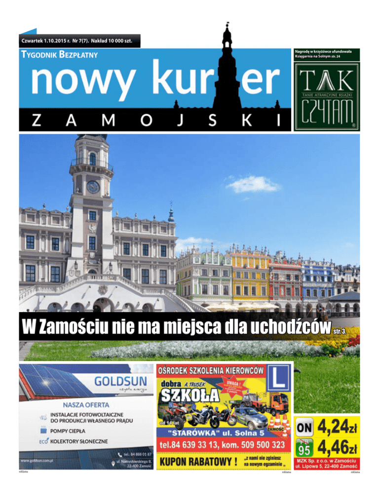 Czwartek 1.10.2015 r. Nr 7(7). Nakład 10 000 szt. Tygodnik Bezpłatny Nagrodę w krzyżówce ufundowała Księgarnia na Solnym str. 24 W Zamościu nie ma miejsca dla uchodźców reklama reklama str. 3. reklama 2 kurierzamojski.pl Szanowni Czytelnicy, W tym tygodniu w Nowym Kurierze Zamojskim prezentujemy obszerną relację z zakończonego właśnie pierwszego turnieju Zamojskiej Ligi Szóstek. Patronujemy przedsięwzięciu amatorskiej ligi piłkarskiej od początku i cieszymy się z tak dużego zainteresowania. Najlepszą drużyną okazał się faworyt rozgrywek - Renesans. Już niebawem nowe zmagania. (str. 12-13) W poprzednim numerze otworzyliśmy dla naszych Czytelników „Okienko Literackie”, a od tego tygodnia zapraszamy felietonistów. Pierwszy z nadesłanych felietonów publikujemy na str. 8 Zespół Redakcyjny Nowego Kuriera Zamojskiego reklama Leć z nami do walki z biedą! Potrzebujesz aktywności, lubisz nowe wyzwania, a może chcesz dać coś od siebie? Zbadaj brzuch w USG 5 października od 8.00 Roztoczańska Szkoła Ultrasonografii rozpoczyna rejestrację na bezpłatne badania USG jamy brzusznej. Badania będą wykonywane w dniach 12-16 października w Hotelu Jubilat. Na badania konieczna jest rejestracja telefoniczna. Będąc wolontariuszem dajemy wiele z siebie, ale i dużo zyskujemy. Nowe wyzwania, nowi ludzie, nowe satysfakcje. Zaangażuj się, to naprawdę szczytny cel! Paczka jednoczy naprawdę! Tylko w 2014 roku SZLACHETNA PACZKA pomogła 19 580 rodzinom żyjącym w biedzie, ta XIV edycja Paczki zjednoczyła ponad milion osób – potrzebujących, wolontariuszy, dar- 84 677 63 00 Powiatowy Urząd Pracy 84 638 33 31 Urząd Celny 84 748 48 82 Urząd Miasta 84 639 20 84 Urząd Gminy 84 639 29 59 ZUS 84 639 60 95 Kino Stylowy 84 639 23 13 Galeria Twierdza 84 530 05 01 Starostwo Powiatowe 84 530 09 00 Urząd Stanu Cywilnego Pędź z nami do walki z biedą i dołącz do naszej zamojskiej paczki! Weź udział w ogólnopolskim projekcie. To właśnie SZLACHETNA PACZKA daje Ci te wszystkie możliwości! Nie zwlekaj, już dziś zajrzyj na stronę: www. szlachetnapaczka. pl i zostań wolontariuszem! SuperW Paczki przekracza swoje granice, odwiedza potr ze b uj ą c yc h w ich domach i podejmuje decyzję o włączeniu do projektu. Pomaga tym, którzy czują się bezradni, opuszczeni i nieważni. SuperW to wyższa jakość zaangażowania w wolontariat. Urząd Skarbowy 84 638 80 90, 84 638 80 91, 84 638 55 12. czyńców przygotowujących pomoc i dobroczyńców finansujących organizację projektu, a to już ponad 2,5% Polaków! SZLACHETNA PACZKA niesie potrzebującym mądrą pomoc, daje impuls do zmiany życia. To już XV edycja! Zostań wolontariuszem Paczki! Zmieniaj świat i ludzi na lepsze! Pamiętaj, jeden za wszystkich, Wydawca: Agnieszka Ciurysek Kurier Zamojski www.kurierzamojski.pl Adres do korespondencji: Nowy Kurier Zamojski skrytka pocztowa 206 22-400 Zamość e-mail:[email protected] tel. 798 958 339 wszyscy za jednego! Dołącz do Drużyny na: www.superw.pl Wszelkich informacji udziela Lider Rejonu Zamość – Adam Herc, email: [email protected] Opr. Joanna Giruć Asystent ds. promocji Szlachetna Paczka Rejon Zamość Biuro ogłoszeń i reklamy: Tomasz Krywionek [email protected] tel.730 210 777 DTP: Mateusz Cholewiński Grafika: pixinch.pl Za treść ogłoszeń i reklam Redacja nie ponosi odpowiedzialności. Zastrzegamy sobie prawo do publikowania danych osobowych laureatów konkursów i krzyżówek. 84 677 12 56 Książnica Zamojska 84 638 58 72 Szpital Wojewódzki 84 677 33 33 Zamojski Szpital Niepubliczny 84 677 50 00 Sąd Rejonowy 84 639 29 77 Ogród zoologiczny 84 639 34 79 Apteka 24H 84 677 32 24 Komenda Miejska Policji 84 677 14 17 84 677 14 62 XI Sesja Rady Miasta – NIE dla uchodźców w Zamościu oniedziałkowa sesja Rady Miasta Zamość (28 września) należała do jednych z ciekawszych posiedzeń. Decyzją Rady Miasta został powołany do życia zakład budżetowy o nawie Centrum Integracji Społecznej w Zamościu. Jednogłośnie podjęto uchwałę o nadaniu tytułu Honorowego Obywatelstwa Miasta Zamość ppor. Bartoszowi Orzechowskiemu. Przypominamy, że Zamościanin podporucznik Bartosz Orzechowski pełnił służbę w Biurze Ochrony Rządu od marca 2003 r. W maju tegoż roku skierowany został do wykonywania zadań związanych z ochroną Ambasady Rzeczypospolitej Polskiej w Republice Iraku. 3 października 2007 r. zginął tragicznie w zamachu terrorystycznym, pełniąc służbę na posterunku. Pośmiertnie został odznaczony przez Prezydenta Lecha Kaczyńskiego Krzyżem TELEFONY ALARMOWE Pogotowie 999 Straż Pożarna 998 Policja 997 Pogotowie Wodno-Kanalizacyjne 994 Pogotowie ciepłownicze 993 Pogotowie gazowe 992 Pogotowie energetyczne 991 968 Straż Miejska Pewien rolnik postępowy z Józefowa 981 Pomoc drogowa pod kołderką dwie owieczki sobie chowa. Wie, że owce Okienko Literackie na manowce go prowadzą, ale żonę boli głowa. Szanowni Poeci, Pisarze i Wy Wielcy Grafomani Piotr Piela Chwytajcie za poetyckie pióra, lub prozaiczne długopisy. Nowy Kurier Zamojski otwiera dla Was swoje Okienko literackie. Ślijcie do nas na adres [email protected] swoje teksty. Czekamy na Waszą twórczość. Różną, ale nie każdą. Wybór będzie stricte subiektywny. facebook.com /kurierzamojski P 84 639 33 29 Prokuratura Rejonowa Druk: Drukarnia Warszawa, ul. Matuszewska 14, 03-876 Warszawa 3 kurierzamojski.pl WAŻNE TELEFONY W ZAMOŚCIU Unia Szefów Zamojszczyzny po raz piąty J esienne spotkanie przedsiębiorców zrzeszonych w Unii Szefów Firm Zamojszczyzny odbyło się w Krasnobrodzie 26 września. Jest to już piąte tego typu spotkanie w tym roku. Unia Szefów Firm Zamojszczyzny zawiązała się w 1997 roku z inicjatywy trzynastu przedsiębiorców. Obecnie skupia ona blisko 60 członków: prezesów, dyrektorów, właścicieli przedsiębiorstw i spółek. Jest Stowarzyszeniem mającym wpływ na kreowanie rozwoju regionalnego oraz na rozwój prze
