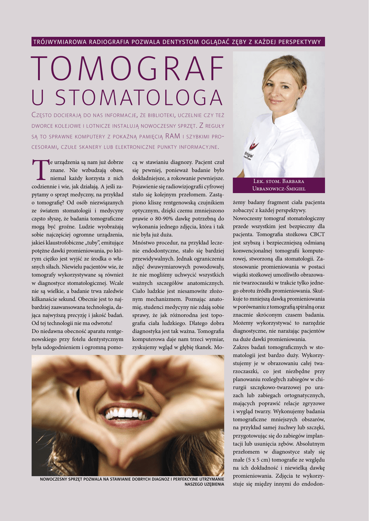 TRÓJWYMIAROWA RADIOGRAFIA POZWALA DENTYSTOM OGLĄDAĆ ZĘBY Z KAŻDEJ PERSPEKTYWY TOMOGRAF U STOMATOLOGA C ZĘSTO DOCIERAJĄ DO NAS INFORMACJE , ŻE BIBLIOTEK I , UCZELNIE CZ Y TEŻ DWORCE K OLEJOWE I LOTNICZE INSTALUJĄ NOWOCZESNY SPRZĘT . Z REGUŁY SĄ TO SPRAWNE K OMPUTER Y Z POK AŹNĄ PAMIĘCIĄ RAM I SZ YBK IMI PRO CESORAMI , CZUŁE SK ANER Y LUB ELEKTRONICZNE PUNKT Y INFORMAC YJNE . T e urządzenia są nam już dobrze znane. Nie wzbudzają obaw, niemal każdy korzysta z nich codziennie i wie, jak działają. A jeśli zapytamy o sprzęt medyczny, na przykład o tomografię? Od osób niezwiązanych ze światem stomatologii i medycyny często słyszę, że badania tomograficzne mogą być groźne. Ludzie wyobrażają sobie najczęściej ogromne urządzenia, jakieś klaustrofobiczne „tuby”, emitujące potężne dawki promieniowania, po którym ciężko jest wyjść ze środka o własnych siłach. Niewielu pacjentów wie, że tomografy wykorzystywane są również w diagnostyce stomatologicznej. Wcale nie są wielkie, a badanie trwa zaledwie kilkanaście sekund. Obecnie jest to najbardziej zaawansowana technologia, dająca najwyższą precyzję i jakość badań. Od tej technologii nie ma odwrotu! Do niedawna obecność aparatu rentgenowskiego przy fotelu dentystycznym była udogodnieniem i ogromną pomo- cą w stawianiu diagnozy. Pacjent czuł się pewniej, ponieważ badanie było dokładniejsze, a rokowanie pewniejsze. Pojawienie się radiowizjografii cyfrowej stało się kolejnym przełomem. Zastąpiono kliszę rentgenowską czujnikiem optycznym, dzięki czemu zmniejszono prawie o 80-90% dawkę potrzebną do wykonania jednego zdjęcia, która i tak nie była już duża. Mnóstwo procedur, na przykład leczenie endodontyczne, stało się bardziej przewidywalnych. Jednak ograniczenia zdjęć dwuwymiarowych powodowały, że nie mogliśmy uchwycić wszystkich ważnych szczegółów anatomicznych. Ciało ludzkie jest niesamowite złożonym mechanizmem. Poznając anatomię, studenci medycyny nie zdają sobie sprawy, że jak różnorodna jest topografia ciała ludzkiego. Dlatego dobra diagnostyka jest tak ważna. Tomografia komputerowa daje nam trzeci wymiar, zyskujemy wgląd w głębię tkanek. Mo- NOWOCZESNY SPRZĘT POZWALA NA STAWIANIE DOBRYCH DIAGNOZ I PERFEKCYJNE UTRZYMANIE NASZEGO UZĘBIENIA 34 NR 22 / 2012 • LADY’S CLUB Lek. stom. Barbara Urbanowicz-Śmigiel żemy badany fragment ciała pacjenta zobaczyć z każdej perspektywy. Nowoczesny tomograf stomatologiczny przede wszystkim jest bezpieczny dla pacjenta. Tomografia stożkowa CBCT jest szybszą i bezpieczniejszą odmianą konwencjonalnej tomografii komputerowej, stworzoną dla stomatologii. Zastosowanie promieniowania w postaci wiązki stożkowej umożliwiło obrazowanie twarzoczaszki w trakcie tylko jednego obrotu źródła promieniowania. Skutkuje to mniejszą dawką promieniowania w porównaniu z tomografią spiralną oraz znacznie skróconym czasem badania. Możemy wykorzystywać to narzędzie diagnostyczne, nie narażając pacjentów na duże dawki promieniowania. Zakres badań tomograficznych w stomatologii jest bardzo duży. Wykorzystujemy je w obrazowaniu całej twarzoczaszki, co jest niezbędne przy planowaniu rozległych zabiegów w chirurgii szczękowo-twarzowej po urazach lub zabiegach ortognatycznych, mających poprawić relacje zgryzowe i wygląd twarzy. Wykonujemy badania tomograficzne mniejszych obszarów, na przykład samej żuchwy lub szczęki, przygotowując się do zabiegów implantacji lub usunięcia zębów. Absolutnym przełomem w diagnostyce stały się małe (5 x 5 cm) tomografie ze względu na ich dokładność i niewielką dawkę promieniowania. Zdjęcia te wykorzystuje się między innymi do endodon- Fot. Kodak Dental Systems OPROGRAMOWANIE CS 3D IMAGING JEST ZAAWANSOWANĄ APLIKACJĄ POZWALAJĄCĄ NA PROSTE PRZEGLĄDANIE BADAŃ I PLANOWANIE LECZENIA cji. Zawsze przed przystąpieniem do ponownego leczenia endodontycznego warto wykonać takie zdjęcie. Może ono zaoszczędzić czas i lekarza, i pacjenta oraz zmniejszyć koszty, ponieważ już po tym badaniu może się okazać, że leczenie nie skończyłoby się sukcesem z powodu zmiany chorobowej wokół korzeni. Badanie to pozwala poznać też anatomię zęba. Mogą się bowiem pojawić dodatkowe kanały czy korzenie, które nie byłyby widoczne na konwencjonalnych zdjęciach rentgenowskich. Niska dawka promieniowania pozwala na wykonanie dodatkowego badania w trakcie zabiegu, gdy zajdzie taka konieczność. Jest to nierzadko niezbędne w czasie zabiegów chirurgicznych, gdy istnieją trudne warunki anatomiczne, które mogłyby się skończyć powikłaniami. Badania tomograficzne mogą być również badaniami prewencyjnymi. Zdarza się, że „przy okazji” pacjent dowiaduje się o innych schorzeniach, które w początkowej fazie są niewykrywane i bezobjawowe. Mam na myśli nie tylko zmiany nowotworowe, ale także schorzenia laryngologiczne ze względu na bliskość zatok szczękowych. Bardzo często ujawniają się torbiele w zatokach lub inne stany chorobowe, zmniejszające światło zatok. Badanie to jest wtedy dobrym narzędziem diagnostycznym dla lekarza laryngologa. Lekarze stomatolodzy dysponujący tomografem komputerowym CBCT wykorzystują go do wielu procedur, dzięki czemu eliminują zwiadowcze zabiegi chirurgiczne, mogą lepiej planować leczenie, nie narażając pacjentów na komplikacje, mogą wreszcie wykrywać inne schorzenia, znacznie groźniejsze dla TECHNOLOGIA I SZTUKA W STOMATOLOGII TATUAŻ NA ZĘBACH W sobotę 1 grudnia w katowickim hotelu Angelo odbyło się – po raz pierwszy na Śląsku – ciekawe sympozjum interdyscyplinarne dla lekarzy stomatologów i techników dentystycznych, prezentujące niebywałe możliwości technologiczne systemu CAD-CAM oraz najwyższą klasę przy wykonywaniu wysokiej estetyki koron i licówek przy zastosowaniu perfekcyjnej diagnostyki wstępnej. Pomysłodawcą i głównym organizator