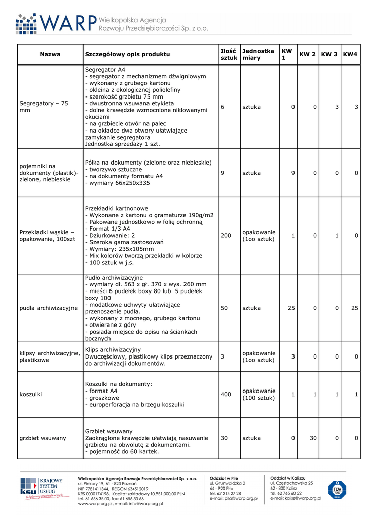Szczegółowy opis produktu Ilość Jednostka sztuk miary Segregatory – 75 mm Segregator A4 - segregator z mechanizmem dźwigniowym - wykonany z grubego kartonu - okleina z ekologicznej poliolefiny - szerokość grzbietu 75 mm - dwustronna wsuwana etykieta - dolne krawędzie wzmocnione niklowanymi okuciami - na grzbiecie otwór na palec - na okładce dwa otwory ułatwiające zamykanie segregatora Jednostka sprzedaży 1 szt. 6 sztuka 0 0 3 3 pojemniki na dokumenty (plastik)zielone, niebieskie Półka na dokumenty (zielone oraz niebieskie) - tworzywo sztuczne - na dokumenty formatu A4 - wymiary 66x250x335 9 sztuka 9 0 0 0 Przekladki wąskie – opakowanie, 100szt Przekładki kartnonowe - Wykonane z kartonu o gramaturze 190g/m2 - Pakowane jednostkowo w folię ochronną - Format 1/3 A4 - Dziurkowanie: 2 - Szeroka gama zastosowań - Wymiary: 235x105mm - Mix kolorów tworzą przekładki w kolorze - 100 sztuk w j.s. 200 opakowanie (1oo sztuk) 1 0 1 0 pudła archiwizacyjne Pudło archiwizacyjne - wymiary dł. 563 x gł. 370 x wys. 260 mm - mieści 6 pudełek boxy 80 lub 5 pudełek boxy 100 - modatkowe uchwyty ułatwiające przenoszenie pudła. - wykonany z mocnego, grubego kartonu - otwierane z góry - posiada miejsce do opisu na ściankach bocznych 50 sztuka 25 0 0 25 3 opakowanie (1oo sztuk) 3 0 0 0 400 opakowanie (100 sztuk) 1 1 1 1 30 sztuka 0 30 0 0 Nazwa Klips archiwizacyjny klipsy archiwizacyjne, Dwuczęściowy, plastikowy klips przeznaczony plastikowe do archiwizacji dokumentów. koszulki grzbiet wsuwany Koszulki na dokumenty: - format A4 - groszkowe - europerforacja na brzegu koszulki Grzbiet wsuwany Zaokrąglone krawędzie ułatwiają nasuwanie grzbietu na obwolutę z dokumentami. - pojemność do 60 kartek. KW 1 KW 2 KW 3 KW4 okładki do bindowania Okładki do bindowania - kolor bezbarwny - Grubość 200 mic. - Format A4 - 100 szt. w opak. 200 opakowanie (100 sztuk) 0 2 0 0 klipy biurowe opakowanie Klip biurowy 32 mm do spinania papieru, o wysokiej wytrzymałości. Wykonany z trwałego materiału. 1. opakowanie jednostkowe – 12 sztuk 2. metalowe 3. odporne na odkształcenia 4. galwanizowane 5. rozmiar – 32 mm 36 opakowanie (12 sztuk) 0 3 0 0 spinacze Spinacze biurowe - okrągłe, - potrójnie niklowane, - metalowe, - z wygiętymi noskami ułatwiającymi spinanie dokumentów, - rozmiar: 28 mm 30000 opakowanie (100 sztuk) 0 150 0 150 kalkulator Kalkulator biurowy, - posiadający 10-pozycyjny wyświetlacz, - możliwość cofania ostatnio wprowadzonej pozycji, - klawisz podwójnego zera, - podwójne zasilanie, - plastikowe klawisze. 2 sztuka 2 0 0 0 karteczki samoprzylepneopakowanie duze Bloczek karteczek samoprzylepnych - kolor: żółty - ekologiczne - wymiary 76x76 mm 60 opakowanie (6 sztuk) 3 3 2 2 karteczki samoprzylepneopakowanie male Bloczek karteczek samoprzylepnych - kolor: żółty - ekologiczne - wymiary 38x51 mm 60 opakowanie (6 sztuk) 3 3 2 2 karteczki samoprzylepne-4 kolory do zaznaczania Zakładki indeksujące - nadają się do wielorazowego użytku - substancja klejąca usuwalna za pomocą wody - nieprzezroczyste - ilość zakładek: 4 - kolory- 4 kolory - format: 20x50 mm - ilość karteczek: 4x50 sztuk Jednostka sprzedaży 1 opakowanie 6 opakowanie 2 2 1 1 duży zszywacz Zszywacz biurowy. - Zszywa od 25 do 130 kartek. - Głębokość wsuwania kartek do 70 mm. - Na zszywki 23/8, 23/10, 23/13, 23/15, 23/17. Jednostka sprzedaży 1 sztuka 1 sztuka 1 0 0 0 dziurkacze Dziurkacz - metalowa konstrukcja - posiadający wskaźnik środka strony - listwa ułatwiająca precyzyjne dziurkowania - jednorazowo dziurkuje do 15 kartek - rozstaw dziurek 80 mm 3 sztuka 2 1 0 0 przybornik na biurko Wielofunkcyjny przybornik na biurko: - materiał odporny na pęknięcia - obrotowy/nie obrotowy - posiadający przegrody na akcesoria piszące - jedna przegroda na karteczki - jedna przegroda na drobiazgi - przegródki wielofunkcyjne 3 sztuka 3 0 0 0 płyty Płyta CD jednokrotnego zapisu o pojemności 700MB i prędkości nagrywania x 52 30 sztuka 10 10 5 5 tablica korkowa Informacyjna tablica korkowa 1.w drewnianej ramie. 2.wymiar 75 x 75 cm 3.możliwość mocowania w pionie lub w poziomie Jednostka sprzedaży 1 szt. 3 sztuka 3 0 0 0 fotel biurowy granatowe Krzesło biurowe - posiada ergonomiczne, profilowane siedzenie oraz oparcie - obrotowe - krzesło wyłożone welurem - posiada podłokietniki - krzesło jest tapicerowane pianką i tkaniną 3 - regulacja wysokości oparcia i siedziska - posiada mechanizm umożliwiający odchylanie oparcie i blokadę w dowolnej pozycji - regulacja wysokości - podstawa 5-ramienna sztuka 3 0 0 0 pinezki kołeczki opakowanie Pinezki kołeczki, kolorowe, opakowanie opakowanie (100 sztuk) 1 0 0 0 100