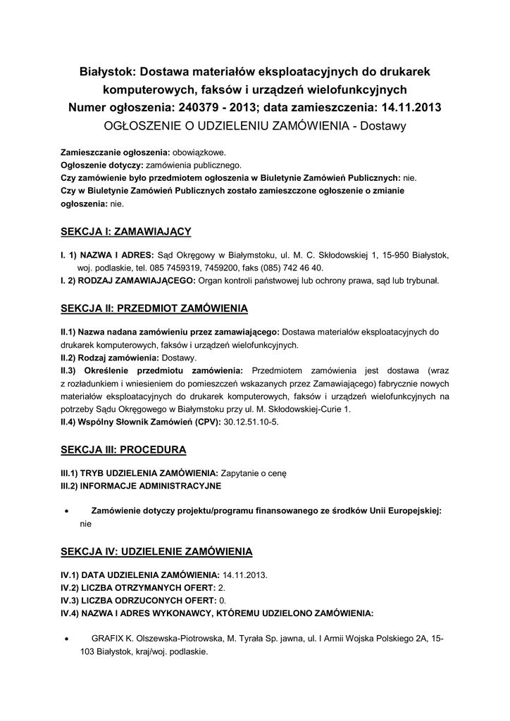 Białystok: Dostawa materiałów eksploatacyjnych do drukarek komputerowych, faksów i urządzeń wielofunkcyjnych Numer ogłoszenia: 240379 - 2013; data zamieszczenia: 14.11.2013 OGŁOSZENIE O UDZIELENIU ZAMÓWIENIA - Dostawy Zamieszczanie ogłoszenia: obowiązkowe. Ogłoszenie dotyczy: zamówienia publicznego. Czy zamówienie było przedmiotem ogłoszenia w Biuletynie Zamówień Publicznych: nie. Czy w Biuletynie Zamówień Publicznych zostało zamieszczone ogłoszenie o zmianie ogłoszenia: nie. SEKCJA I: ZAMAWIAJĄCY I. 1) NAZWA I ADRES: Sąd Okręgowy w Białymstoku, ul. M. C. Skłodowskiej 1, 15-950 Białystok, woj. podlaskie, tel. 085 7459319, 7459200, faks (085) 742 46 40. I. 2) RODZAJ ZAMAWIAJĄCEGO: Organ kontroli państwowej lub ochrony prawa, sąd lub trybunał. SEKCJA II: PRZEDMIOT ZAMÓWIENIA II.1) Nazwa nadana zamówieniu przez zamawiającego: Dostawa materiałów eksploatacyjnych do drukarek komputerowych, faksów i urządzeń wielofunkcyjnych. II.2) Rodzaj zamówienia: Dostawy. II.3) Określenie przedmiotu zamówienia: Przedmiotem zamówienia jest dostawa (wraz z rozładunkiem i wniesieniem do pomieszczeń wskazanych przez Zamawiającego) fabrycznie nowych materiałów eksploatacyjnych do drukarek komputerowych, faksów i urządzeń wielofunkcyjnych na potrzeby Sądu Okręgowego w Białymstoku przy ul. M. Skłodowskiej-Curie 1. II.4) Wspólny Słownik Zamówień (CPV): 30.12.51.10-5. SEKCJA III: PROCEDURA III.1) TRYB UDZIELENIA ZAMÓWIENIA: Zapytanie o cenę III.2) INFORMACJE ADMINISTRACYJNE Zamówienie dotyczy projektu/programu finansowanego ze środków Unii Europejskiej: nie SEKCJA IV: UDZIELENIE ZAMÓWIENIA IV.1) DATA UDZIELENIA ZAMÓWIENIA: 14.11.2013. IV.2) LICZBA OTRZYMANYCH OFERT: 2. IV.3) LICZBA ODRZUCONYCH OFERT: 0. IV.4) NAZWA I ADRES WYKONAWCY, KTÓREMU UDZIELONO ZAMÓWIENIA: GRAFIX K. Olszewska-Piotrowska, M. Tyrała Sp. jawna, ul. I Armii Wojska Polskiego 2A, 15103 Białystok, kraj/woj. podlaskie. IV.5) Szacunkowa wartość zamówienia (bez VAT): 178705,00 PLN. IV.6) INFORMACJA O CENIE WYBRANEJ OFERTY ORAZ O OFERTACH Z NAJNIŻSZĄ I NAJWYŻSZĄ CENĄ Cena wybranej oferty: 216855,00 Oferta z najniższą ceną: 216855,00 / Oferta z najwyższą ceną: 218560,22 Waluta: PLN. ZAŁĄCZNIK I Uzasadnienie udzielenia zamówienia w trybie negocjacji bez ogłoszenia, zamówienia z wolnej ręki albo zapytania o cenę 1. Podstawa prawna Postępowanie prowadzone jest w trybie zapytanie o cenę na podstawie art. 70 ustawy z dnia 29 stycznia 2004r. - Prawo zamówień publicznych. 2. Uzasadnienia wyboru trybu Należy podać uzasadnienie faktyczne i prawne wyboru trybu oraz wyjaśnić, dlaczego udzielenie zamówienia jest zgodne z przepisami. Przedmiotem zamówienia jest dostawa powszechnie dostępna o ustalonych standardach jakościowych, której wartość nie przekracza 130.000,00 euro. Dostawa materiałów eksploatacyjnych do drukarek komputerowych, faksów i urządzeń wielofunkcyjnych jest przykładem dostawy powszechnie dostępnej (na rynku krajowym i lokalnym istnieje wiele firm świadczących dostawy ww. materiałów), nie posiadającej charakteru specjalistycznego, wymagającego indywidualnego podejścia do potrzeb zamawiającego, a jej standardy jakościowe są na rynku ustalone, zarówno w zakresie parametrów technicznych dostarczanych materiałów, jak i samego sposobu dostawy. Białystok, dnia 14 listopada 2013 r. Dyrektor Sądu Okręgowego w Białymstoku Maria Grażyna Kalińska