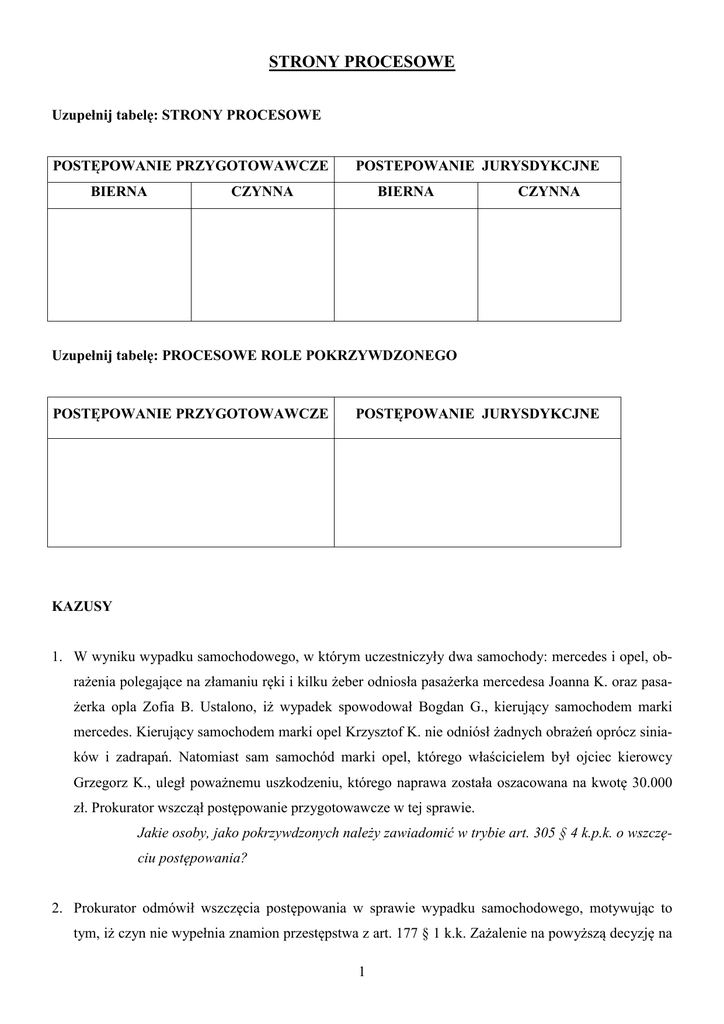 STRONY PROCESOWE Uzupełnij tabelę: STRONY PROCESOWE POSTĘPOWANIE PRZYGOTOWAWCZE BIERNA POSTEPOWANIE JURYSDYKCJNE CZYNNA BIERNA CZYNNA Uzupełnij tabelę: PROCESOWE ROLE POKRZYWDZONEGO POSTĘPOWANIE PRZYGOTOWAWCZE POSTĘPOWANIE JURYSDYKCJNE KAZUSY 1. W wyniku wypadku samochodowego, w którym uczestniczyły dwa samochody: mercedes i opel, obrażenia polegające na złamaniu ręki i kilku żeber odniosła pasażerka mercedesa Joanna K. oraz pasażerka opla Zofia B. Ustalono, iż wypadek spowodował Bogdan G., kierujący samochodem marki mercedes. Kierujący samochodem marki opel Krzysztof K. nie odniósł żadnych obrażeń oprócz siniaków i zadrapań. Natomiast sam samochód marki opel, którego właścicielem był ojciec kierowcy Grzegorz K., uległ poważnemu uszkodzeniu, którego naprawa została oszacowana na kwotę 30.000 zł. Prokurator wszczął postępowanie przygotowawcze w tej sprawie. Jakie osoby, jako pokrzywdzonych należy zawiadomić w trybie art. 305 § 4 k.p.k. o wszczęciu postępowania? 2. Prokurator odmówił wszczęcia postępowania w sprawie wypadku samochodowego, motywując to tym, iż czyn nie wypełnia znamion przestępstwa z art. 177 § 1 k.k. Zażalenie na powyższą decyzję na 1 podstawie art. 306 § 1 k.p.k. wniósł pokrzywdzony. Sąd rejonowy po jego rozpoznaniu uchylił zaskarżone postanowienie i w oparciu o art. 330 § 1 k.p.k. nakazał wszcząć postępowanie w tej sprawie. Prokurator po przeprowadzeniu postępowania postanowił jednak umorzyć postępowanie z uwagi na znikomą społeczną szkodliwość czynu. To postanowienie ponownie zaskarżył pokrzywdzony. Czy zażalenie pokrzywdzonego jest dopuszczalne? Jaki dalszy tok powinno mieć postępowanie, gdyby pokrzywdzony chciał skorzystać z uprawnienia do wniesienia aktu oskarżenia w trybie art. 55 § 1 k.p.k.? 3. Jerzy K. potrącił jadąc samochodem Piotra W. oraz Beatę M., która w wyniku odniesionych obrażeń zmarła. Prokurator rejonowy w G. dwukrotnie umorzył postępowanie przygotowawcze, w związku z czym rodzice Beaty M. na podstawie art. 55 § 1 k.p.k. wnieśli do sądu akt oskarżenia przeciwko Jerzemu K., zaś Piotr W. przystąpił do postępowania jako oskarżyciel posiłkowy uboczny na podstawie art. 55 § 3 k.p.k. W toku postępowania przed sądem I instancji rodzice Beaty M., skłonieni obietnicą wysokiego odszkodowania od Jerzego K., oświadczyli, że na podstawie art. 57 § 2 k.p.k. odstępują od oskarżenia. Natomiast Piotr W. zdecydowanie odmówił odstąpienia od oskarżenia, gdyż jak powiedział „pamięć jego dziewczyny wymaga, aby sprawca jej śmierci poniósł zasłużoną karę”. Proszę ocenić powyższą sytuację i rozstrzygnąć jaki będzie skutek odstąpienia od oskarżenia tylko rodziców Beaty M. ? 4. Podczas zebrania wiejskiego doszło do gorącej dyskusji w sprawie wyboru sołtysa. Jeden z kandydatów, Jan O. uderzył pięścią w twarz drugiego kandydata, Józefa T., czym spowodował u niego siniaki i ogólne potłuczenie, bowiem Józef T. upadł na twarde podłoże. Dochodzenie w tej sprawie wszczął funkcjonariusz gminnej komendy Policji, a następnie przedstawił Janowi O. zarzut popełnienia przestępstwa z art. 157 § 2 k.k. Jakie uchybienia zostały popełnione? 5. W sprawie z art. 212 § 2 k.k. przeciwko znanemu dziennikarzowi Wojciechowi J. zapadł wyrok skazujący. Prokurator działając na podstawie art. 60 § 1 k.p.k. wniósł od tego wyroku apelację na korzyść oskarżonego. Czy działanie prokuratora było zgodne z przepisami k.p.k.? 6. Po rozpoczęciu rozprawy głównej, a jeszcze przed odczytaniem aktu oskarżenia w sprawie Marka S. oskarżonego o przestępstwo z art. 280 § 1 k.k. pokrzywdzony Jan L. wytoczył powództwo cywilne przeciwko oskarżonemu składając pozew o zapłatę 50.000 zł tytułem odszkodowania. Sąd nie wydał żadnej decyzji w tym przedmiocie, jednak zawiadamiał Jana L. o terminach kolejnych rozpraw. Po wydaniu wyroku w sprawie, w którym sąd nie rozstrzygnął powództwa, Jan L. złożył wniosek o spo2 rządzenie i doręczenie mu uzasadnienia tego wyroku. Prezes sądu, na podstawie art. 422 § 3 k.p.k., odmówił jednak przyjęcia wniosku motywując to tym, iż Jan L. nie jest stroną procesową, gdyż po wniesieniu przez niego powództwa sąd nie wydał postanowienia o przyjęciu powództwa zgodnie z art. 65 § 2 k.p.k., tak więc Jan L. nie był nigdy powodem cywilnym. Czy Jan. L. w powyższej sprawie jest stroną procesową? 7. Józef K. podejrzany o dokonanie rozboju na Janinie T., został wezwany przez funkcjonariusza Policji prowadzącego przeciwko niemu postępowanie przygotowawcze do stawienia się na komisariacie Policji. Tam funkcjonariusz ten poinformował podejrzanego, iż w celu nagrania ma on wypowiedzieć kilka zdań, w tym m. in. zdanie o treści: „Dawaj torebkę, bo cię zatłukę tym młotkiem”, które w inkryminowanym czasie miał wypowiedzieć jako sprawca rozboju na Janinie T. Celem tego nagrania jest – kontynuował funkcjonariusz – umożliwienie rozpoznania głosu sprawcy rozboju przez pokrzywdzoną. W odpowiedzi na słowa protestu ze strony Józefa K. funkcjonariusz Policji oświadczył, iż podejrzany ma wynikający z art. 74 k.p.k. obowiązek współpracować w przeprowadzaniu tej czynności, a odmowa może spowodować wobec niego negatywne konsekwencje, z zastosowaniem tymczasowego aresztowania włącznie. W dalszym postępowaniu Józef K. został skazany za dokonanie zarzucanego mu czynu, zaś jednym z głównych dowodów, na których oparł się sąd wydając ten wyrok były wyniki okazania głosu Józefa K., który pokrzywdzona rozpoznała jako należący do sprawcy rozboju. Wyrok skazujący zaskarżył obrońca oskarżonego zarzucając mu m.in. brak podstaw prawnych do utrwalenia próby głosu oskarżonego. Proszę ocenić przedstawioną sytuację i rozstrzygnąć wskazany zarzut apelacji. 3
