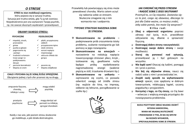 O STRESIE STRES to stan mobilizacji organizmu, który pojawia się w sytuacji trudnej. Sytuacja jest trudna wtedy, gdy Ty ją tak oceniasz. Niejednokrotnie jest ona wytworem Twojej psychiki, np. nie zawsze słusznych wyobrażeń i przewidywań. OBJAWY SILNEGO STRESU: PSYCHICZNE ü ü ü ü ü ü ü niepokój, strach, przerażenie gniew pustka w głowie pogorszenie się pamięci trudności w koncentracji uwagi i w podejmowaniu decyzji poczucie bezradności kłopoty ze snem FIZJOLOGICZNE ü ü ü ü ü ü ü płytki, przyspieszony oddech przyspieszone tętno skoki ciśnienia wzrost napięcia mięśniowego odczucie chłodu lub gorąca pocenie się kłopoty żołądkowe CIAŁO I PSYCHIKA SĄ ZE SOBĄ ŚCIŚLE SPRZĘŻONE. Obciążenie jednej z tych sfer przenosi się na drugą. zmęczenie fizyczne, choroby, infekcje i urazy mogą osłabić psychikę przeżycia psychiczne mogą obniżyć odporność na infekcje, sprzyjać chorobom Przewlekły lub powtarzający się stres może powodować choroby. Warto zatem uczyć się radzenia sobie ze stresem. Skuteczne zmaganie się z nim wzmacnia nas i uodparnia. TYPOWE STRATEGIE RADZENIA SOBIE ZE STRESEM. v Skoncentrowane na problemie – podejmowanie prób zrozumienia istoty problemu, szukanie rozwiązania go lub pomocy w jego rozwiązaniu v Skoncentrowane na emocjach – nastawienie na redukcję napięcia towarzyszącego stresowi: płacz, krzyk , izolowanie się, gwałtowne ruchy będące próbą wydatkowania nagromadzonej energii (walenie pięścią w stół, trzaskanie drzwiami itp.) v Skoncentrowane na unikaniu – zajmowanie się czymś, co pozwala odwrócić uwagę od źródła stresu (np. wyjście do kina, na imprezę, oddanie się lekturze, porządkowanie w szafie itp.) q q q q q q q q JAK CHRONIĆ SIĘ PRZED STRESEM I RADZIĆ SOBIE Z JEGO SKUTKAMI? Przemyśl to, co Cię niepokoi. Zastanów się: co to jest, czego się obawiasz, dlaczego to jest dla Ciebie ważne, co możesz zrobić, żeby sobie pomóc, kto może Cię wesprzeć? Kilka rad: Dbaj o odporność organizmu poprzez zdrowy styl życia, m.in. prawidłowe odżywianie się, dbanie o sprawność fizyczną. Dostrzegaj dobre strony rzeczywistości. Dostrzegaj swoje dobre strony i swoje możliwości. Staraj się panować nad sytuacją, przewidywać ją i być gotowym na wszystko. Nie bądź sam! Otaczaj się ludźmi, pomagaj im i proś o pomoc. Nie bój się objawów stresu, naucz się radzić sobie z nimi i przeciwdziałać im. Znajdź swój sposób na wyhamowanie emocji: spacer, czas spędzony w dobrym towarzystwie, relaksującą kąpiel, szczerą pogaduchę z przyjacielem. Korzystaj z tego, co Cię cieszy, co Cię bawi – wówczas z większą energią przystąpisz do rozwiązywania problemów. BUDUJ POZYTYWNY OBRAZ WŁASNEJ OSOBY! WYSOKA SAMOOCENA, WIARA WE WŁASNĄ SKUTECZNOŚĆ Każdy z nas wie, jaki poziom stresu skutecznie go mobilizuje, a jaki działa destrukcyjnie. I PRZEKONANIE O TYM, ŻE MA SIĘ WPŁYW NA ROZWÓJ WYDARZEŃ, SPRZYJAJĄ RADZENIU SOBIE ZE STRESEM. MATURZYSTÓW NIE ZASKAKUJE STRESOWE WYDARZENIE. MOGĄ SIĘ DO NIEGO STRES NIE JEST ANI DOBRY ANI ZŁY. TO TY NADAJESZ MU ZNACZENIE. Jeśli on Cię niszczy – jest zły, ale jeśli Ty go pokonujesz – może być dobry. PRZYGOTOWAĆ! ZASOBY NA MATURĘ: JAK SOBIE POMÓC? JAK USPOKOIĆ EMOCJE? Ø wiedza - świadomość dobrego opanowania materiału do egzaminu dodaje pewności siebie; poczucie kontroli nad sytuacją zmniejsza niepokój; Ø informacja, na czym polega egzamin (zakres materiału, formułowanie pytań, próbne matury, skład komisji egzaminacyjnej itp.) ZNAJDŹ CZAS NA KRÓTKĄ PRZERWĘ WYPUŚĆ PARĘ (ODDECH) PRZED STRESEM MOŻNA SIĘ CHRONIĆ Ø wsparcie społeczne – np. uspokajająca, choć rzeczowa postawa rodziców i nauczycieli, poczucie bycia w grupie „takich samych jak ja”. Ø świadomość tego, co można zrobić w razie niepowodzenia – możliwości poprawki, pomoc w powtórce materiału, skuteczniejsze metody uczenia się itp.; PROGRAM EDUKACYJNY DLA MATURZYSTÓW ODPRĘŻ SIĘ ROZLUŹNIJ CIAŁO RADZENIA SOBIE Z NIM MOŻNA SIĘ NAUCZYĆ. PSYCHICZNIE Aby uzyskać odprężenie psychiczne, wystarczy rozluźnić ciało. Korzystaj z technik relaksacji i odprężenia np.: trening autogenny, czy ćwiczenia oddechowe. Oprac. na podst. materiałów do programu edukacyjnego „Stres pod kontrolą” Wyd. Polskie Towarzystwo Oświaty Zdrowotnej, Warszawa 2002r. Dobrze przeżyty stres działa na Twoją korzyść.