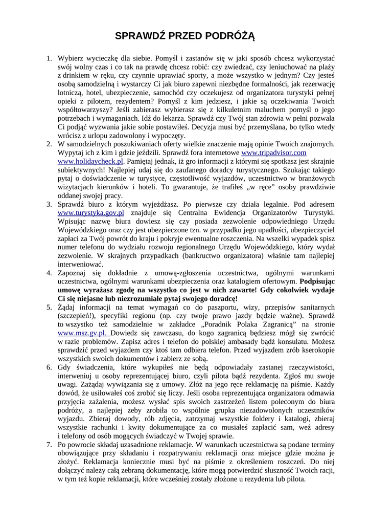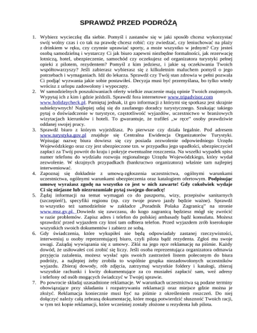 SPRAWDŹ PRZED PODRÓŻĄ 1. Wybierz wycieczkę dla siebie. Pomyśl i zastanów się w jaki sposób chcesz wykorzystać swój wolny czas i co tak na prawdę chcesz robić: czy zwiedzać, czy leniuchować na plaży z drinkiem w ręku, czy czynnie uprawiać sporty, a może wszystko w jednym? Czy jesteś osobą samodzielną i wystarczy Ci jak biuro zapewni niezbędne formalności, jak rezerwację lotniczą, hotel, ubezpieczenie, samochód czy oczekujesz od organizatora turystyki pełnej opieki z pilotem, rezydentem? Pomyśl z kim jedziesz, i jakie są oczekiwania Twoich współtowarzyszy? Jeśli zabierasz wybierasz się z kilkuletnim maluchem pomyśl o jego potrzebach i wymaganiach. Idź do lekarza. Sprawdź czy Twój stan zdrowia w pełni pozwala Ci podjąć wyzwania jakie sobie postawiłeś. Decyzja musi być przemyślana, bo tylko wtedy wrócisz z urlopu zadowolony i wypoczęty. 2. W samodzielnych poszukiwaniach oferty wielkie znaczenie mają opinie Twoich znajomych. Wypytaj ich z kim i gdzie jeździli. Sprawdź fora internetowe www.tripadvisor.com www.holidaycheck.pl. Pamiętaj jednak, iż gro informacji z którymi się spotkasz jest skrajnie subiektywnych! Najlepiej udaj się do zaufanego doradcy turystycznego. Szukając takiego pytaj o doświadczenie w turystyce, częstotliwość wyjazdów, uczestnictwo w branżowych wizytacjach kierunków i hoteli. To gwarantuje, że trafiłeś „w ręce” osoby prawdziwie oddanej swojej pracy. 3. Sprawdź biuro z którym wyjeżdżasz. Po pierwsze czy działa legalnie. Pod adresem www.turystyka.gov.pl znajduje się Centralna Ewidencja Organizatorów Turystyki. Wpisując nazwę biura dowiesz się czy posiada zezwolenie odpowiedniego Urzędu Wojewódzkiego oraz czy jest ubezpieczone tzn. w przypadku jego upadłości, ubezpieczyciel zapłaci za Twój powrót do kraju i pokryje ewentualne roszczenia. Na wszelki wypadek spisz numer telefonu do wydziału rozwoju regionalnego Urzędu Wojewódzkiego, który wydał zezwolenie. W skrajnych przypadkach (bankructwo organizatora) właśnie tam najlepiej interweniować. 4. Zapoznaj się dokładnie z umową-zgłoszenia uczestnictwa, ogólnymi warunkami uczestnictwa, ogólnymi warunkami ubezpieczenia oraz katalogiem ofertowym. Podpisując umowę wyrażasz zgodę na wszystko co jest w nich zawarte! Gdy cokolwiek wydaje Ci się niejasne lub niezrozumiałe pytaj swojego doradcę! 5. Żądaj informacji na temat wymagań co do paszportu, wizy, przepisów sanitarnych (szczepień!), specyfiki regionu (np. czy twoje prawo jazdy będzie ważne). Sprawdź to wszystko też samodzielnie w zakładce „Poradnik Polaka Zagranicą” na stronie www.msz.gv.pl. Dowiedz się zawczasu, do kogo zagranicą będziesz mógł się zwrócić w razie problemów. Zapisz adres i telefon do polskiej ambasady bądź konsulatu. Możesz sprawdzić przed wyjazdem czy ktoś tam odbiera telefon. Przed wyjazdem zrób kserokopie wszystkich swoich dokumentów i zabierz ze sobą. 6. Gdy świadczenia, które wykupiłeś nie będą odpowiadały zastanej rzeczywistości, interweniuj u osoby reprezentującej biuro, czyli pilota bądź rezydenta. Zgłoś mu swoje uwagi. Zażądaj wywiązania się z umowy. Złóż na jego ręce reklamację na piśmie. Każdy dowód, że usiłowałeś coś zrobić się liczy. Jeśli osoba reprezentująca organizatora odmawia przyjęcia zażalenia, możesz wysłać spis swoich zastrzeżeń listem poleconym do biura podróży, a najlepiej żeby zrobiła to wspólnie grupka niezadowolonych uczestników wyjazdu. Zbieraj dowody, rób zdjęcia, zatrzymaj wszystkie foldery i katalogi, zbieraj wszystkie rachunki i kwity dokumentujące za co musiałeś zapłacić sam, weź adresy i telefony od osób mogących świadczyć w Twojej sprawie. 7. Po powrocie składaj uzasadnione reklamacje. W warunkach uczestnictwa są podane terminy obowiązujące przy składaniu i rozpatrywaniu reklamacji oraz miejsce gdzie można je złożyć. Reklamacja koniecznie musi być na piśmie z określeniem roszczeń. Do niej dołączyć należy całą zebraną dokumentację, które mogą potwierdzić słuszność Twoich racji, w tym też kopie reklamacji, które wcześniej zostały złożone u rezydenta lub pilota.