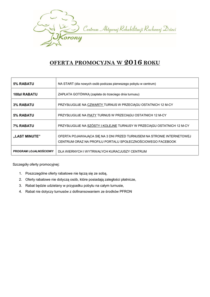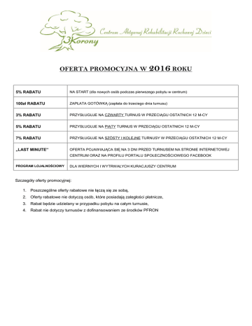 OFERTA PROMOCYJNA W 2016 ROKU 5% RABATU NA START (dla nowych osób podczas pierwszego pobytu w centrum) 100zł RABATU ZAPŁATA GOTÓWKĄ (zapłata do trzeciego dnia turnusu) 3% RABATU PRZYSŁUGUJE NA CZWARTY TURNUS W PRZECIĄGU OSTATNICH 12 M-CY 5% RABATU PRZYSŁUGUJE NA PIĄTY TURNUS W PRZECIĄGU OSTATNICH 12 M-CY 7% RABATU PRZYSŁUGUJE NA SZÓSTY I KOLEJNE TURNUSY W PRZECIĄGU OSTATNICH 12 M-CY „LAST MINUTE” OFERTA POJAWIAJĄCA SIĘ NA 3 DNI PRZED TURNUSEM NA STRONIE INTERNETOWEJ CENTRUM ORAZ NA PROFILU PORTALU SPOŁECZNOŚCIOWEGO FACEBOOK PROGRAM LOJALNOŚCIOWY DLA WIERNYCH I WYTRWAŁYCH KURACJUSZY CENTRUM Szczegóły oferty promocyjnej: 1. Poszczególne oferty rabatowe nie łączą się ze sobą, 2. Oferty rabatowe nie dotyczą osób, które posiadają zaległości płatnicze, 3. Rabat będzie udzielany w przypadku pobytu na całym turnusie, 4. Rabat nie dotyczy turnusów z dofinansowaniem ze środków PFRON
