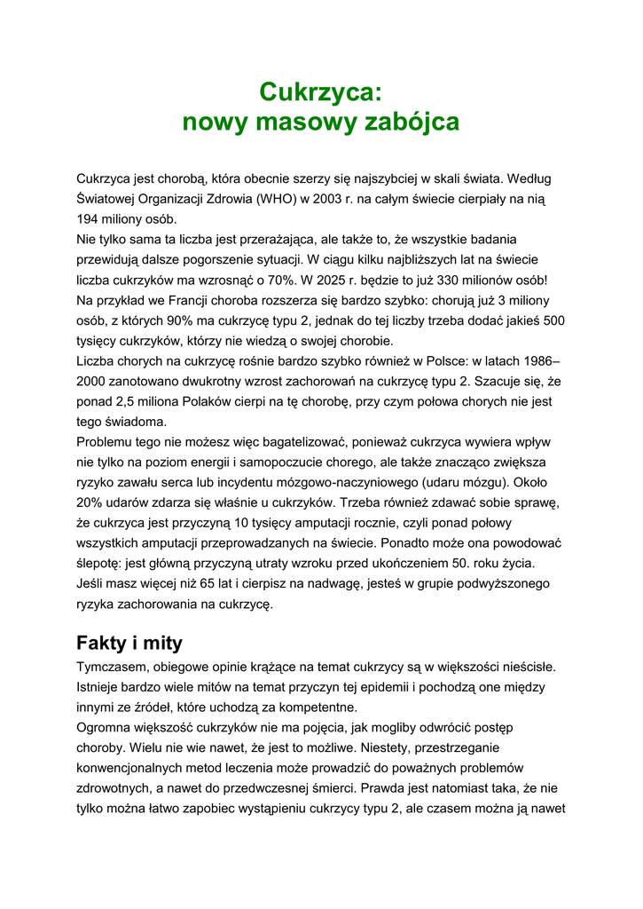 Cukrzyca: nowy masowy zabójca Cukrzyca jest chorobą, która obecnie szerzy się najszybciej w skali świata. Według Światowej Organizacji Zdrowia (WHO) w 2003 r. na całym świecie cierpiały na nią 194 miliony osób. Nie tylko sama ta liczba jest przerażająca, ale także to, że wszystkie badania przewidują dalsze pogorszenie sytuacji. W ciągu kilku najbliższych lat na świecie liczba cukrzyków ma wzrosnąć o 70%. W 2025 r. będzie to już 330 milionów osób! Na przykład we Francji choroba rozszerza się bardzo szybko: chorują już 3 miliony osób, z których 90% ma cukrzycę typu 2, jednak do tej liczby trzeba dodać jakieś 500 tysięcy cukrzyków, którzy nie wiedzą o swojej chorobie. Liczba chorych na cukrzycę rośnie bardzo szybko również w Polsce: w latach 1986– 2000 zanotowano dwukrotny wzrost zachorowań na cukrzycę typu 2. Szacuje się, że ponad 2,5 miliona Polaków cierpi na tę chorobę, przy czym połowa chorych nie jest tego świadoma. Problemu tego nie możesz więc bagatelizować, ponieważ cukrzyca wywiera wpływ nie tylko na poziom energii i samopoczucie chorego, ale także znacząco zwiększa ryzyko zawału serca lub incydentu mózgowo-naczyniowego (udaru mózgu). Około 20% udarów zdarza się właśnie u cukrzyków. Trzeba również zdawać sobie sprawę, że cukrzyca jest przyczyną 10 tysięcy amputacji rocznie, czyli ponad połowy wszystkich amputacji przeprowadzanych na świecie. Ponadto może ona powodować ślepotę: jest główną przyczyną utraty wzroku przed ukończeniem 50. roku życia. Jeśli masz więcej niż 65 lat i cierpisz na nadwagę, jesteś w grupie podwyższonego ryzyka zachorowania na cukrzycę. Fakty i mity Tymczasem, obiegowe opinie krążące na temat cukrzycy są w większości nieścisłe. Istnieje bardzo wiele mitów na temat przyczyn tej epidemii i pochodzą one między innymi ze źródeł, które uchodzą za kompetentne. Ogromna większość cukrzyków nie ma pojęcia, jak mogliby odwrócić postęp choroby. Wielu nie wie nawet, że jest to możliwe. Niestety, przestrzeganie konwencjonalnych metod leczenia może prowadzić do poważnych problemów zdrowotnych, a nawet do przedwczesnej śmierci. Prawda jest natomiast taka, że nie tylko można łatwo zapobiec wystąpieniu cukrzycy typu 2, ale czasem można ją nawet całkowicie wyleczyć, jednak pod warunkiem konsekwentnego przeprowadzania kilku zmian w trybie życia. Przypadek cukrzycy typu 1 W przypadku cukrzycy typu 1, która jest chorobą rzadką – dotyka jedną na dwieście pięćdziesiąt osób i najczęściej zaczyna się przed 20. rokiem życia – nasz własny układ odpornościowy niszczy wytwarzające insulinę komórki trzustki, co skutkuje niedoborem insuliny w organizmie. Jest to choroba nieuleczalna. W przeciwieństwie do cukrzycy typu 2, która jest insulinoniezależna, typ 1 określa się mianem cukrzycy insulinozależnej, ponieważ jedynym wyjściem dla chorych jest wstrzykiwanie sobie insuliny. Jednak nawet dla chorych na ten rodzaj cukrzycy być może pojawia się szansa na skuteczne leczenie. Chodzi o eksperyment przeprowadzony z powodzeniem na myszach. Lekarze ze szpitala Massachusetts General Hospital (Boston, USA) przez czterdzieści dni poddawali myszy leczeniu, dzięki któremu ich układ odpornościowy przestał atakować komórki trzustki wytwarzające insulinę. Zaczęli od wstrzyknięcia substancji odpowiedzialnej za usunięcie dysfunkcyjnych czynników z układu odpornościowego. Następnie wprowadzili do niego nowe komórki, których celem miało być ponowne wyedukowanie układu, by nie niszczył komórek trzustki. Badacze ze zdziwieniem stwierdzili, że liczba komórek wytwarzających insulinę u dotkniętych cukrzycą myszy znów zaczęła rosnąć. Ten nieoczekiwany przyrost komórek trzustki przywrócił u myszy normalny poziom cukru we krwi bez konieczności wstrzykiwania insuliny. Co więcej – efekt ten w większości przypadków okazał się trwały: u 75% myszy dobry stan zdrowia utrzymał się przynajmniej przez sto dni, bez konieczności stosowania innych terapii, jak podkreślają autorzy badania w lipcowym wydaniu Journal of Clinical Investigation. Wróćmy jednak do naszego tematu – częściej występującej cukrzycy typu 2: Cukrzyca typu 2 i błędy, których można uniknąć Cukrzycy typu 2 mogą towarzyszyć następujące objawy: – pragnienie, – ciągły głód (nawet tuż po posiłku), – zmęczenie, – drażliwość, – nudności, wymioty, – znaczący przyrost lub znacząca utrata wagi, – infekcje, – problemy z gojeniem się ran, – drętwienie, zmniejszenie się wrażliwości dłoni i stóp, – zaburzenia widzenia. Lekarz z pewnością przepisze Ci na to leki, jednak musisz wiedzieć, że niektóre z nich, sztucznie podwyższając poziom insuliny, powodują również odkładanie się w organizmie złych tłuszczów, co może znacząco zwiększyć zagrożenie chorobami układu krążenia. Na przykład stosowaniu leku przeciwcukrzycowego o nazwie rozyglitazon (Avandia – lek wycofany ze sprzedaży w Europie w 2010 roku) przypisuje się odpowiedzialność za śmierć kilkudziesięciu tysięcy osób w Stanach Zjednoczonych. Ponieważ nigdy i pod żadnym pozorem nie należy przerywać terapii zaleconej przez lekarza bez porozumienia z nim, mimo wszystko nie odstawiaj przepisanego Ci leku. Jeśli jednak naprawdę chcesz się rozprawić z przyczynami cukrzycy typu 2, powinieneś zapoznać się z naturalnymi metodami stabilizowania poziomu cukru we krwi i przywracania normalnej wrażliwości na insulinę. Jest to tak ważny temat, że zdecydowałem się poświęcić mu cały raport z nowego cyklu Dossier Naturalnych Terapii. Co więcej, przekazuję go w prezencie wszystkim nowym Prenumeratorom Dossier Naturalnych Terapii (podobnie jak raport poświęcony cholesterolowi, opowiadający o jednej z największych mistyfikacji współczesnej medycyny). Raport ten, zatytułowany Jak zwalczyć cukrzycę odpow