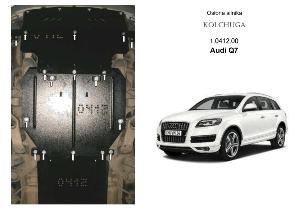 Osłona silnika Kolchuga 1.0412.00 Audi Q7 Montaż osłony Osłona 1.0412.00 Stosowanie: Audi Q7 4.2 quattro Kompletność: L.p. Oznaczenie Ilość 1022 463 1020 242 251 М8х25 М10х25 А8 А10 СТП.8.006.015 СТП.8.006.015 z uchwytem 521.6.013.002 М8 1 1 1 1 1 9 6 11 8 4 2 2 2 2 Nazwa Płyta Płyta Płyta Wspornik Belka Śruba Śruba Podkładka Podkładka Listwa Listwa Mocowane Nakrętka Amortyzator 30 1 2 3 4 5 6 7 8 9 10 11 12 13 14 Uwagi Schemat montażu osłony 4 7 9 10 1 14 2 8 9 12 13 3 4 6 8 6 8 7 9 10 6 8 Rys.1 7 9 11 1. Zdemontować osłonę plastikową. 2. Odkręcić 4 zwykłe śruby mocowania belki chłodnicy i zamocować pod nie wspornik 4. 3. Wprowadzić mocowanie 12 w tylne boczne otwory ramy pomocniczej samochodu i zamocować belkę 5 nakrętkami 13 przez podkładki 8 i 9, rys.2. 4. Wprowadzić listwy 10 w otwory ramy podsilnikowej i zamocować płytę 2 śrubami 7, od tylnej strony do belki 5 śrubami 6, rys.1 5. Wprowadzić płytę 1 od tylnej strony wpustami pod śruby 6, włożone do płyty 2, od przodu przymocować do wspornika 4 śrubami 6, rys.2. 6. Wprowadzić listwy 11 nad otworami tylnej okrągłej poprzecznej belki, włożyć śruby 7 i zamocować płytę 3 od przodu pod płytę 2, od tylnej strony pod śruby 7. 7. Dokręcić wszystkie miejsca mocowania. Osłona zakrywa silnik, skrzynię biegów, chłodnicę.