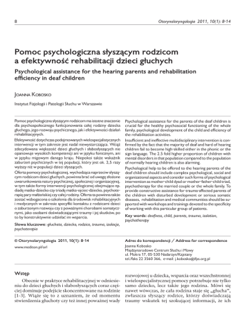 Otorynolaryngologia 2011, 10(1): 8-14 Pomoc psychologiczna słyszącym rodzicom a efektywność rehabilitacji dzieci głuchych Psychological assistance for the hearing parents and rehabilitation efficiency in deaf children Joanna Kobosko Instytut Fizjologii i Patologii Słuchu w Warszawie Pomoc psychologiczna słyszącym rodzicom ma istotne znaczenie dla psychospołecznego funkcjonowania całej rodziny dziecka głuchego, jego rozwoju psychicznego, jak i efektywności działań rehabilitacyjnych. Efektywność dotychczas podejmowanych wielospecjalistycznych interwencji w tym zakresie jest nadal niewystarczająca. Wciąż zdecydowana większość dzieci głuchych i słabosłyszących nie opanowuje wysokich kompetencji ani w języku fonicznym, ani w języku migowym danego kraju. Niepokoi także wskaźnik zaburzeń psychicznych w tej populacji, który jest ok. 2,5 razy wyższy niż w populacji dzieci słyszących. Oferta pomocy psychologicznej, wychodząca naprzeciw słyszącym rodzicom dzieci głuchych, powinna brać od uwagę złożone uwarunkowania natury psychicznej, społecznej i organizacyjnej, w tym także formy interwencji psychologicznej obejmujące np. diadę matka-dziecko czy triadę matka-ojciec-dziecko, psychoterapię pary małżeńskiej czy całej rodziny. Oferta ta powinna także zostać wzbogacona o szkolenia dla środowisk rehabilitacyjnych i medycznych w zakresie specyfiki kontaktu z rodzicami dzieci o zaburzonym rozwoju czy z poważnymi chorobami somatycznymi, jako osobami doświadczającymi traumy i jej skutków, po to by konstruktywnie udzielać im wsparcia. Słowa kluczowe: głuchota, dziecko, rodzice, trauma, izolacja, psychoterapia Psychological assistance for the parents of the deaf children is crucial for the healthy psychosocial functioning of the whole family, psychological development of the child and efficiency of the rehabilitation activities. Insufficient and ineffective multidisciplinary intervention is confirmed by the fact that the majority of deaf and hard of hearing children fail to become high-skilled either in the phonic or the sign language. The 2.5 fold higher proportion of children with mental disorders in that population compared to the population of normally hearing children is also alarming. Psychological help to be offered to the hearing parents of the deaf children should include complex psychological, social and organizational aspects and consider such forms of psychological intervention as mother-child dyad or mother-father-child triad, psychotherapy for the married couple or the whole family. To provide constructive assistance for trauma-affected parents of the children with disturbed development or serious somatic diseases, rehabilitation and medical communities should be supported with workshops and trainings devoted to the specificity of working with this particular group of patients. Key words: deafness, child, parents, trauma, isolation, psychotherapy © Otorynolaryngologia 2011, 10(1): 8-14 Adres do korespondencji / Address for correspondence www.mediton.pl/orl Joanna Kobosko Międzynarodowe Centrum Słuchu i Mowy ul. Mokra 17, 05-530 Nadarzyn/Kajetany tel./faks 22 3560 366, e-mail: [email protected] Wstęp Obecnie w praktyce rehabilitacyjnej w odniesieniu do dzieci głuchych i słabosłyszących coraz częściej dominuje podejście skoncentrowane na rodzinie [1-3]. Wiąże się to z uznaniem, że od momentu stwierdzenia głuchoty czy też innej poważnej wady rozwojowej u dziecka, wsparcia oraz wszechstronnej i wielospecjalistycznej pomocy potrzebuje nie tylko samo dziecko, lecz także jego rodzina. Mówi się nawet wówczas, że cała rodzina staje się „głucha”, zwłaszcza słyszący rodzice, którzy doświadczają traumy wskutek tej szokującej informacji, że ich Kobosko J. Pomoc psychologiczna słyszącym rodzicom a efektywność rehabilitacji dzieci głuchych dziecko nie słyszy. Z perspektywy psychologicznej od powodzenia rodziców w adaptacji do niepełnosprawności dziecka w większości zależy skuteczność podejmowanych działań rehabilitacyjnych i stwarzane przez nich warunki rozwoju dziecka. Efektywność rehabilitacji pozostaje bowiem w związku z trudnościami, jakich doświadczają matki i ojcowie w procesie stawania się rodzicami swoich niepełnosprawnych dzieci [4-5]. W coraz bogatszej specjalistycznej ofercie dla słyszących rodziców dziecka głuchego, zawierającej zdobycze audiologii i inżynierii biomedycznej, różnych szkół terapii mowy i języka (logopedia), możliwości diagnozy i terapii psychologicznej i pedagogicznej itp. – pomoc psychologiczna, pomimo jej priorytetowego znaczenia, pozostaje wciąż „w tle” tej oferty. Jej różne formy – profesjonalne i nieprofesjonalne, m.in. grupy wsparcia dla rodziców dzieci z wadą słuchu [6], nie znajdują wciąż należytego docenienia i rozpropagowania w środowiskach medycznych i rehabilitacyjnych, a sami rodzice dość rzadko zwracają się po tę pomoc dla siebie czy całej rodziny. Artykuł stanowi próbę odpowiedzi na pytanie, dlaczego, patrząc z perspektywy rodziców, a także specjalistów zaangażowanych w rehabilitację dziecka głuchego i jego rodziny, w tym psychologów klinicznych i psychoterapeutów, ograniczona jest dostępność różnych form pomocy psychologicznej. Przedstawiono też propozycje działań, służących temu, by zwiększyć otwartość wszystkich zainteresowanych wobec możliwości, jakie niesie z sobą szeroko rozumiana pomoc psychologiczna, a następnie zastosować je w praktyce. Dlaczego słyszącym rodzicom dziecka głuchego – z perspektywy psychologów klinicznych i psychoterapeutów – potrzebna jest pomoc psychologiczna? Odpowiedzi na to pytanie poszukiwać można w trzech obszarach obejmujących: 1. stan psychiczny słyszących rodziców dziecka głuchego po uzyskaniu informacji o jego głuchocie (niedosłuchu), 2. rozpowszechnienie zaburzeń psychicznych w populacji dzieci i młodzieży głuchej i s