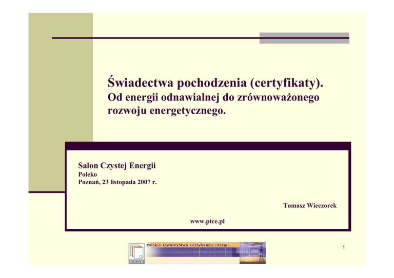 Świadectwa pochodzenia (certyfikaty). Od energii odnawialnej do zrównowaŜonego rozwoju energetycznego. Salon Czystej Energii Poleko Poznań, 23 listopada 2007 r. Tomasz Wieczorek www.ptce.pl 1 Kontekst europejski Promowanie konkurencji versus wzmacnianie się podmiotów (fuzje, akwizycje, przejęcia) Rozczarowanie efektami liberalizacji Kłopoty z nowymi inwestycjami Nowe spojrzenie na kwestię bezpieczeństwa energetycznego – dywersyfikacja paliw Presja na efektywność energetyczną Ekologia 2 Nowe inicjatywy w Unii Dyrektywa i plan działań dotyczących efektywności energetycznej Zielona księga dotycząca nowej strategii wobec problemów energetycznych – konkurencyjna, bezpieczna i zrównowaŜona energia Rada Europy (marzec 2007 r.) – Pakiet energetyczny „3x20” Ownership unbundling Europejska karta energetyczna? Solidarność energetyczna? 3 Kontekst krajowy Rozpoczęty i wstrzymany proces prywatyzacji Kontynuowany proces konsolidacji Niezrealizowane zapowiedzi istotnej zmiany Prawa energetycznego: moŜliwe zmiany zasad konkurowania i roli URE Wydzielenie OSD – róŜne modele Konieczność skutecznego(!) wdroŜenia zasady TPA Awantura z uwolnieniem cen detalicznych 4 Uwarunkowania krajowe Spodziewany wzrost konsumpcji energii, zwłaszcza energii elektrycznej Brak wystarczającego, wyprzedzającego przyrostu źródeł wytwórczych Niedostatecznie rozwinięta infrastruktura przesyłowa i dystrybucyjna Nadmierna energochłonność polskiej gospodarki 5 Koszty środowiskowe Problem wyznaczenia ceny energii Czy zielona energia jest droga? Za co płaci klient, za co podatnik? Opłaty środowiskowe Podatki Limity emisji (CO2, SO2, NOx) Kontyngenty (zielone, czerwone, inne) Ile poŜyczamy od wnuków? 6 Rola certyfikatów Samoistny „papier wartościowy” Określanie kwoty (ilości) certyfikatów – sterowanie wykonaniem celów (zobowiązań krajowych) Systemy wymuszonego popytu - istnienie zobligowanych i uprawnionych – sterowanie podaŜą i popytem Certyfikaty w energetyce Ekwiwalent kosztów zewnętrznych – środowiskowych Wprowadzenie mechanizmów rynkowych wewnątrz obszarów objętych systemami wsparcia Zwiększenie wolumenu energii „czarnej” podlegającej mechanizmom rynkowym 7 Zielone certyfikaty Przedsiębiorstwo energetyczne zajmujące się wytwarzaniem energii elektrycznej lub jej obrotem i sprzedające tę energię odbiorcom końcowym, przyłączonym do sieci na terytorium RP jest obowiązane, w zakresie określonym w przepisach wydanych na podstawie ust. 9: 1) uzyskać i przedstawić do umorzenia Prezesowi Urzędu Regulacji Energetyki świadectwo pochodzenia, o którym mowa w art. 9e ust. 1, albo 2) uiścić opłatę zastępczą, obliczoną w sposób określony w ust. 2. 8 Zielone certyfikaty - zakup energii Sprzedawca z urzędu jest obowiązany, w zakresie określonym w przepisach wydanych na podstawie ust. 9, do zakupu energii elektrycznej wytworzonej w odnawialnych źródłach energii przyłączonych do sieci znajdujących się w obszarze działania sprzedawcy z urzędu, oferowanej przez przedsiębiorstwa energetyczne, które uzyskały koncesje na jej wytwarzanie; zakup ten odbywa się po średniej cenie sprzedaŜy energii elektrycznej w poprzednim roku kalendarzowym, o której mowa w art. 23 ust. 2 pkt 18 lit. b. 9 Zielone certyfikaty - ocena System funkcjonuje sprawnie Większość wolumenu obrotów – transakcje dwustronne (roczne, kilkuletnie) Budowa nowych źródeł – konieczne wieloletnie kontrakty inwestycyjne Spodziewany wzrost wolumenu opłat zastępczych za 2007 r. 10 Zielone certyfikaty – zmiana kwot obligacji 11 Polski udział w europejskich 20% Negocjacje Propozycja +13% (tj. ok. 18%) Korekta PKB Transfery międzynarodowe Zainteresowanie ciepłem – analogia do rozwiązań stosowanych w elektroenergetyce 12 Bariery w rozwoju energetyki odnawialnej Brak moŜliwości podłączenia do sieci większych źródeł (farm wiatrowych) – słabo rozwinięta infrastruktura energetyczna, zwłaszcza na północy kraju Przestarzałe i niezbyt transparentne procedury wydawania warunków technicznych przyłączenia (np. brak dostępu do informacji o wydanych i realizowanych przyłączeniach) Rozwiązaniem kompromisowym - przeznaczenie środków z opłaty zastępczej na rozwój sieci niezbędnej do wzrostu nowych mocy Innym rozwiązaniem - moŜliwość odroczenia płatności opłaty zastępczej po podpisaniu kontraktu inwestycyjnego lub rozpoczęciu inwestycji 13 Czerwone (i Ŝółte?) certyfikaty Przedsiębiorstwo energetyczne zajmujące się wytwarzaniem energii elektrycznej lub jej obrotem i sprzedające tę energię odbiorcom końcowym przyłączonym do sieci na terytorium RP jest obowiązane, w zakresie określonym w przepisach wydanych na podstawie ust. 10: 1) uzyskać i przedstawić do umorzenia Prezesowi URE świadectwa pochodzenia z kogeneracji, o których mowa w art. 9 l ust. 1, dla energii elektrycznej wytworzonej w jednostkach kogeneracji znajdujących się na terytorium Rzeczypospolitej Polskiej, albo 2) uiścić opłatę zastępczą obliczoną w sposób określony w ust. 8a. 14 Obowiązki ilościowe dla świadectw pochodzenia z kogeneracji Udział ilościowy sumy energii elektrycznej wynikającej z uzyskanych i umorzonych praw majątkowych lub z uiszczonej opłaty zastępczej wynosi nie mniej niŜ: Dla jednostek kogeneracji opalanych paliwami gazowymi lub o łącznej mocy zainstalowanej elektrycznej źródła poniŜej 1 MW: 2,5 % w 2007 r. 2,6 % w 2008 r. 2,8 % w 2009 r. 3,0 % w 2010 r. 3,5 % w 2011 r. Dla pozostałych jednostek kogeneracji: 16,5 % w 2007 r. 17,0 % w 2008 r. 17,5 % w 2009 r. 19,0 % w 2010 r. 19,5 % w 2011 r. 15 Opłaty zastępcze Prezes URE ogłasza w Biuletynie Urzędu Regulacji Energetyki jednostkowe opłaty zastępcze do dnia 31 maja kaŜdego roku, obowiązujące w roku następnym Dla świadectw pochodzenia dla energii elektr. wyprodukowanej w jednostkach kogeneracji opalanych paliwami gazowymi lub o łącznej mo