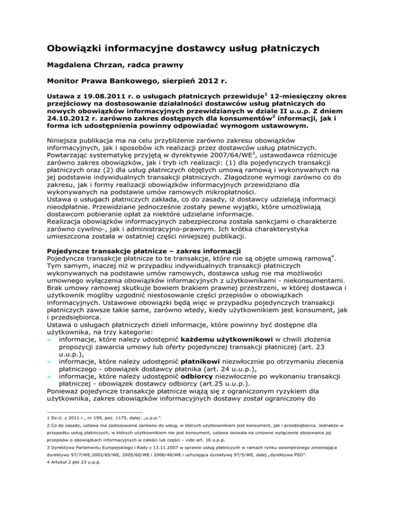 Obowiązki informacyjne dostawcy usług płatniczych Magdalena Chrzan, radca prawny Monitor Prawa Bankowego, sierpień 2012 r. Ustawa z 19.08.2011 r. o usługach płatniczych przewiduje1 12-miesięczny okres przejściowy na dostosowanie działalności dostawców usług płatniczych do nowych obowiązków informacyjnych przewidzianych w dziale II u.u.p. Z dniem 24.10.2012 r. zarówno zakres dostępnych dla konsumentów2 informacji, jak i forma ich udostępnienia powinny odpowiadać wymogom ustawowym. Niniejsza publikacja ma na celu przybliżenie zarówno zakresu obowiązków informacyjnych, jak i sposobów ich realizacji przez dostawców usług płatniczych. Powtarzając systematykę przyjętą w dyrektywie 2007/64/WE3, ustawodawca różnicuje zarówno zakres obowiązków, jak i tryb ich realizacji: (1) dla pojedynczych transakcji płatniczych oraz (2) dla usług płatniczych objętych umową ramową i wykonywanych na jej podstawie indywidualnych transakcji płatniczych. Złagodzone wymogi zarówno co do zakresu, jak i formy realizacji obowiązków informacyjnych przewidziano dla wykonywanych na podstawie umów ramowych mikropłatności. Ustawa o usługach płatniczych zakłada, co do zasady, iż dostawcy udzielają informacji nieodpłatnie. Przewidziane jednocześnie zostały pewne wyjątki, które umożliwiają dostawcom pobieranie opłat za niektóre udzielane informacje. Realizacja obowiązków informacyjnych zabezpieczona została sankcjami o charakterze zarówno cywilno-, jak i administracyjno-prawnym. Ich krótka charakterystyka umieszczona została w ostatniej części niniejszej publikacji. Pojedyncze transakcje płatnicze – zakres informacji Pojedyncze transakcje płatnicze to te transakcje, które nie są objęte umową ramową4. Tym samym, inaczej niż w przypadku indywidualnych transakcji płatniczych wykonywanych na podstawie umów ramowych, dostawca usług nie ma możliwości umownego wyłączenia obowiązków informacyjnych z użytkownikami - niekonsumentami. Brak umowy ramowej skutkuje bowiem brakiem prawnej przestrzeni, w której dostawca i użytkownik mogliby uzgodnić niestosowanie części przepisów o obowiązkach informacyjnych. Ustawowe obowiązki będą więc w przypadku pojedynczych transakcji płatniczych zawsze takie same, zarówno wtedy, kiedy użytkownikiem jest konsument, jak i przedsiębiorca. Ustawa o usługach płatniczych dzieli informacje, które powinny być dostępne dla użytkownika, na trzy kategorie: • informacje, które należy udostępnić każdemu użytkownikowi w chwili złożenia propozycji zawarcia umowy lub oferty pojedynczej transakcji płatniczej (art. 23 u.u.p.), • informacje, które należy udostępnić płatnikowi niezwłocznie po otrzymaniu zlecenia płatniczego - obowiązek dostawcy płatnika (art. 24 u.u.p.), • informacje, które należy udostępnić odbiorcy niezwłocznie po wykonaniu transakcji płatniczej - obowiązek dostawcy odbiorcy (art.25 u.u.p.). Ponieważ pojedyncze transakcje płatnicze wiążą się z ograniczonym ryzykiem dla użytkownika, zakres obowiązków informacyjnych dostawy został ograniczony do 1 Dz.U. z 2011 r., nr 199, poz. 1175, dalej: „u.p.p.”. 2 Co do zasady, ustawa ma zastosowanie zarówno do usług, w których użytkownikiem jest konsument, jak i przedsiębiorca. Jednakże w przypadku usług płatniczych, w których użytkownikiem nie jest konsument, ustawa zezwala na umowne wyłączenie stosowania jej przepisów o obowiązkach informacyjnych w całości lub części – vide art. 16 u.p.p. 3 Dyrektywa Parlamentu Europejskiego i Rady z 13.11.2007 w sprawie usług płatniczych w ramach rynku wewnętrznego zmieniająca dyrektywy 97/7/WE,2002/65/WE, 2005/60/WE i 2006/48/WE i uchylająca dyrektywę 97/5/WE, dalej „dyrektywa PSD”. 4 Artykuł 2 pkt 23 u.p.p. niezbędnego minimum. Do tego minimum ustawodawca zalicza udostępnienie użytkownikowi: • informacji o tym, jakie dane są niezbędne do wykonania przez dostawcę zlecenia płatniczego, • informacji o maksymalnym czasie wykonania świadczonej usługi płatniczej5 oraz • informacji o opłatach i kursach walutowych (jeśli będą stosowane). Informacje te powinny zostać udostępnione w chwili złożenia propozycji zawarcia umowy lub oferty pojedynczej transakcji płatniczej, chyba że pojedyncza transakcja płatnicza jest inicjowana przez płatnika korzystającego ze środków porozumiewania się na odległość, niepozwalających dostawcy wykonać tego obowiązku (np. telefonicznie6). W takim przypadku dostawca wykonuje ten obowiązek niezwłocznie po wykonaniu transakcji płatniczej. Ponadto, w przypadku dostawcy płatnika powinien on niezwłocznie po otrzymaniu zlecenia płatniczego udostępnić płatnikowi informacje: • umożliwiające mu zidentyfikowanie transakcji płatniczej oraz odbiorcy; • o kwocie transakcji płatniczej w walucie użytej w zleceniu płatniczym; • o wszelkich opłatach należnych od płatnika z tytułu transakcji płatniczej, z wyszczególnieniem kwot tych opłat; • o kursie walutowym zastosowanym w danej transakcji płatniczej przez dostawcę płatnika oraz o kwocie transakcji płatniczej po przeliczeniu walut, jeżeli transakcja płatnicza wiązała się z przeliczeniem waluty; • o dacie otrzymania zlecenia płatniczego. Co do obowiązków dostawcy odbiorcy, to powinien on udostępnić odbiorcy informacje: • umożliwiające odbiorcy zidentyfikowanie transakcji płatniczej, i w stosownych przypadkach7, płatnika, oraz wszelkie inne informacje przekazane odbiorcy w związku z wykonaniem transakcji płatniczej; • o kwocie transakcji płatniczej w walucie, w której środki pieniężne są udostępniane odbiorcy; • o wszelkich opłatach należnych odbiorcy z tytułu transakcji płatniczej i w stosownych przypadkach wyszczególnienie kwot takich opłat; • o kursie walutowym zastosowanym w danej transakcji płatniczej przez dostawcę odbiorcy oraz o kwocie transakcji płatniczej przed przeliczen