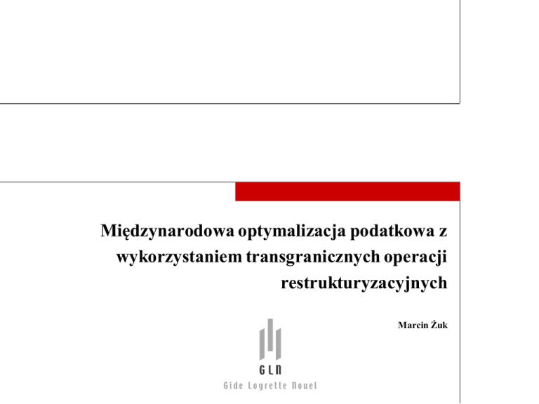 Międzynarodowa optymalizacja podatkowa z wykorzystaniem transgranicznych operacji restrukturyzacyjnych Marcin Żuk Źródła prawa Dyrektywa Rady 90/434/EWG z dnia 23 lipca 1990 r. – w sprawie wspólnego systemu opodatkowania mającego zastosowanie w przypadku łączenia, podziałów, wydzieleń, wnoszenia aktywów i wymiany udziałów dotyczących spółek różnych Państw Członkowskich oraz przeniesienia statutowej siedziby SE lub SCE pomiędzy Państwami Członkowskimi (Dz. U. UE L z dnia 20 sierpnia 1990 r., Dz.U.UE.L.90.225.1, dalej zwana: „Dyrektywą Merger”); Dyrektywa Rady 2006/112/WE z dnia 28 listopada 2006 r. – w sprawie wspólnego systemu podatku od wartości dodanej (Dz. U. UE L z dnia 11 grudnia 2006 r., dalej zwana: „Dyrektywą o VAT”); Dyrektywa Rady 2008/7/WE z dnia 12 lutego 2008 r. dotycząca podatków pośrednich od gromadzenia kapitału (Dz. Urz. UE L 046 z 21 lutego 2008r., dalej jako: „Dyrektywa Kapitałowa”); Ustawa z dnia 15 lutego 1992 roku – o podatku dochodowym od osób prawnych (tekst jednolity, Dz. U. z 2000 roku, Nr 54, poz. 654, ze zmianami, dalej jako „Ustawa o CIT”); Ustawa z dnia 11 marca 2004 roku – o podatku od towarów i usług (Dz. U. z dnia 5 kwietnia 2004 roku, Nr 54, poz. 535, ze zmianami, dalej jako „Ustawa o VAT”); Ustawa z dnia 9 września 2000 roku – o podatku od czynności cywilnoprawnych (tekst jednolity, Dz. U. z 2005 roku, Nr 41, poz. 399, ze zmianami, dalej jako „Ustawa o PCC”); Zakres prezentacji Przepisy polskiego prawa podatkowego w ślad za Dyrektywą Merger przewidują neutralność podatkową następujących operacji restrukturyzacyjnych (dalej jako: „Transakcje”): Połączeń; Podziałów; Transferu aktywów; Wymiany udziałów. Przedmiotem prezentacji jest przedstawienie, w jaki sposób w praktyce można wykorzystać Transakcje w międzynarodowej optymalizacji podatkowej. CASE STUDY 1 Optymalizacja podatkowa z wykorzystaniem transgranicznego łączenia się spółek (cross-border merger) Sytuacja przed restrukturyzacją – opis przypadku Podatnik, osoba fizyczna będąca rezydentem podatkowym w Polsce, założył w 1995 r. spółkę z ograniczoną odpowiedzialnością („POL Sub”) w celu prowadzenia za jej pośrednictwem w Polsce działalności produkcyjnej; 100% udziałów w POL Sub zostało objętych w zamian za wkład gotówkowy w wysokości 100.000 zł; Po latach rozwijania działalności w POL Sub wartość rynkowa 100% udziałów w niej jest wyceniana na ok. 100.000.000 zł; Obecnie podatnik rozważa wyjście z inwestycji, jednak analizując skutki podatkowe zwykłego sprzedania udziałów dochodzi do wniosku, że musi zapłacić podatek PIT w wysokości 19% od dochodu stanowiącego różnicę pomiędzy wydatkami na objęcie udziałów w POL Sub (100.000 zł) a ceną uzyskaną z tytułu sprzedaży udziałów (ok. 100.000.000 zł), czyli ok. 18.981.000 zł. Sytuacja przed restrukturyzacją - struktura POLSKA 100 % POL Sub Etap I: Podatnik zakłada spółkę specjalnego przeznaczenia będącą rezydentem podatkowym na Cyprze („CYP Sub”), w której posiada 100% udziałów; PRZED POLSKA CYPR 100 % 100 % POL Sub CYP Sub Etap I: Koszty utworzenia i utrzymania spółki cypryjskiej Rejestracja spółki opłaty Utworzenie spółki dla spółki o kapitale zakładowym w wysokości do 8.750 EUR, włączając w to pełen zestaw dokumentów spółki (po grecku lub angielsku), opłaty administracyjne i rejestracyjne oraz pieczęć spółki „Gotowa spółka” Minimalne roczne opłaty wynoszą odpowiednio: Zapewnienie siedziby Spółki Zapewnienie sekretarza Spółki Zapewnienie Dyrektora Spółki Księgowość Stawki wynagrodzenia za godzinę pracy EUR 3.000 EUR 3.600 EUR 250 EUR 250 EUR 750 EUR 1000 EUR 65 – 200 Etap II: CYP Sub dokonuje transgranicznego przejęcia POL Sub PO POLSKA CYPR 100 % CYP Sub PERMANENT ESTABLISHMENT Etap II: Skutki podatkowe dla stron transakcji Dla spółki CYP Sub: wartość otrzymanego majątku w postaci zakładu (PE) nie stanowi przychodu podatkowego w Polsce zgodnie z zasadą, że do przychodów nie zalicza się przychodów otrzymanych m.in. na utworzenie lub powiększenie kapitału zakładowego (art. 12 ust. 4 punkt 4 Ustawy o CIT); stawki i metody amortyzacji podatkowej podlegają kontynuacji zgodnie z zasadą kontynuacji amortyzacji podatkowej (art. 16g ust. 9 Ustawy o CIT); nadwyżka wartości otrzymanego przez spółkę CYP Sub majątku spółki POL Sub ponad nominalną wartość udziałów przyznanych Podatnikowi nie stanowi dochodu z udziału w zyskach osób prawnych (art. 10 ust. 2 pkt 1 Ustawy o CIT); Spółka CYP Sub nie ma prawa rozliczenia ewentualnych strat podatkowych spółki POL Sub (art.. 7 ust. 2 Ustawy o CIT); operacja pozostaje poza zakresem Ustawy o VAT, gdyż zgodnie z jej art. 6 przepisów ustawy nie stosuje się do transakcji zbycia przedsiębiorstwa lub zakładu (oddziału) samodzielnie sporządzającego bilans; zgodnie z zasadą sukcesji podatkowej ogólnej CYP Sub wstępuje we wszystkie prawa i obowiązki spółki POL Sub, w tym w prawa i obowiązki w zakresie VAT; brak PCC w Polsce. Dla Podatnika: dochód Podatnika stanowiący nadwyżkę pomiędzy wartością nominalną udziałów przydzielonych przez spółkę CYP Sub a wydatkami na objęcie udziałów w spółce POL Sub nie podlega opodatkowaniu w momencie połączenia, lecz w momencie zbycia takich udziałów (art. 24 ust. 8 Ustawy o PIT). Etap III: CYP Sub wnosi aportem zakład (PE) w Polsce do nowo utworzonej spółki POL Sub II PO POLSKA CYPR 100 % CYP Sub 100 % POL Sub II Etap III: Skutki podatkowe dla stron Dla spółki CYP Sub: do przychodu podatkowego CYP Sub nie zalicza się wartości otrzymanych udziałów bowiem zgodnie z Ustawą o CIT przychodem jest tylko nominalna wartość udziałów (akcji) w spółce kapitałowej objętych w zamian za wkład niepieniężny w innej postaci niż przedsiębiorstwo lub jego zorganizowana część (art. 12 ust. 1 pkt 7 ustawy o CI
