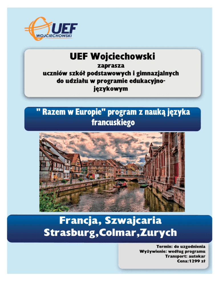 UEF Wojciechowski zaprasza uczniów szkół podstawowych i gimnazjalnych do udziału w programie edukacyjnojęzykowym " Razem w Europie" program z nauką języka francuskiego Francja, Szwajcaria Strasburg,Colmar,Zurych Termin: do uzgodnienia Wyżywienie: według programu Transport: autokar Cena:1299 zł PROGRAM przed południem po obiedzie Dzień 1 Sobota wieczorem Wyjazd grupy do Niemiec spod szkoły Dzień 2 Niedziela Przyjazd do Bayreuth (Niemcy) miasta w którym żył Richard Wagner Dzień 3 Poniedziałek Śniadanie Wyjazd do Schnepfenried (Francja) Śniadanie Dzień 4 Wtorek 9:00-11:00 zajęcia językowe Śniadanie + suchy prowiant Dzień 5 Środa Wyjazd do Szwajcarii - Zurych Śniadanie Dzień 6 Czwartek 9:00-11:00 zajęcia językowe Śniadanie + suchy prowiant Dzień 7 Piątek Wspólne zwiedzanie miasta w którym znajduje się opera Margrabiów, Nowy Pałac, Stary Zamek, Rynek 18:00 Obiadokolacja ok. 16:00 Przyjazd do ośrodka w Niemczech, zakwaterowanie Przyjazd do ośrodka, zakwaterowanie Obiad Wspólny spacer po okolicy , zapoznanie się z terenem ośrodka, odpoczynek Obiad Wyjazd do Colmar Wspólne zwiedzanie miasta (Petite Vénise, Collégiale Saint Martin, Plac Dominikański) zajęcia językowe w terenie Wspólne zwiedzanie Zurychu Stare Miasto, Muzeum Historyczne, Banhofstrasse 18:00 Kolacja 19:00 Kolacja Zajęcia sportowe na terenie ośrodka 20:00 Obiadokolacja Powrót do ośrodka Obiad Wyjazd do Mulhouse Wspólne zwiedzanie europejskiej stolicy Muzeów Techniki Wizyta w Centrum Motoryzacji Wspólne zwiedzanie Strasburga Mała Francja, Katedra, Pałac Rohanu, Ancienne Douane, Parlament Europejski 19:00 Kolacja Zajęcia sportowe na terenie ośrodka 20:00 Obiadokolacja Wyjazd do Strasburga Powrót do ośrodka Śniadanie Dzień 8 Sobota 9:00-11:00 zajęcia językowe Dzień 9 Niedziela Śniadanie + suchy prowiant Przygotowanie do wyjazdu Pożegnanie z Francją Dzień 10 Poniedziałek powrót do Polski Obiad Zwiedzanie miasteczka Munster Zajęcia rekreacyjne na basenie w Munster 19:00 Kolacja Podsumowanie programu,Quiz z nagrodami Obiad przejazd przez Niemcy Wyjazd do Polski Możliwe niewielkie zmiany programowe dostosowane do charakteru programu. INFORMACJE ORGANIZACYJNE: Termin: wakacyjny Cena: 1299 zł Grupa: min. 36 uczestników obejmuje: - przygotowanie programu, - transport autokarem klimatyzowanym (WC, Barek, DVD), - 1 nocleg w ośrodku w Niemczech (pokoje 2-6 osobowe) - 6 noclegów w ośrodku w górach w Schnepfenried: pokoje 4-6 osobowe, łazienki na korytarzach - zajęcia językowe z Native Spiker - wyżywienie przygotowane przez kucharkę polską- wyżywienie zgodnie z programem - ubezpieczenie KL, NNW, Assistance w PZU, - praktyczną pomoc kierownika wyjazdu i tłumacza. Cena nie zawiera wycieczek i wstępów - dodatkowo płatne 35 euro/osoba Projekt samodzielny- od 36 uczniów + 3 nauczycieli Projekt łączony- od 15 uczniów + 1 nauczyciel REZERWACJA MIEJSC: Podstawą do rezerwacji miejsca jest przesłanie listem, faksem, telefonicznie lub e-mailem zgłoszenia zawierającego imię, nazwisko, adres, PESEL, telefon kontaktowy, faks/mail oraz adres uczestników wyjazdu. Termin wpłat oraz wielkość rat do ustalenia indywidualnie z kierownikiem wyjazdu. Przy wpłatach proszę dopisać: Schnepfenried_termin oraz imię i nazwisko uczestnika Konto bankowe: PKO Bank Polski 19 1440 1231 0000 0000 1678 5431 Kierownik sekcji: Serdecznie zapraszamy do udziału w programie! Agnieszka Pawłowska e-mail: tel.: [email protected] 42 630 08 22 wew.206 UEF Wojciechowski ul. Zielona 25 m. 11, Łódź 90-602 NIP: 947-154-87-59 tel. (+48 42) 630 08 22, fax (+48 42) 630 31 29 www.uef.lodz.pl Dołącz do nas na facebooku: facebook.com/uef.lodz Niniejsza oferta nie jest ofertą handlową w rozumieniu przepisów Kodeksu Cywilnego