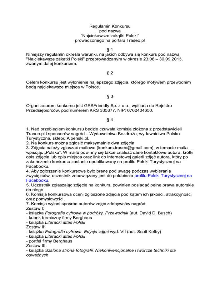 Regulamin Konkursu pod nazwą "Najciekawsze zakątki Polski" prowadzonego na portalu Traseo.pl §1 Niniejszy regulamin określa warunki, na jakich odbywa się konkurs pod nazwą "Najciekawsze zakątki Polski" przeprowadzanym w okresie 23.08 – 30.09.2013, zwanym dalej konkursem. §2 Celem konkursu jest wyłonienie najlepszego zdjęcia, którego motywem przewodnim będą najciekawsze miejsca w Polsce. §3 Organizatorem konkursu jest GPSFriendly Sp. z o.o., wpisana do Rejestru Przedsiębiorców, pod numerem KRS 335377, NIP: 6762404650. §4 1. Nad przebiegiem konkursu będzie czuwała komisja złożona z przedstawicieli Traseo.pl i sponsorów nagród – Wydawnictwa Bezdroża, wydawnictwa Polska Turystyczna, sklepu Alpenski.pl. 2. Na konkurs można zgłosić maksymalnie dwa zdjęcia. 3. Zdjęcia należy zgłaszać mailowo ([email protected]), w temacie maila wpisując „Polska”. W mailu powinny się także znaleźć dane kontaktowe autora, krótki opis zdjęcia lub opis miejsca oraz link do internetowej galerii zdjęć autora, który po zakończeniu konkursu zostanie opublikowany na profilu Polski Turystycznej na Facebooku. 4. Aby zgłoszenie konkursowe było brane pod uwagę podczas wybierania zwycięzców, uczestnik zobowiązany jest do polubienia profilu Polski Turystycznej na Facebooku. 5. Uczestnik zgłaszając zdjęcie na konkurs, powinien posiadać pełne prawa autorskie do niego. 6. Komisja konkursowa oceni zgłoszone zdjęcia pod kątem ich jakości, atrakcyjności oraz pomysłowości. 7. Komisja wyłoni spośród autorów zdjęć zdobywców nagród: Zestaw I: - książka Fotografia cyfrowa w podróży. Przewodnik (aut. David D. Busch) - kubek termiczny firmy Berghaus - książka Literacki atlas Polski Zestaw II: - książka Fotografia cyfrowa. Edycja zdjęć wyd. VII (aut. Scott Kelby) - książka Literacki atlas Polski - portfel firmy Berghaus Zestaw III: - książka Szalona strona fotografii. Niekonwencjonalne i twórcze techniki dla odważnych fotografów (aut. Cyrill Harnischmacher) - książka Literacki atlas Polski - film Autana 8. Decyzja komisji konkursowej o przyznaniu nagrody jest ostateczna i nie przysługuje od niej odwołanie. 9. Organizator konkursu zastrzega sobie prawo do opublikowania imienia, nazwiska i informacji o laureatach konkursu oraz umieszczanie tych informacji w materiałach informacyjnych organizatora oraz Partnerów. Organizator ma prawo do publikacji wszystkich zdjęć na swoich stronach internetowych bez konieczności informowania o publikacji ich autorów. 10. Użytkownik zgłaszający swoje zdjęcia do konkursu wyraża zgodę na wykorzystywanie adresu e-mail w celach informacyjnych i marketingowych przez Organizatora konkursu. 11. Informacja o rozstrzygnięciu konkursu zostanie ogłoszona do dnia 15 września 2013 r. 12. Nagrody zostaną przekazane zwycięzcy przesyłką pocztową poleconą. 13. Organizator zastrzega sobie prawo do przedłużenia czasu trwania konkursu lub zorganizowania jego drugiego etapu. §5 1. Niniejszy Regulamin jest jedynym dokumentem określającym zasady konkursu. 2. Uczestnik zobowiązany jest do zapoznania się z niniejszym Regulaminem przed przystąpieniem do konkursu. Uczestnik ponosi wyłączną odpowiedzialność za niezastosowanie się do postanowień niniejszego Regulaminu. 3. Pracownicy GPSFriendly oraz ich rodziny nie mogą brać udziału w konkursie. 4. Uczestnik poprzez fakt przystąpienia do konkursu akceptuje postanowienia niniejszego Regulaminu. 5. Niniejszy regulamin wchodzi w życie od dnia 23.08.2013 r. ORGANIZATOR GPSFriendly Sp. z o.o.