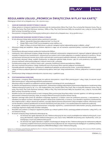 REGULAMIN USŁUGI „PROMOCJA ŚWIĄTECZNA W PLAY NA KARTĘ” Obowiązuje w dniach od 24 listopada 2014 r. do 1 stycznia 2015 r. I. OGÓLNE WARUNKI SKORZYSTANIA Z USŁUGI 1. 2. Usługa opisana w niniejszym regulaminie kierowana jest do Użytkowników Oferty Play Fresh, Play na Kartę Rok Ważności Konta, Play na kartę, Play Karta, Play Fresh Darmowe rozmowy i SMSy w Play, Play Fresh Darmowe SMSy do wszystkich sieci, Lubię to!, Formuła MINI MAX na Kartę, Formuła Play na Kartę. Skorzystanie z niniejszej Oferty Promocyjnej możliwe jest w dniach od 24 listopada 2014 r. do 31 grudnia 2014 r. II. SZCZEGÓŁOWE WARUNKI SKORZYSTANIA Z USŁUGI 1. W celu aktywacji Usługi należy wykonać jedną z poniższych czynności: a. Wpisać i zatwierdzić klawiszem połączenia kod *111*623*1#. b. Wysłać SMS o treści START.623 na bezpłatny numer telefonu 111. c. Wejść na Play24 na stronie https://www.24.play.pl i następnie wybrać odpowiednią opcję w zakładce „usługi”. Aktywacja Usługi jest bezpłatna. Usługa zostanie włączona w ciągu 24h od momentu wykonania jednej z czynności opisanych w pkt. 1 powyżej. Potwierdzenie aktywacji zostanie wysłane do Użytkownika SMSem. Użytkownik, który aktywował niniejszą Usługę otrzymuje możliwość wykonywania nieograniczonych, krajowych połączeń głosowych do wszystkich krajowych sieci komórkowych i stacjonarnych po wydaniu 10zł na takie połączenia na zasadach opisanych w punkcie 5. Do powyższej kwoty wliczane jest również użycie, które rozliczane jest z promocyjnych pakietów złotówek, o ile Użytkownik takie posiada. Od momentu aktywacji Usługi, wydatki Użytkownika na połączenia głosowe będą zliczane i gdy ich suma przekroczy 10zł Użytkownik otrzyma możliwość wykonywania połączeń, o których mowa w pkt. 4 powyżej. O przekroczeniu progu 10zł, o którym mowa w pkt. 4 powyżej, Użytkownik zostanie powiadomiony SMSem. Aby mieć możliwość korzystania z Usługi, Użytkownik musi utrzymywać Okres ważności połączeń wychodzących. Pozostałe jednostki wynikające np. z zakupionych, dodatkowych pakietów są rozliczane bez zmian, w pierwszej kolejności. Usługa nie dotyczy połączeń głosowych o podwyższonej opłacie, takich jak: usługi audiotekstowe, infolinie, połączenia z numerami specjalnymi. Dezaktywacja Usługi następuje automatycznie 1 stycznia 2015 r. o godzinie 23:59. 2. 3. 4. 5. 6. 7. 8. 9. 10. III. POSTANOWIENIA KOŃCOWE 1. Skorzystanie z niniejszej Oferty Promocyjnej nie wyklucza skorzystania z innych Ofert promocyjnych i usług, chyba, że warunki innych Ofert promocyjnych i usług zawierają odmienne postanowienia. Aktywacja usługi nie wpływa na wydłużenie ważności połączeń wychodzących lub przychodzących. W zakresie nieuregulowanym niniejszym regulaminem, zastosowanie znajdują odpowiednie postanowienia Regulaminu świadczenia Usług Telekomunikacyjnych przez P4 Sp. z o.o. dla Użytkowników oraz Cennika Oferty Play Fresh, Play na Kartę Rok Ważności Konta, Play na kartę, Play Karta, Play Fresh Darmowe rozmowy i SMSy w Play, Play Fresh Darmowe SMSy do wszystkich sieci, Lubię to!, Formuła MINI MAX na Kartę, Formuła Play na Kartę. Wszelkie wyrazy lub wyrażenia pisane w treści niniejszej Oferty promocyjnej dużą literą należy rozumieć zgodnie z ich definicją zawartą w dokumentach wskazanych powyżej, chyba, że niniejsza Oferta Promocyjna wyraźnie stanowi inaczej. Operator zastrzega sobie prawo do odwołania niniejszego regulaminu w każdym czasie bez podawania przyczyny, z zastrzeżeniem, że odwołanie nie wpływa na prawa i obowiązki uprzednio nabyte przez Użytkownika, co oznacza, iż po odwołaniu regulaminu Użytkownik będzie mógł korzystać z usługi w okresie jej ważności, a po jego upływie ponowne aktywowanie usługi nie będzie możliwe. Informacja o zmianie lub odwołaniu zostanie opublikowana na stronie internetowej www.play.pl lub w inny sposób podana do wiadomości publicznej. W przypadku rozbieżności pomiędzy postanowieniami niniejszego regulaminu, a postanowieniami dokumentów powyżej, postanowienia niniejszego regulaminu będą miały charakter nadrzędny. Wszystkie ceny podane w niniejszym regulaminie podane są w złotych polskich (PLN) i zawierają podatek od towarów i usług (VAT), o ile nie wskazano inaczej. W ramach niniejszej usługi Użytkownik zobowiązuje się: a. nie kierować bez zgody Operatora do sieci Telekomunikacyjnej lub sieci innych przedsiębiorców telekomunikacyjnych, za pomocą jakichkolwiek urządzeń telekomunikacyjnych, przy użyciu Karty SIM/USIM otrzymanej przez Użytkownika, ruchu pochodzącego z innych sieci telekomunikacyjnych; b. nie stosować bez zgody Operatora urządzeń umożliwiających dostęp do Sieci Telekomunikacyjnej lub realizowanie połączeń za pomocą urządzeń końcowych przeznaczonych do przyłączania do sieci stacjonarnej lub działających na podobnej zasadzie, w których wykorzystywane będą karty SIM/USIM działające w Sieci Telekomunikacyjnej; 2. 3. 4. 5. 6. 7. 8. P4 Sp. z o.o., ul. Taśmowa 7, 02-677 Warszawa, Sąd Rejonowy dla m. st. Warszawy w Warszawie XIII Wydział Gospodarczy Krajowego Rejestru Sądowego, KRS 0000217207, REGON 015808609, NIP 951-21-20-077, kapitał zakładowy 48 456 500 zł STRONA 1 Z 2 c. d. e. 9. 10. nie generować sztucznego ruchu nie służącego wymianie informacji; nie używać karty SIM/USIM w rozwiązaniach telemetrycznych; nie używać karty SIM/USIM do ruchu generowanego maszynowo, w szczególności ruchu typu „maszyna do maszyny” lub „maszyna do użytkownika”; f. nie używać karty SIM/USIM do generowania ruchu, który ma charakter ataku Denial od Service; g. nie wykorzystywać Kart SIM/USIM bez zgody P4 do inicjowania ruchu, polegającego na masowym wykonywaniu połączeń, w szczególności w przypadku automatycznej dystrybucji połączeń lub automatycznej interaktywnej obsługi numeru wywołanego lub w przypadku integrac