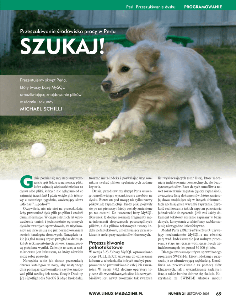 Perl: Przeszukiwanie dysku PROGRAMOWANIE Przeszukiwanie środowiska pracy w Perlu SZUKAJ! Prezentujemy skrypt Perla, który tworzy bazę MySQL umożliwiającą znajdowanie plików w ułamku sekundy. MICHAEL SCHILLI G dzie podział się mój napisany wczoraj skrypt? Gdzie są najnowsze pliki, które zajmują większość miejsca na dysku albo pliki, których nie oglądano od co najmniej trzech lat? I gdzie wcięło plik tekstowy z ostatniego tygodnia, zawierający słowa „Michael” i „podróż”? Oczywiście, nic nie stoi na przeszkodzie, żeby przeszukać dysk plik po pliku i znaleźć daną informację. W ciągu ostatnich lat wprowadzenie tanich i jednocześnie ogromnych dysków twardych spowodowało, że użytkownicy nie przejmują się już porządkowaniem swoich katalogów domowych. Narzędzia takie jak find muszą często przeglądać dziesiątki lub setki nieistotnych plików, zanim zwrócą pożądane wyniki. Zajmuje to czas, a nadmiar czasu jest luksusem, na który niewielu może sobie pozwolić. Narzędzia takie jak slocate przeszukują drzewa katalogów w nocy, aby następnego dnia pomagać użytkownikom szybko znajdować pliki według ich nazw. Google Desktop [2] i Spotlight dla MacOS X idą o krok dalej, tworząc meta-indeks i pozwalając użytkownikom szukać plików spełniających zadane kryteria. Dzisiaj przedstawimy skrypt Perla rummage, umożliwiający wyszukiwanie zasobów na dysku. Bierze on pod uwagę nie tylko nazwy plików, ale zapamiętuje, kiedy pliki pojawiły się po raz pierwszy i kiedy zostały zmienione po raz ostatni. Do tworzonej bazy MySQL (Rysunek 1) dodaje rozmaite fragmenty meta-informacji dotyczących poszczególnych plików, a dla plików tekstowych tworzy indeks pełnotekstowy, umożliwiający przeszukiwanie treści przy użyciu słów kluczowych. Przeszukiwanie pełnotekstowe W wersja 3.23.23 bazy MySQL wprowadzono opcję FULLTEXT, używaną do oznaczania kolumn w tabelach, dla których ma być przeprowadzane przeszukiwanie całej ich zawartości. W wersji 4.0.1 dodano operatory logiczne dla wyszukiwanych słów kluczowych. Możliwe jest nawet tworzenie tak zwanych WWW.LINUX-MAGAZINE.PL list wykluczających (stop lists), które zabraniają indeksowania powszechnych, ale bezużytecznych słów. Baza danych umożliwia nawet rozszerzanie zapytań (query expansion), zwracające listę dokumentów, które zawierają słowa znajdujące się w innych dokumentach spełniających warunki zapytania. Szybkość realizowania takich zapytań pozostawia jednak wiele do życzenia. Jeśli zaś każdy dokument tekstowy zostanie zapisany w bazie danych, korzystanie z takiej bazy szybko staje się niewygodne i nieefektywne. Moduł Perla DBIx::FullTextSearch używający mechanizmów MySQL-a ma również parę wad. Indeksowanie jest wolnym procesem, a staje się jeszcze wolniejsze, kiedy zaindeksowanych jest ponad 30 000 plików. Dlatego też rummage używa sprawdzonego programu SWISH-E, który indeksuje i przeszukuje ze zdumiewającą szybkością. Umożliwia on przeszukiwanie za pomocą słów kluczowych, jak i wyszukiwanie zadanych fraz, a także bardzo dobrze się skaluje. Korzystanie ze SWISH-E ułatwia moduł NUMER 21 LISTOPAD 2005 69 PROGRAMOWANIE Perl: Przeszukiwanie dysku SWISH::API::Common z archiwum CPAN, koncentrujący się na najczęściej używanych funkcjach. Należy jednak wspomnieć, że SWISH-E nie potrafi usuwać plików z już utworzonego indeksu, co – dla zachowania aktualności danych – wymusza codzienne Polecenie rummage -n 20 pozwala znaleźć 20 ostatnio zmodyfikowanych plików. Jeśli nie podasz liczby, polecenie przyjmie wartość domyślną i wyświetli 10 ostatnio zmienionych plików. Polecenie rummage -m „7 day” zwróci wszystkie pliki zmodyfikowane Rysunek 1: Schemat tabeli 'file', w której 'rummage' przechowuje meta-dane plików. powtórne indeksowanie plików. Wykonywane każdej nocy zadanie crona może z łatwością obsłużyć setki tysięcy plików, co zupełnie wystarcza normalnym użytkownikom. Metody Po pierwszej sesji indeksowania poprzez polecenie rummage -u meta-dane i indeks pełnotekstowy stają się dostępne dla użytkowników. Polecenie rummage -k query znajduje pliki zawierające podane słowo kluczowe. W Ramce 1 podajemy parę przykładów przeszukiwania za pomocą słów kluczowych i zapytań o różne meta-dane. Jak pokazano na schemacie na Rysunku 1, baza MySQL-a przechowuje pełną ścieżkę dostępu do każdego pliku, jego rozmiar w bajtach, czas pierwszego pojawienia się w systemie plików, czas ostatniego dostępu i ostatniej modyfikacji. Plik o nazwie call.sgml, ukryty gdzieś w mrocznych otchłaniach zaindeksowanej hierarchii plików, znaleźć można przez wywołanie rummage -p call.sgml. Mechanizm działania rummage polega na zamianie call.sgml na wzorzec SQL-a %call.sgml% i przeszukaniu tabeli file zapytaniem WHERE path LIKE „%call.sgml%”. Zapytania o ścieżki względne, takie jak examples/call.sgml, także będą działały, ale w takim przypadku rummage znajdzie zadany plik tylko wtedy, jeśli znajduje się on w podkatalogu examples. 70 NUMER 21 LISTOPAD 2005 w ciągu ostatniego tygodnia. W tym celu wywoła ono następujące zapytanie MySQL-a: SELECT * FROM file WHERE DATE_SUB(NOW(), INTERVAL 7 DAY) <= mtime każąc obliczyć bazie MySQL, czy data modyfikacji dla każdego rekordu wypada wcześniej niż jeden tydzień wstecz. W razie potrzeby możesz zastąpić liczbę dni wyrażeniem typu 3 month (3 miesiące) lub 18 hour (18 godzin). Oczywiście, żadne z tych wyrażeń nie odnosi się do chwili obecnej, lecz do czasu ostatniej aktualizacji bazy, czyli najczęściej do poprzedniej nocy. Program rummage po prostu nie uwzględnia niczego, co wydarzyło się później. Przypuszczalnie będzie trzeba zmodyfikować pierwszą część programu rummage, aby dopasować ją do danego środowiska pracy. Stała $MAX_SIZE definiuje maksymalną długość zawartości, która ma być zaindeksowana