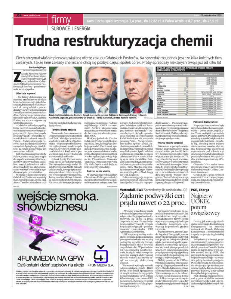 .04 www.parkiet.com firmy środa 20 października 2010 Kurs Ciechu spadł wczoraj o 3,4 proc., do 19,82 zł, a Puław wzrósł o 0,7 proc., do 73,5 zł SUROWCE I ENERGIA Trudna restrukturyzacja chemii Ciech otrzymał właśnie pierwszą wiążącą ofertę zakupu Gdańskich Fosforów. Na sprzedaż ma jednak jeszcze kilka kolejnych firm zależnych. Także inne zakłady chemiczne chcą się pozbyć części spółek córek. Próby sprzedaży niektórych trwają już od kilku lat Bartłomiej Mayer Z Spółki wystawione na sprzedaż przez firmy chemiczne i paliwowe [email protected] akłady Azotowe Puławy złożyły Ciechowi wiążącą ofertę nabycia 89,46 proc. udziałów Gdańskich Zakładów Nawozów Fosforowych Fosfory – poinformowała wczoraj spółka. Lider chce kupować – Śledzimy dokonujące się obecnie przemiany w polskiej branży chemicznej i, jako lider sektora, bierzemy w tych procesach aktywny udział – powiedział cytowany w komunikacie Paweł Jarczewski, prezes zakładów. Puławy są producentem nawozów azotowych, Gdańskie Fosfory zaś wytwarzają nawozy wieloskładnikowe. – Gdańskie zakłady są spółką, która pozwoli nam zdyskontować ważne obszary synergii logistycznych i dystrybucyjnych, produkcyjnych – stwierdził Zenon Pokojski, członek zarządu Puław. – Udana akwizycja pozwoli nam bardziej efektywnie zarządzać dystrybucją produktów, zarazem poszerzając ich asortyment – dodał. Jeśli Ciech zaakceptuje ofertę Puław, strony mają przystąpić do uzgodnienia wszystkich elementów umowy nabycia udziałów, zarząd puławskich zakładów przedłoży zaś akcjonariuszom wniosek o wyrażenie zgody na nabycie tych udziałów. Wcześniej zainteresowanie Gdańskimi Fosforami wyrażały m.in. wielkopolska Luvena oraz Azoty Tarnów, ale żadna z tych REKLAMA SPÓŁKA NA SPRZEDAŻ Trzej chętni na Gdańskie Fosfory: Paweł Jarczewski, prezes Zakładów Azotowych Puławy (z lewej), FOT. A.C., S.Ł. Kazimierz Zagozda, prezes Luveny (w środku), i Jerzy Marciniak, prezes Azotów Tarnów. firm nie złożyła dotychczas wią- raźniej uległa zmianie. Podczas najbliższego NWZA tarnowżącej oferty. skich Azotów akcjonariusze Tarnów z ofertą poczeka mają się zająć wnioskiem zarząTarnowska firma koncentru- du dotyczącym właśnie sprzeje się teraz na przejęciu kontroli daży JRCh. nad ZAK. Ma objąć 30 mln noWróćmy jednak do Ciechu. wych akcji zakładów z Kędzie- Gdańskie Fosfory są tylko jedrzyna. – Dopiero po sfinalizowa- ną z kilku firm, które grupa próniu tej fuzji wrócimy do innych buje sprzedać. Ciech musi, zgokwestii, w tym też oferty kup- nie z porozumieniem z bankana Gdańskich Fosforów – po- mi, znacząco zredukować zadłuwiedział nam Robert Lichwała żenie, stąd plany dezinwestycji. z tarnowskich zakładów. Na chętnych wciąż czekają więc Jednak Azoty Tarnów same m. in. Vitrosilicon, Alwernia, mają spółki córki na sprzedaż. Transoda, Tranclean oraz Polfa. Na chętnych czekają nadal: El- Dla niektórych z nich będą to zat, Prorem oraz ZWRI. Zakłady kolejne próby sprzedaży. deklarowały, że w grupie pozoPolicom się nie wiedzie staną docelowo tylko cztery firW czerwcu tego roku Zakłady my o strategicznym znaczeniu. Jedną z nich miała być Jednost- Chemiczne Police po raz kolejka Ratownictwa Chemicznego. ny zaprosiły inwestorów do rozAle ostatnio koncepcja najwy- mów na temat zakupu paru firm z grupy. Pod młotek trafiły 100proc. udziały w spółkach Automatika, Centrum, Koncept, Supra, Remech i Transtech. – Tłumu chętnych nie było – powiedział wczoraj eufemistycznie Rafał Kuźmiczonek, rzecznik prasowy Polic. – Nie sprzedaliśmy żadnej spółki – dodał. Zachodniopomorska firma od kilku lat próbuje się pozbyć części swych aktywów. Spółki zależne wystawia na sprzedaż od czasu debiutu na GPW w 2006 r. Efekty są na razie niewielkie. Policom udało się dotychczas sprzedać dawną przychodnię zakładową – firmę Medika, oraz spółkę transportową Kargo. Pierwszą z nich kupił Lux Med, drugą zaś CTL Logistics. Police nie rezygnują ze sprzedaży pozostałych spółek córek, teraz jednak chcą do tego po- ELZAT JRCH PROREM ZWRI VITROSILICON ALWERNIA GDAŃSKIE FOSFORY TRANSODA TRANCLEAN POLFA REMECH AUTOMATIKA CENTRUM TRANSTECH KONCEPT SUPRA LOTOS PARAFINY ORLEN BUDONAFT ORLEN CENTRUM SERWISOWE LICZBA UDZIAŁÓW (PROC.) 100 100 100 100 100 73,75 89,46 100 93,67 100 100 100 100 100 100 100 100 100 99,1 FIRMA SPRZEDAJĄCA AZOTY TARNÓW AZOTY TARNÓW AZOTY TARNÓW AZOTY TARNÓW CIECH CIECH CIECH CIECH (POPRZEZ SODĘ POLSKĄ) CIECH (WRAZ Z ZACHEMEM) CIECH ZAKŁADY CHEMICZNE POLICE ZAKŁADY CHEMICZNE POLICE ZAKŁADY CHEMICZNE POLICE ZAKŁADY CHEMICZNE POLICE ZAKŁADY CHEMICZNE POLICE ZAKŁADY CHEMICZNE POLICE GRUPA LOTOS PKN ORLEN PKN ORLEN Źródło: spółki dejść inaczej. – Planujemy najpierw zrestrukturyzować te firmy i dopiero później poszukać dla nich inwestorów – wyjaśnia Kuźmiczonek. Zakłady chciałyby sfinalizować wszystkie transakcje w przyszłym roku. Puławy zdążyły sprzedać Sukcesami w porządkowaniu własnej grupy kapitałowej mogą się natomiast pochwalić Puławy. Zakładom pomógł zresztą wspomniany już koncern CTL Logistics, który kupił większościowe udziały w dwóch firmach – w Kolzapie i Autozapie. Należący do grupy Mostostalu Warszawa Mostostal Puławy przejął za to od zakładów azotowych dwie inne spółki – Mezap i Energozap. Teraz Puławy nie mają już na sprzedaż żadnych spółek z grupy, chcą za to kupować. Paliwowe dezinwestycje Na przejęcia nastawione były dotychczas także koncerny paliwowe – Orlen oraz Grupa Lotos. Teraz myślą też o sprzedaży części aktywów. Płocki koncern starał się sprzedać większościowy pakiet akcji Anwilu – nie udało się. Złożoną przez Puławy ofertę cenową uznał za zbyt niską. Rozważa więc możliwość wystawienia pod młotek wydzielonej cz