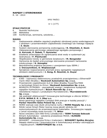 NAPĘDY I STEROWANIE R. 16 - 2014 SPIS TREŚCI nr 1 (177) STAŁE POZYCJE 6 Nowości techniczne 108 Biblioteka 109 Konferencje, seminaria, szkolenia... NAUKA 52 Zastosowanie układów regulacji prędkości obrotowej pomp wodociągowych z silnikiem i przemiennikiem częstotliwości średniego lub niskiego napięcia / Z. Szulc 56 System sterowania pompownią wodociągową / R. Olesiński, Z. Szulc 60 Zabezpieczenia górniczego zatapialnego agregatu pompowego / A. Korczak, P. Sobek, T. Synowiec 68 Działania zmierzające do ograniczania strat wody w systemach jej dystrybucji / F. Piechurski 80 Współczesne trendy w górnictwie światowym / M. Bergander 86 Hartownia do badań precyzyjnego sterowania procesem hartowania indukcyjnego / K. Konopka 93 Bezrdzeniowa prądnica tarczowa z uzwojeniem typu SEMA / J. Owczynnikow, D. Wojtaszczyk 96 Sprzętowe rozpoznawanie anomalii pracy agregatów napędzanych silnikami elektrycznymi / J. Song, R. Nowicki, A. Duyar TECHNOLOGIE I PRODUKTY 10 E300 - najnowszy elektroniczny przekaźnik przeciążeniowy z EthernetIP marki Allen-Bradley / Rockwell Automation Sp. z o.o. 12 Przemienniki częstotliwości 6,6 kV Allen-Bradley PowerFlex7000 w technologii Direct-to-Drive / Rockwell Automation Sp. z o.o. 14 REXROTH SYTRONIX - oszczędność energii i zwiększona wydajność napędów hydraulicznych / Bosch Rexroth Sp. z o.o. 19 Oświetlenie maszyn z produktami Murrelektronik / Murrelektronik Sp. z o.o. 20 Jak podnieść efektywność? Innowacyjne technologie w ofercie WObit / P.P.H. WObit E. K. J. Ober s.c. 22 Nowa generacja napędów Compact EHA pracuje w każdej pozycji! / Parker Hannifin Sales Poland Sp. z o.o. 24 NORD szanuje czas służb utrzymania ruchu / NORD Napędy Sp. z o.o. 26 Silniki Lenze Smart Motor tworzą nową jakość silników AC wykorzystywanych do przemieszczania materiałów. Innowacyjne napędy z Lenze wyzwalają nowe korzyści / T. Witor 29 Nowe enkodery serii 900 firmy Leine&Linde / TERM Tomasz Sobczak 31 Elmark Automatyka - szkolenia produktowe MOXA / ELMARK Automatyka Sp. z o.o. 33 BOHAMET - innowacyjna firma z tradycjami / BOHAMET Spółka Akcyjna 35 Napędy elektryczne i pneumatyczne w automatyzacji armatur odcinających i regulacyjnych / EUROTORQUE Sp. z o.o. 37 40 44 Napędy i sterowanie w hydraulice i pneumatyce / Conrad Electronic Sp. z o.o. Układy hydrauliczne w strefach zagrożonych wybuchem / I. Burszczan, T. Bibrzycki Rozwój innowacyjności w Kompanii Węglowej SA / Ł. Gajda INFORMACJE BRANŻOWE 8 Konkurs miesięcznika „Napędy i Sterowanie" PRODUKT ROKU 2014 18 Energia bez granic... Pierwsza edycja Targów InEnerg przed nami! / REECO Poland Sp. z o.o. 28 Nowy Prezes Zarządu firmy Lenze SE. Christian Wendler następcą dra Erharda Tellbüschera 30 Konferencja bezpieczeństwa przemysłowego - od teorii do praktyki 32 Konkurs „Nowatorska Elektryka" 34 Niedoceniane dotacje na badania / A. Szymczak 38 Kopex buduje kopalnię 50 KOMTECH 2013. Innowacyjne techniki i technologie dla górnictwa / R. Klencz nr 2 (178) STAŁE POZYCJE 6 Nowości techniczne 116 Biblioteka 117 Konferencje, seminaria, szkolenia... NAUKA 60 Walidacja układów sterowania związanych z bezpieczeństwem z wykorzystaniem normy PN-EN ISO 13849-2. Problemy z praktycznym wyznaczaniem Performance Level różnych funkcji bezpieczeństwa maszyn / K. Ujczak 63 Analiza ryzyka kombajnu (ścianowego lub chodnikowego) dla określenia poziomu nienaruszalności bezpieczeństwa SIL. Zagadnienia wybrane / J. Chmiel 67 Europejska koncepcja bezpieczeństwa maszyn / W. Łabanowski 72 Rola osłon stałych w zapewnieniu bezpieczeństwa maszyn / M. Trajdos 74 Analiza uszkodzeń silników wysokonapięciowych prądu przemiennego w elektrowniach zawodowych / B. Drak, P. Zientek 79 Badania innowacyjnego rozwiązania kabiny operatora dla dołowych maszyn samojezdnych / A. Kalukiewicz, P. Gospodarczyk, G. Stopka 84 Implementacja przemienników częstotliwości w napędach górniczych wentylatorów lutniowych typoszeregu WLE / A. Kozłowski, J. Brol, T. Gąsior, R. Sadowski, Z. Krawczyk 88 Sterowanie falownikami napięcia ograniczające prądy łożyskowe / J. Guziński, P. Strankowski 97 Estryfikacja etanolowa i metanolowa w wytwarzaniu biokomponentów i biopaliw do silników o zapłonie samoczynnym / M. Struś, M. Rewolte 102 Energooszczędne silniki synchroniczne z magnesami trwałymi / J. Zawilak, T. Zawilak TECHNOLOGIE I PRODUKTY 12 Przejrzyste korzyści / Siemens Sp. z o.o. 14 TEMAT Z OKŁADKI: Napędy HF Inverter dla wentylacji / M. Snowacki 17 Emparro - zasilacz z maksymalną wydajnością / Murrelektronik 18 TEMAT Z OKŁADKI: Regulacja prędkości obrotowej silników elektrycznych wg Danfoss. Duży potencjał - szybka realizacja / Danfoss Poland 21 Konwersja interfejsu szeregowego na światłowód z redundancją połączeń / Antaira Technologies Sp. z o.o. 22 Nowe napędy elektryczne dużej mocy firmy Bosch Rexroth: od 110 kW do 4 MW. Energooszczędna automatyka w napędach o mocy megawatów / Bosch Rexroth Sp. z o.o. 24 Firma Bosch Rexroth jest sprawdzonym partnerem w dziedzinie zgrzewania aluminiowych nadwozi samochodowych. Niezawodne i ekonomiczne zgrzewanie stali i aluminium / Bosch Rexroth Sp. z o.o. 26 Zabezpieczenie układów maszyn z wykorzystaniem sterowników bezpieczeństwa Pluto / ABB Sp. z o.o. 29 IXARC - Magnetyczne Enkodery Inkrementalne (made in Poland) / POSITAL FRABA 30 Technika liniowa w ofercie WObit / P.P.H. WObit E.K.J. Obers.c. 33 Kuebler poszerza portfolio systemów pomiaru liniowego / Kubler Sp. 35 Pomiar przepływu cieczy agresywnych / Conrad Electronic Sp. z o.o. 37 39 40 43 45 46 48 50 52 Realizacje systemów automatyki z wykorzystaniem sterownika SIEMENS SIMATIC S7-1200 / Impol-1 F. Szafrański Sp. J. Seria Unistream - nowa gama sterowników / M. Sikorski Wybrane aspekty europejskiego podejścia do bezpieczeństwa i higieny pracy / Schmersal-Polska Obudowy EX do trudnych warunków środowiskowych / MERA EX Sp. Enkodery z programowalnym wyłącz