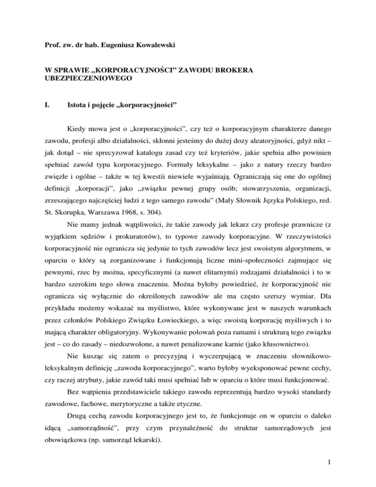 Prof. zw. dr hab. Eugeniusz Kowalewski W SPRAWIE „KORPORACYJNOŚCI” ZAWODU BROKERA UBEZPIECZENIOWEGO I. Istota i pojęcie „korporacyjności” Kiedy mowa jest o „korporacyjności”, czy też o korporacyjnym charakterze danego zawodu, profesji albo działalności, skłonni jesteśmy do dużej dozy aleatoryjności, gdyż nikt – jak dotąd – nie sprecyzował katalogu zasad czy też kryteriów, jakie spełnia albo powinien spełniać zawód typu korporacyjnego. Formuły leksykalne – jako z natury rzeczy bardzo zwięzłe i ogólne – także w tej kwestii niewiele wyjaśniają. Ograniczają się one do ogólnej definicji „korporacji”, jako „związku pewnej grupy osób; stowarzyszenia, organizacji, zrzeszającego najczęściej ludzi z tego samego zawodu” (Mały Słownik Języka Polskiego, red. St. Skorupka, Warszawa 1968, s. 304). Nie mamy jednak wątpliwości, że takie zawody jak lekarz czy profesje prawnicze (z wyjątkiem sędziów i prokuratorów), to typowe zawody korporacyjne. W rzeczywistości korporacyjność nie ogranicza się jedynie to tych zawodów lecz jest swoistym algorytmem, w oparciu o który są zorganizowane i funkcjonują liczne mini-społeczności zajmujące się pewnymi, rzec by można, specyficznymi (a nawet elitarnymi) rodzajami działalności i to w bardzo szerokim tego słowa znaczeniu. Można byłoby powiedzieć, że korporacyjność nie ogranicza się wyłącznie do określonych zawodów ale ma często szerszy wymiar. Dla przykładu możemy wskazać na myślistwo, które wykonywane jest w naszych warunkach przez członków Polskiego Związku Łowieckiego, a więc swoistą korporację myśliwych i to mającą charakter obligatoryjny. Wykonywanie polowań poza ramami i strukturą tego związku jest – co do zasady – niedozwolone, a nawet penalizowane karnie (jako kłusownictwo). Nie kusząc się zatem o precyzyjną i wyczerpującą w znaczeniu słownikowoleksykalnym definicję „zawodu korporacyjnego”, warto byłoby wyeksponować pewne cechy, czy raczej atrybuty, jakie zawód taki musi spełniać lub w oparciu o które musi funkcjonować. Bez wątpienia przedstawiciele takiego zawodu reprezentują bardzo wysoki standardy zawodowe, fachowe, merytoryczne a także etyczne. Drugą cechą zawodu korporacyjnego jest to, że funkcjonuje on w oparciu o daleko idącą „samorządność”, przy czym przynależność do struktur samorządowych jest obowiązkowa (np. samorząd lekarski). 1 Wykonywanie danego zawodu czy działalności przez osoby nie będące członkami danego samorządu nie jest dozwolone, a często nawet penalizowane w aspekcie prawnokarnym. Obligatoryjna przynależność „samorządowa” wiąże się z kolei z poddaniem się adeptów danego zawodu (członków korporacji) określonym procedurom a także zasadom wykonywania zawodu, uzewnętrznionym np. w kodeksach etyki ustalonych i wprowadzonych przez władze samorządu korporacyjnego. Wszelkie naruszenia zasad etyki wykonywania danego zawodu są monitorowane i rozpatrywane przez powołane do tego sądy czy komisje dyscyplinarne, które w skrajnych wypadkach mogą stosować surowe kary, jak np. zawieszenie czy pozbawienie prawa wykonywania zawodu. Najbardziej dotkliwymi sankcjami są – w skrajnych przypadkach – pozbawienie członkostwa w danej korporacji, co skutkuje z reguły niemożnością wykonywania zawodu. Z wymienionymi cechami zawodu korporacyjnego wiąże się jego „zamknięty” charakter w tym znaczeniu, że przynależność korporacyjna a co za tym idzie prawo wykonywania w jej ramach określonego zawodu, jest prawnie reglamentowana w tym znaczeniu, że kandydat do danego zawodu musi spełnić liczne wymogi i poddać się – często bardzo skomplikowanym i długotrwałym – procedurom formalnym, np. szkoleniom, aplikacjom, stażom, praktykom, egzaminom. To z kolei sprawia, że dostępność do danej korporacji, a co za tym idzie dopuszczenie do wykonywania zawodu korporacyjnego jest ściśle reglamentowane, trudno jest zatem mówić o „otwartości” danego zawodu czy powszechnej dostępności do danej korporacji. Tak więc możemy skonstatować, że jedną z istotnych cech korporacji (zwłaszcza typu zawodowego) jest ich daleko idąca autonomia i samorządność, która niejako minimalizuje ingerencję władz i urzędów państwowych (publicznych). Innymi słowy nadzór nad strukturami korporacyjnymi i nad funkcjonowaniem danej korporacji nie ma na ogół charakteru państwowego. Władze państwowe (publiczne) wykonują wprawdzie pewne ogólne prerogatywy (np. w zakresie inicjatyw ustawodawczych czy zmian prawnych), ale są one ograniczone i prawnie ściśle reglamentowane. Wreszcie, omawiając pewne ogólne cechy „korporacyjności” nie sposób nie zauważyć, że wiąże się ona z pewnym specyficznym charakterem czy raczej przesłaniem społecznym danego zawodu czy działalności. Często jest tak, że adepci zawodu typu korporacyjnego cieszą się szczególnym prestiżem społecznym, swoistą estymą i renomą, a dobrym przykładem są tu lekarze. Niekiedy dany zawód korporacyjny bywa nazywany zawodem zaufania publicznego. Ta swoista adoracja przybiera nierzadko kształt swoistego mistycyzmu roztaczanego wokół wykonawców zawodu korporacyjnego, a zawód lekarza czy prawnika są 2 tego dobrymi przykładami. Członkowie danej korporacji nie uważają siebie za zwykłych „wykonawców” zawodu lecz – więcej – utrzymują, że wykonują szczególną misję społeczną, a zasady i reguły wykonywania zawodu skłonni są porównywać do tzw. reguł sztuki. Stąd sytuacje, w których bywają naruszane zasady wykonywania danego zawodu lub jego standardy określane bywają eufemistycznie „błędami w sztuce”, co niejako sugeruje większy algorytm ich „wybaczalności” w porównaniu z naruszeniami standardów wykonywania innych zawodów. II. Czy broker ubezpieczeniowy jest zawodem korporacyjnym? Choć należy się zgodzić, że istnieją daleko