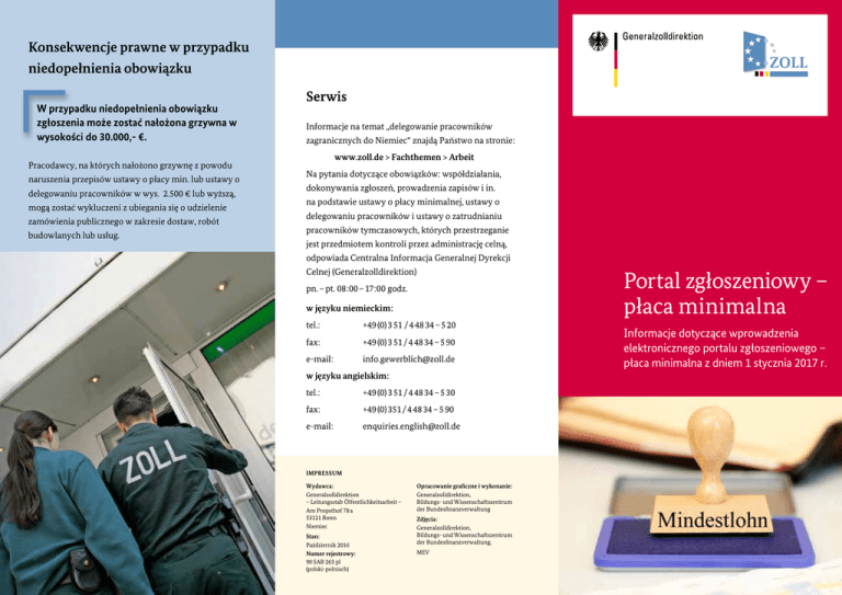 Konsekwencje prawne w przypadku niedopełnienia obowiązku W przypadku niedopełnienia obowiązku zgłoszenia może zostać nałożona grzywna w wysokości do 30.000,- €. Pracodawcy, na których nałożono grzywnę z powodu naruszenia przepisów ustawy o płacy min. lub ustawy o delegowaniu pracowników w wys. 2.500 € lub wyższą, mogą zostać wykluczeni z ubiegania się o udzielenie zamówienia publicznego w zakresie dostaw, robót budowlanych lub usług. ZOLL Serwis Informacje na temat „delegowanie pracowników zagranicznych do Niemiec“ znajdą Państwo na stronie : www.zoll.de > Fachthemen > Arbeit Na pytania dotyczące obowiązków: współdziałania, dokonywania zgłoszeń, prowadzenia zapisów i in. na podstawie ustawy o płacy minimalnej, ustawy o delegowaniu pracowników i ustawy o zatrudnianiu pracowników tymczasowych, których przestrzeganie jest przedmiotem kontroli przez administrację celną, odpowiada Centralna Informacja Generalnej Dyrekcji Celnej (Generalzolldirektion) Portal zgłoszeniowy – płaca minimalna pn. – pt. 08 : 00 – 17 : 00 godz. w języku niemieckim : tel. : +49 (0) 3 51 / 4 48 34 – 5 20 fax : +49 (0) 3 51 / 4 48 34 – 5 90 e-mail : [email protected] w języku angielskim : tel. : +49 (0) 3 51 / 4 48 34 – 5 30 fax : +49 (0) 351 / 4 48 34 – 5 90 e-mail : [email protected] IMPRESSUM Wydawca : Generalzolldirektion – Leitungsstab Öffentlichkeitsarbeit – Am Propsthof 78 a 53121 Bonn Niemiec Stan : Październik 2016 Numer rejestrowy : 90 SAB 263 pl (polski-polnisch) Opracowanie graficzne i wykonanie : Generalzolldirektion, Bildungs- und Wissenschaftszentrum der Bundesfinanzverwaltung Zdjęcia : Generalzolldirektion, Bildungs- und Wissenschaftszentrum der Bundesfinanzverwaltung, MEV Informacje dotyczące wprowadzenia elektronicznego portalu zgłoszeniowego – płaca minimalna z dniem 1 stycznia 2017 r. Co się zmieni? Jak funkcjonuje portal zgłoszeniowy - płaca minimalna? Czy mam obowiązek dokonania zgłoszenia? Od dnia 1 stycznia 2017 r. pracodawcy z siedzibą za granicą Na portal zgłoszeniowy - płaca minimalna można wejść Zgodnie z § 16 ust. 1 ustawy o płacy minimalnej (Mi-LoG) mają zgłaszać swoich pracowników delegowanych do przez stronę internetową i § 18 ust. 1 ustawy o delegowaniu pracowników Niemiec przez portal zgłoszeniowy - płaca minimalna (AEntG) pracodawca z siedzibą za granicą ma ■ ■ ■ online. Dotyczy to również pracodawców użytkowników, którzy zatrudniają pracowników użyczonych przez pracodawcę z siedzibą za granicą. Nowe zgłoszenie online jest ułatwieniem w pracy osób Zalety : ■ oszczędność kosztów wysyłki / faksu ■ szybsze i wygodniejsze składanie zgłoszenia ■ funkcja kopiowania, drukowania i zapisu danych zobowiązanych do dokonywania zgłoszeń. Dokonywanie zgłoszeń faksem na znane numery faksu będzie możliwe jeszcze tylko w okresie przejściowym do dnia 30 czerwca 2017 roku. www.zoll.de zakładka „Dienste und Datenbanken“ lub bezpośrednio: www.meldeportal-mindestlohn.de Żeby móc dokonać zgłoszenia, konieczne jest założenie konta użytkownika z osobistym hasłem. To zapewni ochronę Państwa danych przed nieuprawnionym dostępem. W portalu zgłoszeniowym pracodawca i pracodawca użytkownik mają do dyspozycji formularze w języku niemieckim, angielskim i francuskim, tak jak do tej obowiązek zgłoszenia w Generalnej Dyrekcji Celnej (Generalzolldirektion) swoich pracowników delegowanych do Niemiec, jeżeli ci pracownicy są zatrudnieni albo ■ w sektorze / gałęzi gospodarki wymienionej w § 2 a ustawy o zwalczaniu nielegalnego zatrudnienia (SchwarzArbG), albo ■ w branży wymienionej w § 4 ustawy o delegowaniu pracowników (AEntG). Na podstawie § 16 ust. 3 ustawy o płacy minimalnej pory: ■ zgłoszenie - pracodawca ■ harmonogram prac - pracodawca (praca stacjonarna) ■ harmonogram prac - pracodawca (praca mobilna) ■ zgłoszenie - pracodawca użytkownik ■ harmonogram prac - pracodawca użytkownik (praca stacjonarna) ■ harmonogram prac - pracodawca użytkownik (praca mobilna) Wygodne w obsłudze menu umożliwia szybkie wypełnienie formularza. Wypełnianie można w każdej chwili przerwać i kontynuować je później. Po wysłaniu zgłoszenie będzie automatycznie zapisane na koncie użytkownika. W przypadku pracy tymczasowej zostaną udostępnione formularze - zapewnienie pracodawcy użyczającego. Pracodawca użyczający pracowników będzie mógł ściągnąć formularz również wtedy, gdy nie będzie posiadał własnego konta użytkownika. Dalsze informacje dotyczące portalu znajdą Państwo w zakładce „Fragen und Antworten“ bezpośrednio na stronie elektronicznego portalu zgłoszeniowego. (MiLoG), § 18 ust. 3 ustawy o delegowaniu pracowników (AEntG) i § 17 b ust. 1 ustawy o zatrudnianiu pracowników tymczasowych (AÜG) obowiązek ten mają też pracodawcy użytkownicy w przypadku użyczenia im pracowników tymczasowych przez pracodawcę z siedzibą za granicą, jeżeli ci pracownicy zatrudniani są w Niemczech. Pracodawcy użytkownicy są zobowiązani na podstawie § 16 ust. 4 ustawy o płacy minimalnej (MiLoG), § 18 ust. 4 ustawy o delegowaniu pracowników (AEntG) i § 17 b ust. 2 ustawy o zatrudnianiu pracowników tymczasowych (AÜG) do załączenia do zgłoszenia pracowników tymczasowych zapewnienia pracodawcy użyczającego pracowników.