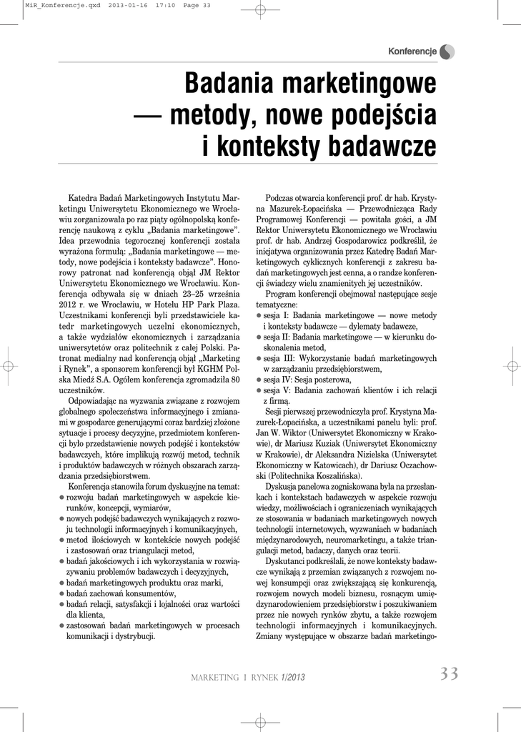 MiR_Konferencje.qxd 2013-01-16 17:10 Page 33 Konferencje Badania marketingowe — metody, nowe podejścia i konteksty badawcze Katedra Badań Marketingowych Instytutu Marketingu Uniwersytetu Ekonomicznego we Wrocławiu zorganizowała po raz piąty ogólnopolską konferencję naukową z cyklu „Badania marketingowe”. Idea przewodnia tegorocznej konferencji została wyrażona formułą: „Badania marketingowe — metody, nowe podejścia i konteksty badawcze”. Honorowy patronat nad konferencją objął JM Rektor Uniwersytetu Ekonomicznego we Wrocławiu. Konferencja odbywała się w dniach 23–25 września 2012 r. we Wrocławiu, w Hotelu HP Park Plaza. Uczestnikami konferencji byli przedstawiciele katedr marketingowych uczelni ekonomicznych, a także wydziałów ekonomicznych i zarządzania uniwersytetów oraz politechnik z całej Polski. Patronat medialny nad konferencją objął „Marketing i Rynek”, a sponsorem konferencji był KGHM Polska Miedź S.A. Ogółem konferencja zgromadziła 80 uczestników. Odpowiadając na wyzwania związane z rozwojem globalnego społeczeństwa informacyjnego i zmianami w gospodarce generującymi coraz bardziej złożone sytuacje i procesy decyzyjne, przedmiotem konferencji było przedstawienie nowych podejść i kontekstów badawczych, które implikują rozwój metod, technik i produktów badawczych w różnych obszarach zarządzania przedsiębiorstwem. Konferencja stanowiła forum dyskusyjne na temat: z rozwoju badań marketingowych w aspekcie kierunków, koncepcji, wymiarów, z nowych podejść badawczych wynikających z rozwoju technologii informacyjnych i komunikacyjnych, z metod ilościowych w kontekście nowych podejść i zastosowań oraz triangulacji metod, z badań jakościowych i ich wykorzystania w rozwiązywaniu problemów badawczych i decyzyjnych, z badań marketingowych produktu oraz marki, z badań zachowań konsumentów, z badań relacji, satysfakcji i lojalności oraz wartości dla klienta, z zastosowań badań marketingowych w procesach komunikacji i dystrybucji. Podczas otwarcia konferencji prof. dr hab. Krystyna Mazurek-Łopacińska — Przewodnicząca Rady Programowej Konferencji — powitała gości, a JM Rektor Uniwersytetu Ekonomicznego we Wrocławiu prof. dr hab. Andrzej Gospodarowicz podkreślił, że inicjatywa organizowania przez Katedrę Badań Marketingowych cyklicznych konferencji z zakresu badań marketingowych jest cenna, a o randze konferencji świadczy wielu znamienitych jej uczestników. Program konferencji obejmował następujące sesje tematyczne: z sesja I: Badania marketingowe — nowe metody i konteksty badawcze — dylematy badawcze, z sesja II: Badania marketingowe — w kierunku doskonalenia metod, z sesja III: Wykorzystanie badań marketingowych w zarządzaniu przedsiębiorstwem, z sesja IV: Sesja posterowa, z sesja V: Badania zachowań klientów i ich relacji z firmą. Sesji pierwszej przewodniczyła prof. Krystyna Mazurek-Łopacińska, a uczestnikami panelu byli: prof. Jan W. Wiktor (Uniwersytet Ekonomiczny w Krakowie), dr Mariusz Kuziak (Uniwersytet Ekonomiczny w Krakowie), dr Aleksandra Nizielska (Uniwersytet Ekonomiczny w Katowicach), dr Dariusz Oczachowski (Politechnika Koszalińska). Dyskusja panelowa zogniskowana była na przesłankach i kontekstach badawczych w aspekcie rozwoju wiedzy, możliwościach i ograniczeniach wynikających ze stosowania w badaniach marketingowych nowych technologii internetowych, wyzwaniach w badaniach międzynarodowych, neuromarketingu, a także triangulacji metod, badaczy, danych oraz teorii. Dyskutanci podkreślali, że nowe konteksty badawcze wynikają z przemian związanych z rozwojem nowej konsumpcji oraz zwiększającą się konkurencją, rozwojem nowych modeli biznesu, rosnącym umiędzynarodowieniem przedsiębiorstw i poszukiwaniem przez nie nowych rynków zbytu, a także rozwojem technologii informacyjnych i komunikacyjnych. Zmiany występujące w obszarze badań marketingo- MARKETING I RYNEK 1/2013 33 MiR_Konferencje.qxd 2013-01-16 17:10 Page 34 Konferencje wych należy także oceniać w kontekście przeobrażeń wywoływanych zmianami cyklu koniunkturalnego oraz adaptowaniem przez podmioty sektora publicznego nowoczesnych metod zarządzania. Uczestnicy tej sesji podkreślali także, że następują zmiany postaw, oczekiwań i zachowań respondentów. Zwiększająca się zmienność i złożoność otoczenia rynkowego sprawia, że badanie zjawisk i procesów rynkowych wymaga stosowania w procesie badawczym nowych podejść i przyjmowania różnych perspektyw metodologicznych. Uczestnicy panelu, wskazując na przemiany zachodzące w obszarze badań marketingowych, do głównych kierunków zmian zaliczyli rosnące umiędzynarodowienie badań marketingowych oraz rozwój sposobów integracji podejść jakościowych i ilościowych w postępowaniu badawczym, zwiększające się znaczenie triangulacji, a także rozwój badań marketingowych prowadzonych z wykorzystaniem Internetu i potencjału interaktywności w poznawaniu nowych trendów w zachowaniach konsumenckich. Zwrócono uwagę, że zdecentralizowany charakter Internetu powoduje spore problemy w pomiarze rzeczywistego wykorzystania i demografii użytkowników. Pomimo wprowadzania zmian i ulepszeń, pomiar audytorium Internetu nie zaspokaja potrzeb i wymagań rynku. Zgodnie z wynikami konsultacji branży internetowej pożądane zmiany w badaniu dotyczą czasu dostępności wyników na rynku, lepszej rozdzielczości czasowej wyników, kategoryzacji tematyczno-funkcjonalnej witryn, stosowania wspólnych wskaźników dla całego Internetu i pomiaru wyłącznie rzeczywistego, aktywnego korzystania z Internetu. Uczestnicy panelu wskazywali także na trudności występujące w procesie badań nad internacjonalizacją przedsiębiorstw, które dotyczą szczególnie metodyki, problemów zapewnienia ekwiwalencji, procesu realizacji badań, składu, a także wielkości zespołu badawczego. Odnoszono się także do badań