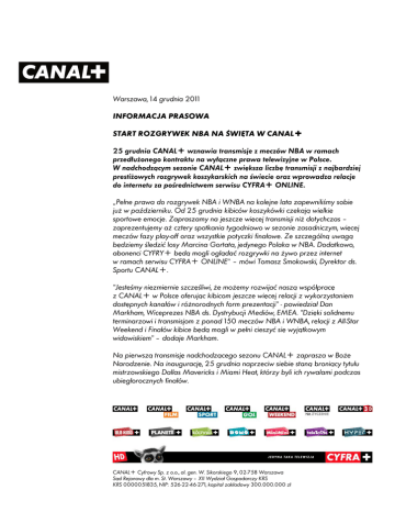 Warszawa, 14 grudnia 2011 INFORMACJA PRASOWA START ROZGRYWEK NBA NA ŚWIĘTA W CANAL+ 25 grudnia CANAL+ wznawia transmisje z meczów NBA w ramach przedłużonego kontraktu na wyłączne prawa telewizyjne w Polsce. W nadchodzącym sezonie CANAL+ zwiększa liczbę transmisji z najbardziej prestiżowych rozgrywek koszykarskich na świecie oraz wprowadza relacje do internetu za pośrednictwem serwisu CYFRA+ ONLINE. „Pełne prawa do rozgrywek NBA i WNBA na kolejne lata zapewniliśmy sobie już w październiku. Od 25 grudnia kibiców koszykówki czekają wielkie sportowe emocje. Zapraszamy na jeszcze więcej transmisji niż dotychczas – zaprezentujemy aż cztery spotkania tygodniowo w sezonie zasadniczym, więcej meczów fazy play-off oraz wszystkie potyczki finałowe. Ze szczególną uwagą będziemy śledzić losy Marcina Gortata, jedynego Polaka w NBA. Dodatkowo, abonenci CYFRY+ będą mogli oglądać rozgrywki na żywo przez internet w ramach serwisu CYFRA+ ONLINE” – mówi Tomasz Smokowski, Dyrektor ds. Sportu CANAL+. "Jesteśmy niezmiernie szczęśliwi, że możemy rozwijać naszą współpracę z CANAL+ w Polsce oferując kibicom jeszcze więcej relacji z wykorzystaniem dostępnych kanałów i różnorodnych form prezentacji" - powiedział Dan Markham, Wiceprezes NBA ds. Dystrybucji Mediów, EMEA. "Dzięki solidnemu terminarzowi i transmisjom z ponad 150 meczów NBA i WNBA, relacji z All-Star Weekend i Finałów kibice będą mogli w pełni cieszyć się wyjątkowym widowiskiem" – dodaje Markham. Na pierwszą transmisję nadchodzącego sezonu CANAL+ zaprasza w Boże Narodzenie. Na inaugurację, 25 grudnia naprzeciw siebie staną broniący tytułu mistrzowskiego Dallas Mavericks i Miami Heat, którzy byli ich rywalami podczas ubiegłorocznych finałów. CANAL+ Cyfrowy Sp. z o.o., al. gen. W. Sikorskiego 9, 02-758 Warszawa Sąd Rejonowy dla m. St. Warszawy – XII Wydział Gospodarczy KRS KRS 0000051835, NIP: 526-22-46-271, kapitał zakładowy 300.000.000 zł Sezon zasadniczy potrwa do 26 kwietnia, dwa dni później rozpoczną się relacje z NBA Playoffs, a następnie transmisje ze spotkań finałowych. Obok regularnych transmisji w nadchodzącym sezonie tylko w CANAL+ będą też prezentowane pełne relacje z lutowego weekendu gwiazd NBA (All Star Weekend) oraz specjalne programy relacjonowane w dniu Martina Luthera Kinga. Raz w tygodniu nadawany będzie magazyn poświęcony rozgrywkom NBA, wielokrotnie nagradzany „NBA Action". O rozgrywkach będzie też mowa w nowym, codziennym i autorskim programie CANAL+ zatytułowanym BASKET+. PIERWSZE TRANSMISJE NBA W SEZONIE 2011/2012 CANAL+ SPORT HD niedziela, 25 grudnia, 20:30 Dallas Mavericks – Miami Heat niedziela, 25 grudnia, 23:00 Los Angeles Lakers – Chicago Bulls wtorek, 27 grudnia, 02:00 Miami Heat – Boston Celtics piątek, 30 grudnia, 02:00 New Orleans Hornets – Phoenix Suns CANAL+ Sport to jedyny w Polsce sportowy kanał premium. Oferuje najbardziej prestiżowe rozgrywki sportowe na żywo, na wyłączność i w najwyższych standardach emisyjnych - HD i 3D. Stacja posiada najlepszą na rynku ofertę praw piłkarskich. Relacjonuje 100% meczów T-Mobile Ekstraklasy oraz czterech najlepszych lig europejskich: angielskiej, hiszpańskiej, włoskiej i francuskiej. Transmituje także najbardziej prestiżowe spotkania koszykarskich lig NBA, WNBA i Euroligi oraz zawody żużlowe, w tym Grand Prix i Drużynowy Puchar Świata. Ponadto, pokazuje Puchar Sześciu Narodów w rugby i liczne gale bokserskie. Stacja słynie z profesjonalnej ekipy komentatorskiej i autorskich magazynów sportowych, m.in. Liga+, Liga+ Extra i Sport+ Extra. Sportowa oferta dostępna jest na czterech kanałach premium: CANAL+, CANAL+ SPORT, CANAL+ GOL i CANAL+ Weekend. Producentem i nadawcą CANAL+ Sport jest CANAL+ Cyfrowy, operator platformy CYFRA+ i nadawca kanałów telewizyjnych HD: ale kino+, PLANETE+, MiniMini+, teleTOON+/HYPER+, Kuchnia+, Domo+. Więcej na www.canalplus.pl/sport i www.facebook.com/canalplussport CANAL+ Cyfrowy Sp. z o.o., al. gen. W. Sikorskiego 9, 02-758 Warszawa Sąd Rejonowy dla m. St. Warszawy – XII Wydział Gospodarczy KRS KRS 0000051835, NIP: 526-22-46-271, kapitał zakładowy 300.000.000 zł O NBA: NBA to założona w 1946 r. zawodowa liga sportowa i firma o zasięgu międzynarodowym składająca się z 30 drużyn w Stanach Zjednoczonych i Kanadzie. W sezonie 2010-11, rozgrywki NBA docierały do 215 państw i terytoriów, i transmitowane były w ponad 40 językach. Harmonogram meczów NBA rozgrywanych na koniec sezonu obejmował 85 graczy z 41 krajów i terytoriów. Towary opatrzone marką NBA sprzedawane są w ponad 125.000 sklepów i 100 krajach na sześciu kontynentach. Strona NBA.com ma średnio 26 milionów odsłon dziennie, a ponad 50 procent odwiedzających serwis pochodzi spoza Ameryki Północnej. NBA jest amerykańską ligą sportową nr 1 w serwisach: Facebook, Twitter i YouTube, z największą liczbą fanów i obserwujących oraz oglądanych filmów, odpowiednio dla każdej ze stron. Za pośrednictwem NBA Cares, liga, jej drużyny i gracze przekazali ponad 165 milionów dolarów na cele dobroczynne, spędzili ponad 1,7 milionów godzin aktywnie wykonując prace społeczne, oraz stworzyli ponad 615 miejsc, gdzie dzieci i rodziny mogą mieszkać, uczyć się i bawić. KONTAKT: Michał Obrębski PR Manager – Biuro Prasowe CANAL+ tel. (022) 33 10 698, [email protected] www.canalplus.pl/sport, www.facebook.com/canalplussport CANAL+ Cyfrowy Sp. z o.o., al. gen. W. Sikorskiego 9, 02-758 Warszawa Sąd Rejonowy dla m. St. Warszawy – XII Wydział Gospodarczy KRS KRS 0000051835, NIP: 526-22-46-271, kapitał zakładowy 300.000.000 zł