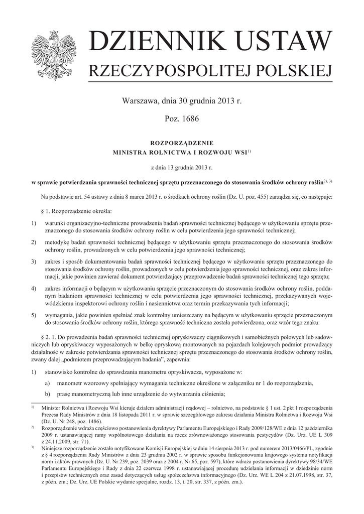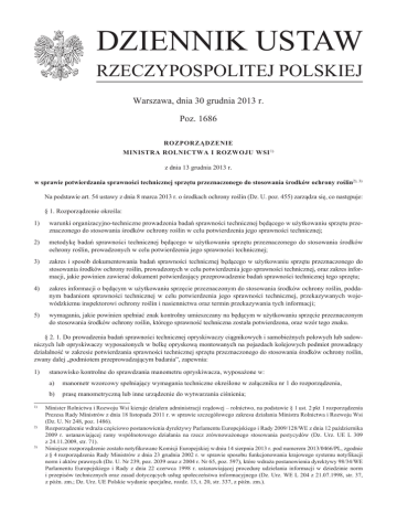 DZIENNIK USTAW RZECZYPOSPOLITEJ POLSKIEJ Warszawa, dnia 30 grudnia 2013 r. Poz. 1686 Rozporządzenie Ministra Rolnictwa i Rozwoju Wsi 1) z dnia 13 grudnia 2013 r. w sprawie potwierdzania sprawności technicznej sprzętu przeznaczonego do stosowania środków ochrony roślin2), 3) Na podstawie art. 54 ustawy z dnia 8 marca 2013 r. o środkach ochrony roślin (Dz. U. poz. 455) zarządza się, co następuje: § 1. Rozporządzenie określa: 1)warunki organizacyjno-techniczne prowadzenia badań sprawności technicznej będącego w użytkowaniu sprzętu przeznaczonego do stosowania środków ochrony roślin w celu potwierdzenia jego sprawności technicznej; 2)metodykę badań sprawności technicznej będącego w użytkowaniu sprzętu przeznaczonego do stosowania środków ochrony roślin, prowadzonych w celu potwierdzenia jego sprawności technicznej; 3)zakres i sposób dokumentowania badań sprawności technicznej będącego w użytkowaniu sprzętu przeznaczonego do stosowania środków ochrony roślin, prowadzonych w celu potwierdzenia jego sprawności technicznej, oraz zakres informacji, jakie powinien zawierać dokument potwierdzający przeprowadzenie badań sprawności technicznej tego sprzętu; 4)zakres informacji o będącym w użytkowaniu sprzęcie przeznaczonym do stosowania środków ochrony roślin, poddanym badaniom sprawności technicznej w celu potwierdzenia jego sprawności technicznej, przekazywanych wojewódzkiemu inspektorowi ochrony roślin i nasiennictwa oraz termin przekazywania tych informacji; 5)wymagania, jakie powinien spełniać znak kontrolny umieszczany na będącym w użytkowaniu sprzęcie przeznaczonym do stosowania środków ochrony roślin, którego sprawność techniczna została potwierdzona, oraz wzór tego znaku. § 2. 1. Do prowadzenia badań sprawności technicznej opryskiwaczy ciągnikowych i samobieżnych polowych lub sadowniczych lub opryskiwaczy wyposażonych w belkę opryskową montowanych na pojazdach kolejowych podmiot prowadzący działalność w zakresie potwierdzania sprawności technicznej sprzętu przeznaczonego do stosowania środków ochrony roślin, zwany dalej „podmiotem przeprowadzającym badania”, zapewnia: 1)stanowisko kontrolne do sprawdzania manometru opryskiwacza, wyposażone w: a)manometr wzorcowy spełniający wymagania techniczne określone w załączniku nr 1 do rozporządzenia, b)prasę manometryczną lub inne urządzenie do wytwarzania ciśnienia; Minister Rolnictwa i Rozwoju Wsi kieruje działem administracji rządowej – rolnictwo, na podstawie § 1 ust. 2 pkt 1 rozporządzenia Prezesa Rady Ministrów z dnia 18 listopada 2011 r. w sprawie szczegółowego zakresu działania Ministra Rolnictwa i Rozwoju Wsi (Dz. U. Nr 248, poz. 1486). 2) Rozporządzenie wdraża częściowo postanowienia dyrektywy Parlamentu Europejskiego i Rady 2009/128/WE z dnia 12 października 2009 r. ustanawiającej ramy wspólnotowego działania na rzecz zrównoważonego stosowania pestycydów (Dz. Urz. UE L 309 z 24.11.2009, str. 71). 3) Niniejsze rozporządzenie zostało notyfikowane Komisji Europejskiej w dniu 14 sierpnia 2013 r. pod numerem 2013/0466/PL, zgodnie z § 4 rozporządzenia Rady Ministrów z dnia 23 grudnia 2002 r. w sprawie sposobu funkcjonowania krajowego systemu notyfikacji norm i aktów prawnych (Dz. U. Nr 239, poz. 2039 oraz z 2004 r. Nr 65, poz. 597), które wdraża postanowienia dyrektywy 98/34/WE Parlamentu Europejskiego i Rady z dnia 22 czerwca 1998 r. ustanawiającej procedurę udzielania informacji w dziedzinie norm i przepisów technicznych oraz zasad dotyczących usług społeczeństwa informacyjnego (Dz. Urz. WE L 204 z 21.07.1998, str. 37, z późn. zm.; Dz. Urz. UE Polskie wydanie specjalne, rozdz. 13, t. 20, str. 337, z późn. zm.). 1) Dziennik Ustaw –2– Poz. 1686 2)przymiar wstęgowy, stoper i kalkulator; 3)przyrząd do nanoszenia numerów na ramę opryskiwacza; 4)w przypadku opryskiwaczy ciągnikowych i samobieżnych polowych – dodatkowo: a)sprzęt diagnostyczny do sprawdzania dystrybucji cieczy w postaci: – ręcznego lub elektronicznego stołu rowkowego do sprawdzania rozkładu poprzecznego cieczy, spełniającego wymagania techniczne określone w załączniku nr 2 do rozporządzenia, lub – urządzenia do pomiaru natężenia wypływu cieczy z rozpylaczy, spełniającego wymagania techniczne określone w załączniku nr 2 do rozporządzenia, oraz – co najmniej 2 manometrów do pomiaru ciśnienia roboczego w sekcjach belki polowej opryskiwacza, spełniających wymagania techniczne dla manometru wzorcowego, określone w załączniku nr 1 do rozporządzenia, b)zbiornik do zbierania cieczy wykorzystanej do badania, c)5 cylindrów miarowych o pojemności wynoszącej co najmniej 2000 ml, działce elementarnej wynoszącej nie więcej niż 20 ml i dopuszczalnym błędzie granicznym pomiaru wynoszącym ±20 ml; 5)w przypadku opryskiwaczy ciągnikowych i samobieżnych sadowniczych – dodatkowo urządzenie umożliwiające jednoczesny pomiar natężenia wypływu cieczy co najmniej z: a)20 rozpylaczy zainstalowanych na sekcji opryskowej opryskiwaczy używanych do zabiegów środkami ochrony roślin w uprawie chmielu albo b)12 rozpylaczy zainstalowanych na sekcji opryskowej opryskiwaczy używanych do zabiegów środkami ochrony roślin w uprawach sadowniczych innych niż uprawa chmielu; 6)w przypadku opryskiwaczy wyposażonych w belkę opryskową montowanych na pojazdach kolejowych – dodatkowo: a)sprzęt diagnostyczny do sprawdzania dystrybucji cieczy w postaci urządzenia do pomiaru natężenia wypływu cieczy z rozpylaczy, spełniającego wymagania techniczne określone w załączniku nr 2 do rozporządzenia, oraz co najmniej 2 manometrów do pomiaru ciśnienia roboczego w sekcjach belki polowej opryskiwacza, spełniających wymagania techniczne dla manometru wzorcowego, określone w załączniku nr 1 do rozporządzenia, b)zbiornik do zbierania cieczy wykorzystanej do badania, c)5 cylindrów miarowych o pojemności