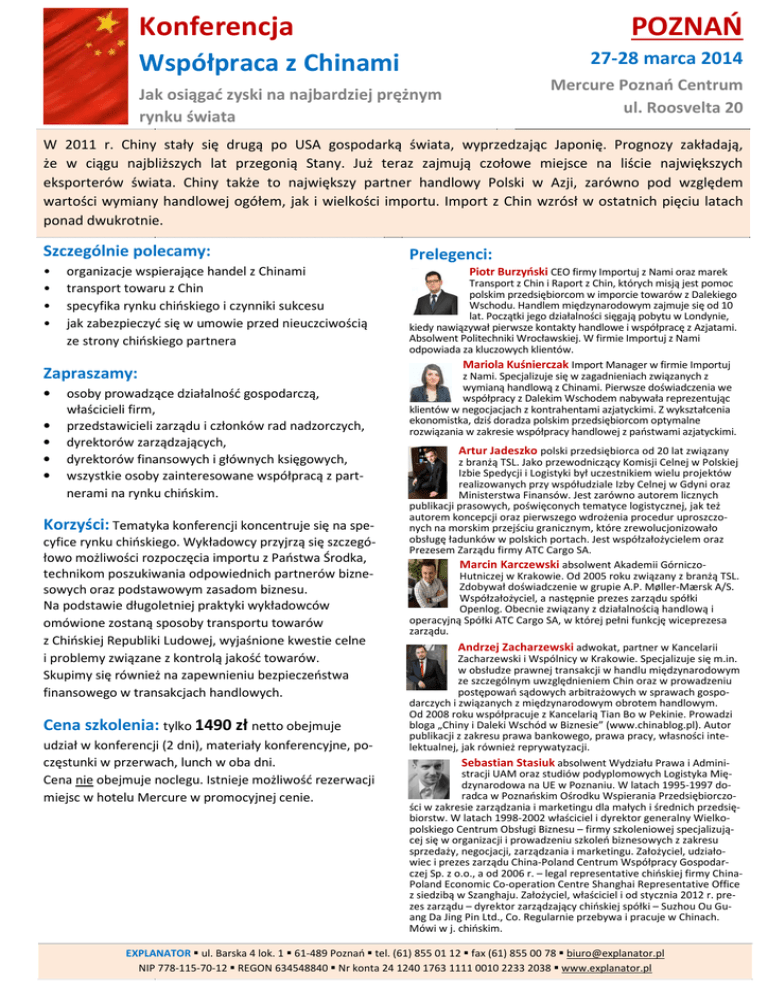 Konferencja POZNAŃ 27-28 marca 2014 Współpraca z Chinami Mercure Poznań Centrum ul. Roosvelta 20 Jak osiągać zyski na najbardziej prężnym rynku świata W 2011 r. Chiny stały się drugą po USA gospodarką świata, wyprzedzając Japonię. Prognozy zakładają, że w ciągu najbliższych lat przegonią Stany. Już teraz zajmują czołowe miejsce na liście największych eksporterów świata. Chiny także to największy partner handlowy Polski w Azji, zarówno pod względem wartości wymiany handlowej ogółem, jak i wielkości importu. Import z Chin wzrósł w ostatnich pięciu latach ponad dwukrotnie. Szczególnie polecamy: Prelegenci: • • • • Piotr Burzyński CEO firmy Importuj z Nami oraz marek Transport z Chin i Raport z Chin, których misją jest pomoc polskim przedsiębiorcom w imporcie towarów z Dalekiego Wschodu. Handlem międzynarodowym zajmuje się od 10 lat. Początki jego działalności sięgają pobytu w Londynie, kiedy nawiązywał pierwsze kontakty handlowe i współpracę z Azjatami. Absolwent Politechniki Wrocławskiej. W firmie Importuj z Nami odpowiada za kluczowych klientów. Mariola Kuśnierczak Import Manager w firmie Importuj z Nami. Specjalizuje się w zagadnieniach związanych z wymianą handlową z Chinami. Pierwsze doświadczenia we współpracy z Dalekim Wschodem nabywała reprezentując klientów w negocjacjach z kontrahentami azjatyckimi. Z wykształcenia ekonomistka, dziś doradza polskim przedsiębiorcom optymalne rozwiązania w zakresie współpracy handlowej z państwami azjatyckimi. organizacje wspierające handel z Chinami transport towaru z Chin specyfika rynku chińskiego i czynniki sukcesu jak zabezpieczyć się w umowie przed nieuczciwością ze strony chińskiego partnera Zapraszamy: • • • • • osoby prowadzące działalność gospodarczą, właścicieli firm, przedstawicieli zarządu i członków rad nadzorczych, dyrektorów zarządzających, dyrektorów finansowych i głównych księgowych, wszystkie osoby zainteresowane współpracą z partnerami na rynku chińskim. Korzyści: Tematyka konferencji koncentruje się na specyfice rynku chińskiego. Wykładowcy przyjrzą się szczegółowo możliwości rozpoczęcia importu z Państwa Środka, technikom poszukiwania odpowiednich partnerów biznesowych oraz podstawowym zasadom biznesu. Na podstawie długoletniej praktyki wykładowców omówione zostaną sposoby transportu towarów z Chińskiej Republiki Ludowej, wyjaśnione kwestie celne i problemy związane z kontrolą jakość towarów. Skupimy się również na zapewnieniu bezpieczeństwa finansowego w transakcjach handlowych. Cena szkolenia: tylko 1490 zł netto obejmuje udział w konferencji (2 dni), materiały konferencyjne, poczęstunki w przerwach, lunch w oba dni. Cena nie obejmuje noclegu. Istnieje możliwość rezerwacji miejsc w hotelu Mercure w promocyjnej cenie. Artur Jadeszko polski przedsiębiorca od 20 lat związany z branżą TSL. Jako przewodniczący Komisji Celnej w Polskiej Izbie Spedycji i Logistyki był uczestnikiem wielu projektów realizowanych przy współudziale Izby Celnej w Gdyni oraz Ministerstwa Finansów. Jest zarówno autorem licznych publikacji prasowych, poświęconych tematyce logistycznej, jak też autorem koncepcji oraz pierwszego wdrożenia procedur uproszczonych na morskim przejściu granicznym, które zrewolucjonizowało obsługę ładunków w polskich portach. Jest współzałożycielem oraz Prezesem Zarządu firmy ATC Cargo SA. Marcin Karczewski absolwent Akademii GórniczoHutniczej w Krakowie. Od 2005 roku związany z branżą TSL. Zdobywał doświadczenie w grupie A.P. Møller-Mærsk A/S. Współzałożyciel, a następnie prezes zarządu spółki Openlog. Obecnie związany z działalnością handlową i operacyjną Spółki ATC Cargo SA, w której pełni funkcję wiceprezesa zarządu. Andrzej Zacharzewski adwokat, partner w Kancelarii Zacharzewski i Wspólnicy w Krakowie. Specjalizuje się m.in. w obsłudze prawnej transakcji w handlu międzynarodowym ze szczególnym uwzględnieniem Chin oraz w prowadzeniu postępowań sądowych arbitrażowych w sprawach gospodarczych i związanych z międzynarodowym obrotem handlowym. Od 2008 roku współpracuje z Kancelarią Tian Bo w Pekinie. Prowadzi bloga „Chiny i Daleki Wschód w Biznesie” (www.chinablog.pl). Autor publikacji z zakresu prawa bankowego, prawa pracy, własności intelektualnej, jak również reprywatyzacji. Sebastian Stasiuk absolwent Wydziału Prawa i Administracji UAM oraz studiów podyplomowych Logistyka Międzynarodowa na UE w Poznaniu. W latach 1995-1997 doradca w Poznańskim Ośrodku Wspierania Przedsiębiorczości w zakresie zarządzania i marketingu dla małych i średnich przedsiębiorstw. W latach 1998-2002 właściciel i dyrektor generalny Wielkopolskiego Centrum Obsługi Biznesu – firmy szkoleniowej specjalizującej się w organizacji i prowadzeniu szkoleń biznesowych z zakresu sprzedaży, negocjacji, zarządzania i marketingu. Założyciel, udziałowiec i prezes zarządu China-Poland Centrum Współpracy Gospodarczej Sp. z o.o., a od 2006 r. – legal representative chińskiej firmy ChinaPoland Economic Co-operation Centre Shanghai Representative Office z siedzibą w Szanghaju. Założyciel, właściciel i od stycznia 2012 r. prezes zarządu – dyrektor zarządzający chińskiej spółki – Suzhou Ou Guang Da Jing Pin Ltd., Co. Regularnie przebywa i pracuje w Chinach. Mówi w j. chińskim. EXPLANATOR ul. Barska 4 lok. 1 61-489 Poznań tel. (61) 855 01 12 fax (61) 855 00 78 [email protected] NIP 778-115-70-12 REGON 634548840 Nr konta 24 1240 1763 1111 0010 2233 2038 www.explanator.pl Plan konferencji: DZIEŃ I: 9.30 – 17.00 BLOK I: PRZED NAWIĄZANIEM WSPÓŁPRACY 1. Od czego zacząć przygodę z Państwem Środka • wsparcie ze strony polskich władz • organizacje wspierające handel z Państwem Środka • chińskie instytucje wspierające wymianę handlową • targi handlowe i organizacje branżowe 