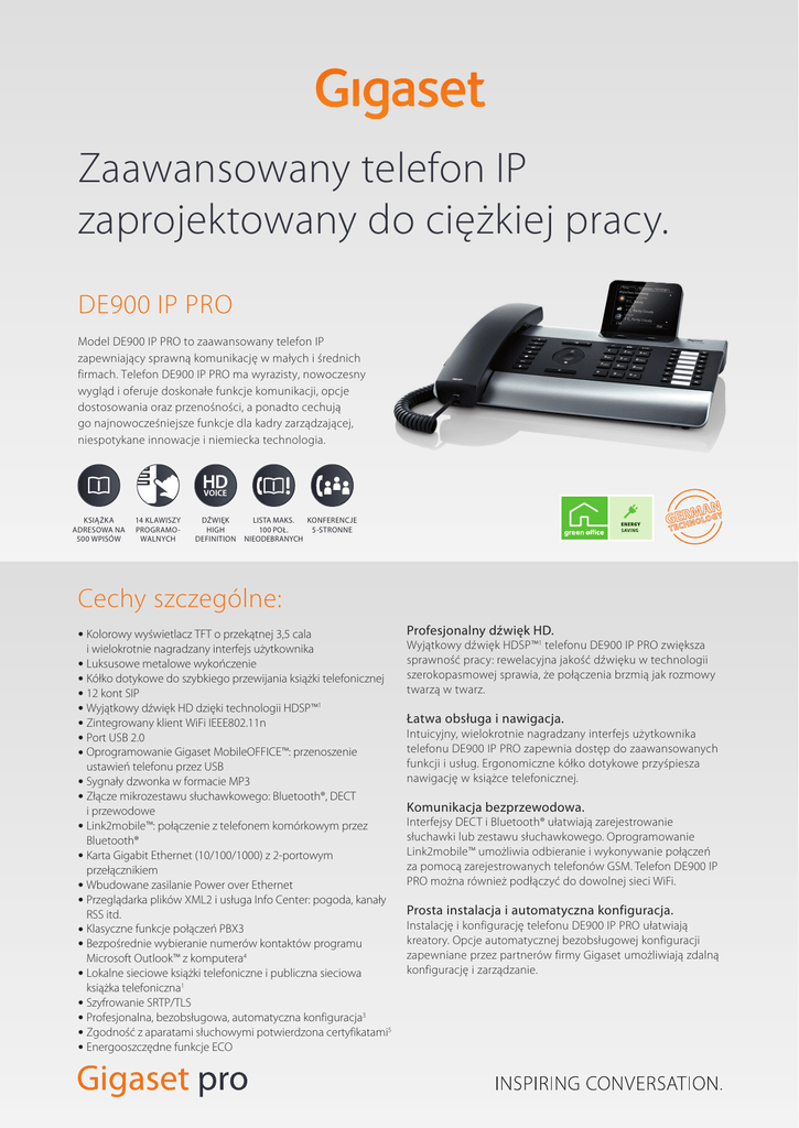 Zaawansowany telefon IP zaprojektowany do ciężkiej pracy. DE900 IP PRO Model DE900 IP PRO to zaawansowany telefon IP zapewniający sprawną komunikację w małych i średnich firmach. Telefon DE900 IP PRO ma wyrazisty, nowoczesny wygląd i oferuje doskonałe funkcje komunikacji, opcje dostosowania oraz przenośności, a ponadto cechują go najnowocześniejsze funkcje dla kadry zarządzającej, niespotykane innowacje i niemiecka technologia. KSIĄŻKA ADRESOWA NA 500 WPISÓW 14 KLAWISZY PROGRAMOWALNYCH DŹWIĘK HIGH DEFINITION LISTA MAKS. KONFERENCJE 100 POŁ. 5-STRONNE NIEODEBRANYCH Cechy szczególne: • Kolorowy wyświetlacz TFT o przekątnej 3,5 cala i wielokrotnie nagradzany interfejs użytkownika • Luksusowe metalowe wykończenie • Kółko dotykowe do szybkiego przewijania książki telefonicznej • 12 kont SIP • Wyjątkowy dźwięk HD dzięki technologii HDSP™ • Zintegrowany klient WiFi IEEE802.11n • Port USB 2.0 • Oprogramowanie Gigaset MobileOFFICE™: przenoszenie ustawień telefonu przez USB • Sygnały dzwonka w formacie MP3 • Złącze mikrozestawu słuchawkowego: Bluetooth®, DECT i przewodowe • Link2mobile™: połączenie z telefonem komórkowym przez Bluetooth® • Karta Gigabit Ethernet (10/100/1000) z 2-portowym przełącznikiem • Wbudowane zasilanie Power over Ethernet • Przeglądarka plików XML2 i usługa Info Center: pogoda, kanały RSS itd. • Klasyczne funkcje połączeń PBX3 • Bezpośrednie wybieranie numerów kontaktów programu Microsoft Outlook™ z komputera • Lokalne sieciowe książki telefoniczne i publiczna sieciowa książka telefoniczna • Szyfrowanie SRTP/TLS • Profesjonalna, bezobsługowa, automatyczna konfiguracja • Zgodność z aparatami słuchowymi potwierdzona certyfikatami • Energooszczędne funkcje ECO Profesjonalny dźwięk HD. Wyjątkowy dźwięk HDSP™1 telefonu DE900 IP PRO zwiększa sprawność pracy: rewelacyjna jakość dźwięku w technologii szerokopasmowej sprawia, że połączenia brzmią jak rozmowy twarzą w twarz. 1 4 1 3 5 Łatwa obsługa i nawigacja. Intuicyjny, wielokrotnie nagradzany interfejs użytkownika telefonu DE900 IP PRO zapewnia dostęp do zaawansowanych funkcji i usług. Ergonomiczne kółko dotykowe przyśpiesza nawigację w książce telefonicznej. Komunikacja bezprzewodowa. Interfejsy DECT i Bluetooth® ułatwiają zarejestrowanie słuchawki lub zestawu słuchawkowego. Oprogramowanie Link2mobile™ umożliwia odbieranie i wykonywanie połączeń za pomocą zarejestrowanych telefonów GSM. Telefon DE900 IP PRO można również podłączyć do dowolnej sieci WiFi. Prosta instalacja i automatyczna konfiguracja. Instalację i konfigurację telefonu DE900 IP PRO ułatwiają kreatory. Opcje automatycznej bezobsługowej konfiguracji zapewniane przez partnerów firmy Gigaset umożliwiają zdalną konfigurację i zarządzanie. DE900 IP PRO Zaawansowany telefon IP dla małych i średnich firm. Dane techniczne Komunikacja Audio • Z łącze zestawu słuchawkowego – Bluetooth®, DECT lub standardowy jack RJ-9 • S zerokopasmowy dźwięk HD zgodny z normą TIA/EIA-920 HDSP™ , G.722 • P ełnodupleksowy głośnik o znakomitej jakości dźwięku: bardzo duży rezonator w podstawie aparatu • R egulowana głośność: głośnika, słuchawki przewodowej i zestawów słuchawkowych oraz 10-poziomowy dzwonek • Z godność z aparatami słuchowymi (HAC) zgodnie z normą FCC • S ygnały dzwonka w formacie MP3 Wszechstronny zestaw opcji komunikacji zapewnia sprawność i przenośność profesjonalnej komunikacji. DECT HANDSET ADD UP TO 3 EXTENSION MODULES LINK2MOBILE™ DE900 IP PRO COMPUTER HEADSET BT HEADSET 1 WiFi INTERNET ACCESS GATEWAY LAN 5 GIGASET PBX T500 PRO Ekran i interfejs użytkownika • P odświetlany kolorowy wyświetlacz TFT o przekątnej 3,5 cala i rozdzielczości 320 x 240 pikseli • W ielokrotnie nagradzany (np. nagrodą iF Communications Design Award) interfejs użytkownika oparty na ikonach • P rzyciemniane podświetlenie ekranu (siedem poziomów) • T ryb nocny: sterowane czasowo wyłączanie ekranu w celu oszczędzania energii • D ostosowywany wygaszacz ekranu: zdjęcia, logotypy, pokazy slajdów, zegar analogowy lub cyfrowy itd. • O bsługa wielu języków Książka telefoniczna i wybieranie numerów • K siążka adresowa na 500 wpisów vCard ze zdjęciami w pamięci wewnętrznej – więcej przez USB • E lementy wpisów vCard: imię i nazwisko, firma, stanowisko, • • • • • • • • • • • • • • 8 numerów telefonów, zdjęcie, adres e-mail, witryna internetowa, adres, urodziny, notatka, strefa czasowa Edycja książki adresowej w menedżerze połączeń S zybkie wyszukiwanie: znaków lub pełnego tekstu P rzewijane wizytówki vCard ze zdjęciami K lawisz nagrywania głosu: w pamięci wewnętrznej (MP3), na dysku USB lub na zewnętrznym serwerze S ynchronizacja książki adresowej z komputerem4 L okalne sieciowe książki telefoniczne i dostęp do publicznych sieciowych książek telefonicznych1 W yszukiwanie w publicznych książkach telefonicznych i spisie firm; wyszukiwanie odwrotne, wyszukiwanie automatyczne1 P rywatna sieciowa książka telefoniczna O bsługa usługi LDAP (sieciowej firmowej książki telefonicznej) A utomatyczne wyszukiwanie w sieci Identyfikacja rozmówcy1 ze zdjęciem, lokalizacją i strefą czasową E dycja numeru przed wybraniem L ink2mobile™: wykonywanie i odbieranie połączeń na telefonie GSM B ezpośrednie wybieranie numerów kontaktów programu Outlook4 DECT HEADSET • L ista maks. 100 nieodebranych połączeń z identyfikatorem osoby dzwoniącej i czasem próby połączenia • K onferencje pięciostronne • 1 2 linii równolegle z oddzielnymi identyfikatorami osób dzwoniących • 1 2 kont sieciowej poczty głosowej • W yświetlanie czasu połączenia, nazwiska i numeru • A utomatyczne ponowne wybieranie numeru, ponowne wybieranie numeru ze spisu połączeń i przy zajętości • P o