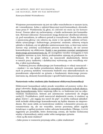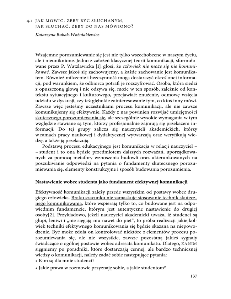 4.1 J A K M Ó W I Ć , Ż E B Y B Y Ć S Ł U C H A N Y M , JAK SŁUCHAĆ, ŻEBY DO NAS MÓWIONO? Katarzyna Bubak-Woźniakiewicz Wzajemne porozumiewanie się jest nie tylko wszechobecne w naszym życiu, ale i nieuniknione. Jedno z założeń klasycznej teorii komunikacji, sformułowane przez P. Watzlawicka [1], głosi, że człowiek nie może się nie komunikować. Zawsze jakoś się zachowujemy, a każde zachowanie jest komunikatem. Również milczenie i bezczynność mogą dostarczyć określonej informacji, pod warunkiem, że odbiorca potrafi je rozszyfrować. Osoba, która siedzi z opuszczoną głową i nie odzywa się, może w ten sposób, zależnie od kontekstu sytuacyjnego i kulturowego, przejawiać: znużenie, odmowę wzięcia udziału w dyskusji, czy też głębokie zainteresowanie tym, co ktoś inny mówi. Zawsze więc jesteśmy uczestnikami procesu komunikacji, ale nie zawsze komunikujemy się efektywnie. Każdy z nas powinien rozwijać umiejętności skutecznego porozumiewania się, ale szczególnie wysokie wymagania w tym względzie stawiane są tym, którzy profesjonalnie zajmują się przekazem informacji. Do tej grupy zalicza się nauczycieli akademickich, którzy w ramach pracy naukowej i dydaktycznej wytwarzają oraz weryfikują wiedzę, a także ją przekazują. Podstawą procesu edukacyjnego jest komunikacja w relacji nauczyciel – – student i to ona będzie przedmiotem dalszych rozważań, uporządkowanych za pomocą metafory wznoszenia budowli oraz ukierunkowanych na poszukiwanie odpowiedzi na pytania o fundamenty skutecznego porozumiewania się, elementy konstrukcyjne i sposób budowania porozumienia. Nastawienie wobec studenta jako fundament efektywnej komunikacji Efektywność komunikacji zależy przede wszystkim od postawy wobec drugiego człowieka. Braku szacunku nie zamaskuje stosowanie technik skutecznego komunikowania, które wspierają tylko to, co budowane jest na odpowiednim fundamencie, którym jest autentyczne nastawienie do drugiej osoby[2]. Przykładowo, jeżeli nauczyciel akademicki uważa, iż studenci są głupi, leniwi i „nie sięgają mu nawet do pięt”, to próba realizacji jakiejkolwiek techniki efektywnego komunikowania się będzie skazana na niepowodzenie. Być może zdoła on kontrolować niektóre z elementów procesu porozumiewania się, ale nie wszystkie, zawsze pozostaną jakieś sygnały świadczące o ogólnej postawie wobec adresata komunikatu. Dlatego, ZANIM sięgniemy po poradniki, które dostarczają cennej, ale bardzo technicznej wiedzy o komunikacji, należy zadać sobie następujące pytania: • Kim są dla mnie studenci? • Jakie prawa w rozmowie przyznaję sobie, a jakie studentom? 137 • Czy uznaję obydwie strony procesu komunikacji za równoważnych uczestników? • Jakie inne potrzeby (np. prestiżu, władzy, aprobaty społecznej – czyli poczucia, że inni mnie lubią), poza przekazem informacji, próbuję zaspokoić w relacji ze studentami? Udzielić odpowiedzi może tylko ten, kto zna samego siebie. Samopoznanie jest bardzo trudne i należy je rozpatrywać jako zadanie na całe życie. Jednak bez rozeznania we własnych przeżyciach psychicznych, nie można zrozumieć tego, co dzieje się na płaszczyźnie interpersonalnej. Elementy konstrukcyjne komunikacji interpersonalnej Proces komunikacji najlepiej opisywać poprzez charakterystykę jego poszczególnych elementów, na które składają się: • kontekst, • uczestnicy (nadawca/odbiorca), • komunikat, • kanał komunikacyjny, • szum informacyjny, • sprzężenie zwrotne, • kodowanie i dekodowanie [3]. Rys. 1. Model komunikacji interpersonalnej Wzajemne powiązania między tymi elementami ukazuje powyższy schemat. Na potrzeby tego podręcznika można przyjąć, iż komunikacja polega na porozumiewaniu się jednostek lub jednostki i grupy w celu wymiany myśli, dzielenia się wiedzą i ideami w sposób werbalny i niewerbalny. Dodatkowo w kontakcie międzyludzkim dochodzi do przekazu (intencjonalnego lub niezamierzonego) emocji. Proces komunikacji osadzony jest w określonym kontekście: 1) fizycznym (miejsce, czas, temperatura, światło itp.), 2) historycznym (odwołanie się uczestników do epizodów z przeszłości), 3) kulturowym (system wiedzy, zwyczajów, wartości), 4) psychologicznym (charakter relacji pomiędzy uczestnikami komunikacji, np. formalna/nieformalna)[3]. Te wszystkie czynniki decydują o tym, czy rozmówcy zdołają się zrozumieć i czy osiągną współpracę. Przy założeniu, że komunikacja polega na przesyłaniu komunikatów werbalnych i niewerbalnych, możemy uznać, że jej uczestnicy odgrywają jednocześnie role nadawców i odbiorców. Rozmówcy, co prawda mówią na 138 zmianę, ale słuchacz zawsze w jakiś sposób reaguje na komunikat, który odbiera (np. potakując, kiwa głową, bije brawo). Obydwie strony przesyłają do siebie informacje w trakcie całego procesu komunikacji. Jak już wyżej wspomniano komunikat jest zakodowaną informacją. Nadawca dokonuje przełożenia swoich myśli, emocji, idei na znaki i symbole. Posługuje się w sposób bardziej lub mniej świadomy kodem werbalnym: • pisemnym • ustnym i niewerbalnym: • gestykulacja – ruchy rąk, dłoni, palców, stóp, głowy i korpusu ciała, • mimika twarzy – przekaz stanów emocjonalnych; postawy wobec interlokutora, np. wrogość, sympatia; nadawanie informacji obiektywnych, • dotyk i kontakt fizyczny – np. głaskanie, uderzanie, • wygląd fizyczny – sposób ubierania się, czesania, ozdabiania, podkreślanie swojej seksualności, • dźwięki paralingwistyczne – wszelkie odgłosy, które nie stanowią ani słów, ani ich części, np. westchnienia, pomruki, płacz, gwizdanie, jęki, śmiech, • sygnały wokalne – intonacja, akcentowanie, barwa i wysokość głosu, rytm mówienia, • kontakt wzrokowy – ukierunkowanie spojrzenia, czas fiksacji wzroku, • dystans fizyczny między rozmówcami – w kontakcie bezpośre