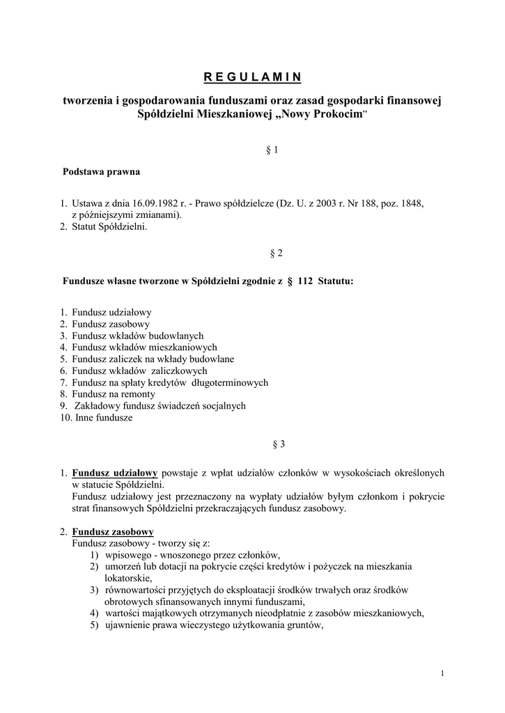 REGULAMI N tworzenia i gospodarowania funduszami oraz zasad gospodarki finansowej Spółdzielni Mieszkaniowej „Nowy Prokocim” §1 Podstawa prawna 1. Ustawa z dnia 16.09.1982 r. - Prawo spółdzielcze (Dz. U. z 2003 r. Nr 188, poz. 1848, z późniejszymi zmianami). 2. Statut Spółdzielni. §2 Fundusze własne tworzone w Spółdzielni zgodnie z § 112 Statutu: 1. Fundusz udziałowy 2. Fundusz zasobowy 3. Fundusz wkładów budowlanych 4. Fundusz wkładów mieszkaniowych 5. Fundusz zaliczek na wkłady budowlane 6. Fundusz wkładów zaliczkowych 7. Fundusz na spłaty kredytów długoterminowych 8. Fundusz na remonty 9. Zakładowy fundusz świadczeń socjalnych 10. Inne fundusze §3 1. Fundusz udziałowy powstaje z wpłat udziałów członków w wysokościach określonych w statucie Spółdzielni. Fundusz udziałowy jest przeznaczony na wypłaty udziałów byłym członkom i pokrycie strat finansowych Spółdzielni przekraczających fundusz zasobowy. 2. Fundusz zasobowy Fundusz zasobowy - tworzy się z: 1) wpisowego - wnoszonego przez członków, 2) umorzeń lub dotacji na pokrycie części kredytów i poŜyczek na mieszkania lokatorskie, 3) równowartości przyjętych do eksploatacji środków trwałych oraz środków obrotowych sfinansowanych innymi funduszami, 4) wartości majątkowych otrzymanych nieodpłatnie z zasobów mieszkaniowych, 5) ujawnienie prawa wieczystego uŜytkowania gruntów, 1 6) umorzenie zasobów z tytułu przeniesienia praw spółdzielczych na własność odrębną lub zbycia lokali wolnych, 7) innych źródeł określonych odrębnymi przepisami. Fundusz zasobowy zmniejsza się o: 1) umorzenie środków trwałych mieszkaniowych, 2) umorzenie prawa wieczystego uŜytkowania, 3) wartości przekazanych, sprzedanych lub zlikwidowanych środków trwałych stanowiące zasoby mieszkaniowe w części nie sfinansowanej wkładami mieszkaniowymi i budowlanymi, 4) cofnięte umorzenie spłaty kredytów bankowych z tytułu zmiany statusu prawa lokatorskiego, 5) zdjęcie z ewidencji zasobów mieszkaniowych z tytułu przeniesienia praw spółdzielczych na odrębną własność lokali lub zbycia lokali wolnych, 6) inne określone odrębnymi przepisami. . 3. Fundusz wkładów budowlanych - słuŜy do ewidencji wkładów budowlanych członków posiadających własnościowe prawo do lokalu mieszkalnego, uŜytkowego i garaŜy. Pochodzi on z: - waloryzacji wkładów, - wpłat gotówkowych lokatorów, - likwidacji ksiąŜeczek PKO, - przeniesienia wkładów zaliczkowych na budowlane przy zasiedleniu mieszkań, - zaliczenia spłaty kredytu własnościowego w czynszach, - przeniesienia wartości rynkowej lokalu w związku z przekształceniem prawa na własnościowe, - zaliczenia umorzenia udzielonego przez PKO na wkład z tytułu przedterminowej spłaty kredytu wg obowiązujących przepisów PKO. Fundusz wkładów budowlanych zmniejsza się w związku z: - zwrotami wkładów byłym członkom, - postawieniem wkładów do dyspozycji członków, - zaliczeniem na poczet zadłuŜeń, - cofnięciem umorzenia w związku ze zbyciem prawa przed upływem terminu zawieszenia płatności - kredyt PKO. 4. Fundusz wkładów mieszkaniowych - jest ewidencją wniesionych wkładów mieszkaniowych członków w związku z zawarciem umowy o ustanowienie spółdzielczego lokatorskiego prawa do lokalu i przeniesienia w odrębną własność. Pochodzi z: - przeniesienia wkładów zaliczkowych, - wpłat wkładów z likwidacji ksiąŜeczek PKO z chwilą zasiedlenia mieszkania, - waloryzacji wkładów przy ustaniu członkostwa, - przekształcenia na prawo własnościowe, - spłaty kredytów lokatorskich. Fundusz wkładów mieszkaniowych zmniejsza się w związku z: - ustaniem członkostwa, - zaliczeniem wkładu na zadłuŜenie, - postawieniem wkładu do dyspozycji członka, - przeniesieniem wkładu w związku z przekształceniem prawa na własnościowe - przeniesieniem własności. 2 5. Fundusz zaliczek na wkład budowlany słuŜy do ewidencjonowania wkładów budowlanych członków posiadających własnościowe prawo do lokalu mieszkalnego i uŜytkowego. Pochodzi on z wpłat wkładów budowlanych, spłat kredytów, likwidacji ksiąŜeczek PKO i waloryzacji wkładów. Uznaje się go przez: - wpłatę środków na poczet wkładu na mieszkanie lub lokal uŜytkowy, - waloryzację wkładów, - przeniesienie wkładu mieszkaniowego w związku z przekształceniem prawa do lokalu z lokatorskiego na własnościowe, - spłatą kredytu, - oraz innymi rozliczeniami z tytułu wnoszonych wkładów. ObciąŜa się zwrotem wkładów w przypadku ustania członkostwa i rozliczeniem nadwyŜek zgodnie z decyzją członka Spółdzielni. 6. Fundusz wkładów zaliczkowych słuŜy do ewidencji i rozliczenia wkładów zaliczkowych kandydatów i członków oczekujących na przydział mieszkań i lokali uŜytkowych. Pochodzi on z wpłat członków zaliczek na wkłady (budowa ze środków własnych lokatorów). Fundusz wkładów zmniejsza się w związku ze zwrotem wkładów zaliczkowych na wniosek członka (w momencie ustania członkostwa). Rozliczenie wkładów wg zadania inwestycyjnego na: - wkłady mieszkaniowe, - wkłady budowlane. Przeniesienie nadwyŜki zaliczek na: - konto osobiste członka - konto spłaty czynszów i innych naleŜności - inne zaliczenia (wykańczanie mieszkań) 7. Fundusz na spłaty kredytów długoterminowych słuŜy do ewidencji i rozliczeń z tytułu rat kredytów na lokale mieszkalne oraz odsetek od tych kredytów. Fundusz obciąŜa się: - rozliczeniem rat kredytu na poczet uzupełnienia wkładu mieszkaniowego i budowlanego, - rozliczeniem na spłatę odsetek naliczonych od zaciągniętych kredytów. Fundusz uznaje się: - spłatą rat i odsetek od lokali uŜytkowych będących własnością Spółdzielni, - innymi rozliczeniami dot. spłaty kredytów zaciągniętych przed 1990r. 8. Fundusz na remonty Podstawowe źródła tworzenia funduszu: - odpisy w cięŜar eksploatacji zasobów wg wielkości zatwierdzonych w 
