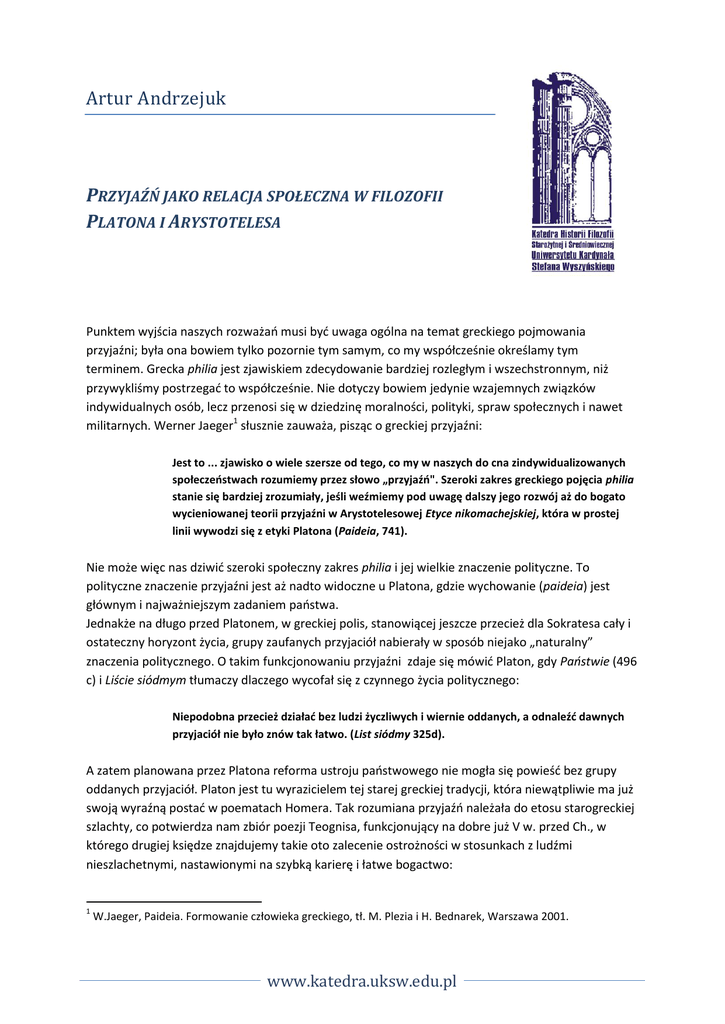 Artur Andrzejuk PRZYJAŹŃ JAKO RELACJA SPOŁECZNA W FILOZOFII PLATONA I ARYSTOTELESA Punktem wyjścia naszych rozważań musi być uwaga ogólna na temat greckiego pojmowania przyjaźni; była ona bowiem tylko pozornie tym samym, co my współcześnie określamy tym terminem. Grecka philia jest zjawiskiem zdecydowanie bardziej rozległym i wszechstronnym, niż przywykliśmy postrzegać to współcześnie. Nie dotyczy bowiem jedynie wzajemnych związków indywidualnych osób, lecz przenosi się w dziedzinę moralności, polityki, spraw społecznych i nawet militarnych. Werner Jaeger1 słusznie zauważa, pisząc o greckiej przyjaźni: Jest to ... zjawisko o wiele szersze od tego, co my w naszych do cna zindywidualizowanych społeczeństwach rozumiemy przez słowo „przyjaźń". Szeroki zakres greckiego pojęcia philia stanie się bardziej zrozumiały, jeśli weźmiemy pod uwagę dalszy jego rozwój aż do bogato wycieniowanej teorii przyjaźni w Arystotelesowej Etyce nikomachejskiej, która w prostej linii wywodzi się z etyki Platona (Paideia, 741). Nie może więc nas dziwić szeroki społeczny zakres philia i jej wielkie znaczenie polityczne. To polityczne znaczenie przyjaźni jest aż nadto widoczne u Platona, gdzie wychowanie (paideia) jest głównym i najważniejszym zadaniem państwa. Jednakże na długo przed Platonem, w greckiej polis, stanowiącej jeszcze przecież dla Sokratesa cały i ostateczny horyzont życia, grupy zaufanych przyjaciół nabierały w sposób niejako „naturalny” znaczenia politycznego. O takim funkcjonowaniu przyjaźni zdaje się mówić Platon, gdy Państwie (496 c) i Liście siódmym tłumaczy dlaczego wycofał się z czynnego życia politycznego: Niepodobna przecież działać bez ludzi życzliwych i wiernie oddanych, a odnaleźć dawnych przyjaciół nie było znów tak łatwo. (List siódmy 325d). A zatem planowana przez Platona reforma ustroju państwowego nie mogła się powieść bez grupy oddanych przyjaciół. Platon jest tu wyrazicielem tej starej greckiej tradycji, która niewątpliwie ma już swoją wyraźną postać w poematach Homera. Tak rozumiana przyjaźń należała do etosu starogreckiej szlachty, co potwierdza nam zbiór poezji Teognisa, funkcjonujący na dobre już V w. przed Ch., w którego drugiej księdze znajdujemy takie oto zalecenie ostrożności w stosunkach z ludźmi nieszlachetnymi, nastawionymi na szybką karierę i łatwe bogactwo: 1 W.Jaeger, Paideia. Formowanie człowieka greckiego, tł. M. Plezia i H. Bednarek, Warszawa 2001. www.katedra.uksw.edu.pl 2 Kyrnosie, za żadną cenę nie szukaj sobie przyjaciół pomiędzy takimi ludźmi! Bądź dla nich uprzejmy, kiedy z nimi mówisz, ale żadne poważne związki niechaj cię z nimi nie łączą, bo wtedy poznasz, co to za liche osobistości, na które nie można żadną miarą liczyć. Oszustwo, podstęp i zdrada, oto, w czym się kocha tego rodzaju towarzystwo (cyt. za: Paideia, 280281). 1. Idealistyczna koncepcja przyjaźni u Platona Prześledźmy więc tok myśli Platona w tej sprawie. Narzuca się tu od razu spostrzeżenie, że już we wczesnym dialogu Lisys Platon dokładnie wie, czym jest a czym nie jest przyjaźń. Na razie jeszcze nie mówi wprost o Idei Dobra, tym nie mniej wyraźnie ją sugeruje pisząc o „pierwszym przyjacielu” (proton philon)2. Platon już bowiem wie, że przyjaźń jest tęsknotą za Dobrem, które stanowi zarazem Piękno3: Ja to mówię dlatego, żeby was te wszystkie inne rzeczy, któreśmy nazwali miłymi ze względu na tamto pierwsze, nie wprowadzały w błąd. To są jak gdyby jakieś jego widziadła. A tamto pierwsze i jedynie ono tylko jest tym, co naprawdę miłe. Platon mówi tu bardzo dziwną rzecz: twierdzi mianowicie, że problem wzajemności w przyjaźni jest z gruntu fałszywy4. Jednakże gdy spojrzymy na tę deklarację Platona z pozycji jego teorii przyjaźni i miłości, że jest to mianowicie tęsknota do Dobra i Piękna, wtedy istotnie czymś nieważnym staje się miłość człowieka do człowieka i przyjaźń łącząca wzajemnie ludzi. Miłość i przyjaźń „ludzka” stają się w najlepszym wypadku etapami tego erosa, który jest pociągiem do świata idei. A zatem koncepcję przyjaźni w ujęciu Platona zreasumować można następująco: 1. «Pierwszym Przyjacielem» jest nic innego, jak tylko pierwsze i absolutne Dobro. 2. Do podobnych wniosków Platon dochodzi w swoich analizach o miłości. 2 Prîton f…lon - proton philon, co Witwicki tłumaczy zgodnie ze swoją filologiczną konwencją, jako „pierwsze miłe”, a co raczej należałby – zgodnie z sugestią tłumacza książek Realego, Edwarda Iwo Zielińskiego – zastąpić wyrażeniem „pierwsze przyjazne” (przynajmniej, aby być w zgodzie w wyjaśnieniami Realego, które jednak wydają się w tym względzie trafne). Reale jest pewny, że chodzi tu o Ideę Dobra. Witwicki, przyjmując koncepcję chronologicznego rozwoju myśli Platona, dostrzega tu jedynie zapowiedź nauki o ideach. 3 Proponowano różne rozwiązania odnośnie do zawartej w tym wczesnym dialogu teorii. Najprostszym było uznanie Lizysa za tekst późniejszy, niż powszechnie przypisywana mu datacja. Gdy rozwiązanie to nie wytrzymało krytyki badaczy zaczęto ignorować Platońską uwagę, zawartą w tym dialogu, że przyjaźń jest w swej istocie „tęsknotą do pierwszego przyjaciela”. Tak zdaje się postępować np. W.Witwicki, który przechodzi do porządku nad wyrażeniem „pierwsze miłe” (jak oddaje greckie „proton philon” w swoim przekładzie). Trzecim rozwiązaniem było przyjęcie pewnej merytorycznej jedności dialogów Platona; uznanie po prostu, że Platon zaczął je pisać wtedy, gdy miał już skrystalizowany własny filozoficzny pogląd i wobec tego „chronologią” dialogów Platona nie jest rozwój jego poglądów filozoficznych, lecz przyjęty przez niego plan pisarski. 4 Słowa Sokratesa, dystansujące się rozważań z rozmowy z Menedemosem, utwi