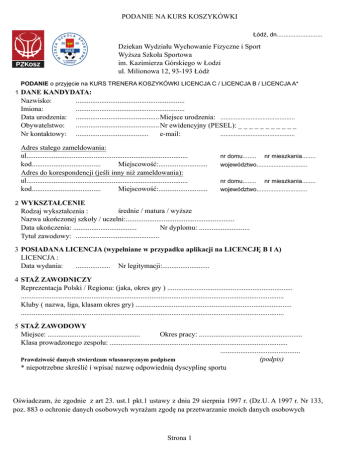 PODANIE NA KURS KOSZYKÓWKI Łódź, dn........................... Dziekan Wydziału Wychowanie Fizyczne i Sport Wyższa Szkoła Sportowa im. Kazimierza Górskiego w Łodzi ul. Milionowa 12, 93-193 Łódź PODANIE o przyjęcie na KURS TRENERA KOSZYKÓWKI LICENCJA C / LICENCJA B / LICENCJA A* 1 DANE KANDYDATA: Nazwisko: Imiona: Data urodzenia: Obywatelstwo: Nr kontaktowy: ............................................................ ............................................................ ............................................................ Miejsce urodzenia: ............................................ ............................................................ Nr ewidencyjny (PESEL): _ _ _ _ _ _ _ _ _ _ _ ........................................ e-mail: ............................................ Adres stałego zameldowania: ul......................................................................................... kod...................................... Miejscowość:........................... Adres do korespondencji (jeśli inny niż zameldowania): ul......................................................................................... kod...................................... Miejscowość:........................... nr domu........ nr mieszkania........ województwo.............................. nr domu........ nr mieszkania........ województwo.............................. 2 WYKSZTAŁCENIE średnie / matura / wyższe Rodzaj wykształcenia : Nazwa ukończonej szkoły / uczelni:............................................................ Data ukończenia: ................................... Nr dyplomu: ............................ Tytuł zawodowy: ............................................................ 3 POSIADANA LICENCJA (wypełniane w przypadku aplikacji na LICENCJĘ B I A) LICENCJA : Data wydania: ................... Nr legitymacji:.......................... 4 STAŻ ZAWODNICZY Reprezentacja Polski / Regionu: (jaka, okres gry ) ..................................................................... ................................................................................................................................................. Kluby ( nazwa, liga, klasam okres gry) ...................................................................................... ................................................................................................................................................. 5 STAŻ ZAWODOWY Miejsce: ................................................... Okres pracy: ......................................................... Klasa prowadzonego zespołu: .................................................................................................. ............................................ (podpis) Prawdziwość danych stwierdzam własnoręcznym podpisem * niepotrzebne skreślić i wpisać nazwę odpowiednią dyscyplinę sportu Oświadczam, że zgodnie z art 23. ust.1 pkt.1 ustawy z dnia 29 sierpnia 1997 r. (Dz.U. A 1997 r. Nr 133, poz. 883 o ochronie danych osobowych wyrażam zgodę na przetwarzanie moich danych osobowych Strona 1 PODANIE NA KURS KOSZYKÓWKI W przypadku przyjęcia mnie na KURS TRENERA KOSZYKÓWKI LICENCJA A / LICENCJA B / LICENCJA C * zobowiązuję się do: 1. wniesienia wymaganych opłat oraz oświadczam, że w przypadku rezygnacji nie będę ubiegał/a się o zwrot poniesionych kosztów 2. ubezpieczenia od następstw nieszczęśliwych wypadków na czas trwania kursu ........................................ (miejscowość, data) ............................................ (podpis) Zgodnie z wymaganiami do wniosku załączam: 1 ................................................................................................................................................. 2 3 4 5 6 7 8 9 ................................................................................................................................................. ................................................................................................................................................. ................................................................................................................................................. ................................................................................................................................................. ................................................................................................................................................. ................................................................................................................................................. ................................................................................................................................................. ................................................................................................................................................. Strona 2