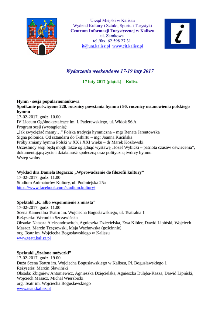 Urząd Miejski w Kaliszu Wydział Kultury i Sztuki, Sportu i Turystyki Centrum Informacji Turystycznej w Kaliszu ul. Zamkowa tel./fax. 62 598 27 31 [email protected] www.cit.kalisz.pl Wydarzenia weekendowe 17-19 luty 2017 17 luty 2017 (piątek) – Kalisz Hymn - sesja popularnonaukowa Spotkanie poświęcone 220. rocznicy powstania hymnu i 90. rocznicy ustanowienia polskiego hymnu 17-02-2017, godz. 10.00 IV Liceum Ogólnokształcące im. I. Paderewskiego, ul. Widok 96 A Program sesji (wystąpienia): „Jak zwyciężać mamy…” Polska tradycja hymniczna – mgr Renata Jarentowska Signa polonica. Od sztandaru do T-shirtu – mgr Joanna Kucińska Próby zmiany hymnu Polski w XX i XXI wieku – dr Marek Kozłowski Uczestnicy sesji będą mogli także oglądnąć wystawę „Józef Wybicki – patriota czasów oświecenia”, dokumentującą życie i działalność społeczną oraz polityczną twórcy hymnu. Wstęp wolny Wykład dra Daniela Bogacza: „Wprowadzenie do filozofii kultury” 17-02-2017, godz. 11.00 Studium Animatorów Kultury, ul. Podmiejska 25a https://www.facebook.com/studium.kultury/ Spektakl „K. albo wspomnienie z miasta” 17-02-2017, godz. 11.00 Scena Kameralna Teatru im. Wojciecha Bogusławskiego, ul. Teatralna 1 Reżyseria: Weronika Szczawińska Obsada: Natasza Aleksandrowitch, Agnieszka Dzięcielska, Ewa Kibler, Dawid Lipiński, Wojciech Masacz, Marcin Trzęsowski, Maja Wachowska (gościnnie) org. Teatr im. Wojciecha Bogusławskiego w Kaliszu www.teatr.kalisz.pl Spektakl „Szalone nożyczki” 17-02-2017, godz. 19.00 Duża Scena Teatru im. Wojciecha Bogusławskiego w Kaliszu, Pl. Bogusławskiego 1 Reżyseria: Marcin Sławiński Obsada: Zbigniew Antoniewicz, Agnieszka Dzięcielska, Agnieszka Dulęba-Kasza, Dawid Lipiński, Wojciech Masacz, Michał Wierzbicki org. Teatr im. Wojciecha Bogusławskiego www.teatr.kalisz.pl Z cyklu Happy Flower Music – Krzysztof Wałecki & Darek Pietrzak – koncert 17-02-2017, godz. 19.00 Centrum Kultury i Sztuki, ul. Łazienna 6 Bilety w cenie: 30 zł org. Centrum Kultury i Sztuki http://ckis.kalisz.pl/wydarzenia/krzysztof-walecki-darek-pietrzak-koncert/ MAZURKI NIEPOJĘTE Kapela Maliszów – rewelacja muzyki folkowej 17-02-2017, godz. 19.30 Sala koncertowa Filharmonii Kaliskiej, ul. Nowy Świat 28-30 Kapela Maliszów w składzie: Jan Malisz - skrzypce, basy, lira korbowa, akordeon, śpiew Zuzanna Malisz - śpiew, basy, baraban, bęben obręczowy Kacper Malisz - pierwsze skrzypce, basy, nyckelharpa Orkiestra Symfoniczna Filharmonii Kaliskiej Adam Klocek - dyrygent Paweł Przezwański - aranżacje mazurków Mazurki Niepojęte autorstwa Kapeli Maliszów na zespół i smyczki Antonín Dvořák – VIII Symfonia G-dur op. 88 http://filharmoniakaliska.pl/news/mazurki-niepojete/72 18 luty 2017 (sobota) – Kalisz LXXXI KALISZOBRANIE 18-02-2017, godz. 15.03 skrzyżowanie ulic Złotej i Długosza org. PTTK o/Kalisz, TOnZ, Miasto Kalisz http://kaliszobranie.blogspot.com/ Spektakl ''K. albo wspomnienie z miasta'' 18-02-2017, godz. 17.00 Scena Kameralna Teatru im. Wojciecha Bogusławskiego, ul. Teatralna 1 Reżyseria: Weronika Szczawińska Obsada: Natasza Aleksandrowitch, Agnieszka Dzięcielska, Ewa Kibler, Dawid Lipiński, Wojciech Masacz, Marcin Trzęsowski, Maja Wachowska (gościnnie) org. Teatr im. Wojciecha Bogusławskiego w Kaliszu www.teatr.kalisz.pl Koncert: Michał Szpak z zespołem 18-02-2017, godz. 17.30 Sala widowiskowa Centrum Kultury i Sztuki, ul. Łazienna 6 www.ckis.kalisz.pl Spektakl „Szalone nożyczki” 18-02-2017, godz. 19.00 Duża Scena Teatru im. Wojciecha Bogusławskiego w Kaliszu, Pl. Bogusławskiego 1 Reżyseria: Marcin Sławiński Obsada: Zbigniew Antoniewicz, Agnieszka Dzięcielska, Agnieszka Dulęba-Kasza, Dawid Lipiński, Wojciech Masacz, Michał Wierzbicki org. Teatr im. Wojciecha Bogusławskiego www.teatr.kalisz.pl Death & Thrash Koncert Mocne brzmienia w piwnicznych czeluściach 18-02-2017, godz. 19.00 Pub Urwany Film, ul. Narutowicza 2a/1 Bilety w cenie: 10 zł https://www.facebook.com/events/1925543000995121/ Dj Asca w Kwadrat Klubie 18-02-2017, godz. 21.00 Klub Kwadrat, ul. Narutowicza 2 Wstęp płatny: 10 zł www.facebook.com/events/364833360559286/ 19 luty 2017 (niedziela) – Kalisz Spektakl „Być jak Elizabeth Taylor” 19-11-2016, godz. 16.00 Aula WPA UAM, ul. Nowy Świat 28-30 Ceny biletów: 90-100 PLN Wykład popularnonaukowy Maciej Błachowicza z cyklu „Fotoplastikon. Kalisz na fotografiach XIX i XX w.” pt.: „Katedra kaliska – historia, architektura i ludzie” 19-02-2017, godz. 17.00 Centrum Kultury i Sztuki, ul. Łazienna 6 Wstęp wolny http://ckis.kalisz.pl/wydarzenia/fotoplastikon-katedra-kaliska-historia-architektura-i-ludzie/ Spektakl „K. albo wspomnienie z miasta” 19-02-2017, godz. 17.00 Scena Kameralna Teatru im. Wojciecha Bogusławskiego, ul. Teatralna 1 Reżyseria: Weronika Szczawińska Obsada: Natasza Aleksandrowitch, Agnieszka Dzięcielska, Ewa Kibler, Dawid Lipiński, Wojciech Masacz, Marcin Trzęsowski, Maja Wachowska (gościnnie) org. Teatr im. Wojciecha Bogusławskiego w Kaliszu www.teatr.kalisz.pl Spektakl „Być jak Elizabeth Taylor” 19-11-2016, godz. 19.00 Aula WPA UAM, ul. Nowy Świat 28-30 Ceny biletów: 90-100 PLN Spektakl „Szalone nożyczki” 19-02-2017, godz. 19.00 Duża Scena Teatru im. Wojciecha Bogusławskiego w Kaliszu, Pl. Bogusławskiego 1 Reżyseria: Marcin Sławiński Obsada: Zbigniew Antoniewicz, Agnieszka Dzięcielska, Agnieszka Dulęba-Kasza, Dawid Lipiński, Wojciech Masacz, Michał Wierzbicki org. Teatr im. Wojciecha Bogusławskiego www.teatr.kalisz.pl MUZEA WKALISZU Muzeum Okręgowe Ziemi Kaliskiej, ul. Kościuszki 12 Godziny otwarcia: wtorek, czwartek: 10:00 – 15:30 środa, piątek: 10:00 – 18:00 sobota, niedziela: 10:00 - 15:00 - Wystawy stałe: „Z dziejów Kalisza”, „Z pradziejów Kalisza i okolic” - Wystawa czasowa: „Martwa natura jak żywa” 13.01.2017 – 31.03.2017 Rezerwat Archeologiczny w Kaliszu-Zawodziu, ul. Bolesław
