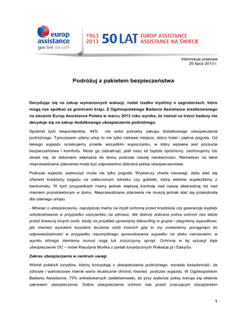 Informacja prasowa 25 lipca 2013 r. Podróżuj z pakietem bezpieczeństwa Decydując się na zakup wymarzonych wakacji, nadal rzadko myślimy o zagrożeniach, które mogą nas spotkać za granicami kraju. Z Ogólnopolskiego Badania Assistance zrealizowanego na zlecenie Europ Assistance Polska w marcu 2013 roku wynika, że niemal co trzeci badany nie decyduje się na zakup dodatkowego ubezpieczenia podróżnego. Spośród tych respondentów, 44% nie widzi potrzeby zakupu dodatkowego ubezpieczenia podróżnego. Tymczasem udany urlop to nie tylko ciekawe miejsce, dobry hotel i piękna pogoda. Od takiego wyjazdu oczekujemy przede wszystkim wypoczynku, w który wpisane jest poczucie bezpieczeństwa i komfortu. Może go zabraknąć, jeśli nasz lot będzie opóźniony, zachorujemy lub okaże się, że dokonano włamania do domu podczas naszej nieobecności. Remedium na takie nieprzewidziane zdarzenia może być odpowiednio dobrana polisa ubezpieczeniowa. Podczas wyjazdu zaskoczyć może nie tylko pogoda. Wystarczy chwila nieuwagi, żeby stać się ofiarami kradzieży bagażu na zatłoczonym lotnisku czy gotówki, którą właśnie wypłaciliśmy z bankomatu. W tych przypadkach mamy jednak większą kontrolę nad naszą własnością niż nad mieniem pozostawionym w domu. Nieprzewidziane zdarzenia nie muszą jednak stać się przeszkodą dla udanego urlopu. - Mówiąc o ubezpieczeniu, najczęściej mamy na myśli ochronę przed kradzieżą czy gwarancję wypłaty odszkodowania w przypadku uszczerbku na zdrowiu. Ale dobrze dobrana polisa ochroni nas także przed brawurą innych osób, kiedy na przykład uprawiamy kitesurfing w grupie i ulegniemy wypadkowi, jak również wysokimi kosztami leczenia osób trzecich gdy to my zostaniemy pociągnięci do odpowiedzialności w przypadku nieumyślnego spowodowania wypadku na stoku narciarskim, w wyniku którego złamiemy komuś nogę lub zniszczymy sprzęt. Ochronę w tej sytuacji daje ubezpieczenie OC – mówi Klaudyna Mortka z portali turystycznych Wakacje.pl i EasyGo. Zakres ubezpieczenia w centrum uwagi Wśród polskich turystów, którzy korzystają z ubezpieczenia podróżnego, wzrasta świadomość, że zdrowie i wartościowe mienie warto skutecznie chronić również podczas wyjazdu. W Ogólnopolskim Badaniu Assistance, 73% ankietowanych zadeklarowało, że przy wyborze polisy kieruje się właśnie zakresem ubezpieczenia. Dobre ubezpieczenie ochroni nas przed znaczącym obciążeniem 1 Informacja prasowa 25 lipca 2013 r. finansowym wynikającym z wysokich kosztów leczenia za granica, skutkami kradzieży, koniecznością wydłużenia lub przerwania wyjazdu, a nawet zapewni ochronę assistance. Ta ostatnia zadziała między innymi w sytuacji, gdy sami będziemy wymagać natychmiastowej hospitalizacji i nie będziemy mogli zapewnić opieki dziecku. - Nasi klienci coraz częściej i chętniej wybierają wyższe warianty ubezpieczenia. Zwracają uwagę nie tylko na to, żeby mieć ubezpieczenie, ale żeby ochrona była odpowiednio wysoka. Dla klientów bardziej wymagających, oprócz wysokich sum i szerokiego zakresu, ważne są także mniej standardowe opcje, takie jak na przykład przedłużenie ochrony ubezpieczeniowej w sytuacjach nagłych o 48 godz. Są to przypadki kiedy z powodu usterki samolotu, powrót do kraju jest opóźniony– mówi Anna Wieconkowska, Travel Insurance Manager w AIG. Za co tak naprawdę płacimy kupując polisę ubezpieczeniową? Co ciekawe, jak wynika z badania, cena nie jest czynnikiem decydującym o wyborze ochrony ubezpieczeniowej na czas podróży (43% wskazań). Co dziesiąty badany nie decyduje się jednak na wykupienie dodatkowego ubezpieczenia, ponieważ uważa, że posiada odpowiednią ochronę w ramach oferty wakacyjnej lub innych produktów. Warto jednak zwrócić uwagę, że podstawowe obowiązkowe ubezpieczenie dodawane do ofert wycieczek najczęściej gwarantuje zwrot kosztów leczenia jedynie do sumy 15000 – 20000 EUR oraz ubezpieczenie następstw nieszczęśliwych wypadków w przedziale od 3000 do 7000 PLN, co może okazać się niewystarczające. Dodatkowe opcje, takie jak ubezpieczenie OC, ubezpieczenie w przypadku chorób przewlekłych czy ubezpieczenie wypadków wynikających z uprawiania sportów ekstremalnych obejmują warianty z wyższymi sumami ubezpieczenia. Jednakże jak podaje portal Wakacje.pl, sprzedaż polis w wariantach rozszerzonych nadal plasuje się na poziomie 25% w stosunku do polis o wariancie podstawowym, a może to być konsekwencją stereotypu, że rozbudowane polisy ubezpieczeniowe muszą być drogie. Odpowiedzią na te obawy jest polisa ubezpieczeniowa Travel Guard AIG, którą można dostosować do indywidualnych potrzeb i możliwości finansowych, wybierając jeden z trzech wariantów: STANDARD, KOMFORT i KOMFORT PLUS. Każdy z nich gwarantuje ochronę w przypadku następstw nieszczęśliwych wypadków również w wyniku amatorskiego uprawiania sportów zimowych i wodnych, zwrot kosztów leczenia, ubezpieczenie OC, ochronę przed konsekwencjami kradzieży, ochronę mienia zostawionego w domu, a nawet ubezpieczenie kosztów rezygnacji z podróży. Wybierając wariant rozszerzony dodatkowo zabezpieczymy się przed kradzieżą bagażu czy opóźnieniem lub odwołaniem lotu. W zależności od wybranego wariantu ubezpieczenia ochrona będzie działała w Europie kontynentalnej i na wyspach, w krajach pozaeuropejskich położonych w 2 Informacja prasowa 25 lipca 2013 r. basenie Morza Śródziemnego lub w większości krajów świata. Świadczenia assistance realizowane są przez Europ Assistance Polska. - Ubezpieczenie Travel Guard AIG to jedno z bardziej kompleksowych ubezpieczeń na rynku. Jest skierowane zarówno do tych, którzy kierują się ceną przy wyborze polisy, jaki tych, dla których liczy się przede wszystkim bezpieczeństwo i komfort w każdej sytuacji i o każdej porze – dodaje Urszula Szwarc, Zastępca Dyrektora Handlowego w Europ Assistance Polska. Ubezpiecze
