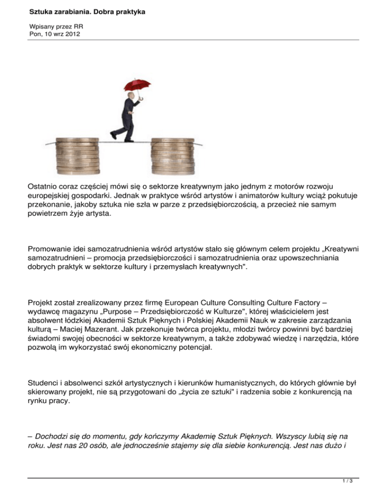 Sztuka zarabiania. Dobra praktyka Wpisany przez RR Pon, 10 wrz 2012 Ostatnio coraz częściej mówi się o sektorze kreatywnym jako jednym z motorów rozwoju europejskiej gospodarki. Jednak w praktyce wśród artystów i animatorów kultury wciąż pokutuje przekonanie, jakoby sztuka nie szła w parze z przedsiębiorczością, a przecież nie samym powietrzem żyje artysta. Promowanie idei samozatrudnienia wśród artystów stało się głównym celem projektu „Kreatywni samozatrudnieni – promocja przedsiębiorczości i samozatrudnienia oraz upowszechniania dobrych praktyk w sektorze kultury i przemysłach kreatywnych". Projekt został zrealizowany przez firmę European Culture Consulting Culture Factory – wydawcę magazynu „Purpose – Przedsiębiorczość w Kulturze", której właścicielem jest absolwent łódzkiej Akademii Sztuk Pięknych i Polskiej Akademii Nauk w zakresie zarządzania kulturą – Maciej Mazerant. Jak przekonuje twórca projektu, młodzi twórcy powinni być bardziej świadomi swojej obecności w sektorze kreatywnym, a także zdobywać wiedzę i narzędzia, które pozwolą im wykorzystać swój ekonomiczny potencjał. Studenci i absolwenci szkół artystycznych i kierunków humanistycznych, do których głównie był skierowany projekt, nie są przygotowani do „życia ze sztuki" i radzenia sobie z konkurencją na rynku pracy. – Dochodzi się do momentu, gdy kończymy Akademię Sztuk Pięknych. Wszyscy lubią się na roku. Jest nas 20 osób, ale jednocześnie stajemy się dla siebie konkurencją. Jest nas dużo i 1/3 Sztuka zarabiania. Dobra praktyka Wpisany przez RR Pon, 10 wrz 2012 musimy wiedzieć, w jaki sposób dotrzeć do odbiorcy i wyróżnić się pośród innych. W szkole nie uczą tego. Gdy kończymy szkołę, okazuje się, że osoby z wykształceniem artystycznym nie potrafią odnaleźć się na rynku pracy – podkreśla Maja Ruszkowska-Mazerant, odpowiedzialna za promocję projektu. Dlatego tak ważny dla projektodawców stał się aspekt edukacyjny. W ramach projektu obok promocji prowadzone były działania informacyjne. W efekcie została wydana książka „Kreatywni samozatrudnieni", w której zaprezentowano zagadnienia dotyczące przedsiębiorczości w sektorze kultury i przemysłach kreatywnych oraz przedstawiono wybrane dobre praktyki. Głównym narzędziem komunikacji było utworzenie strony internetowej www.kreatywnisamozatrudnieni.pl, na której powstał internetowy przewodnik „Bądź przedsiębiorczy w sektorze kreatywnym". Oprócz artykułów dotyczących idei przedsiębiorczości w kulturze, można tam znaleźć wiele praktycznych rad i wskazówek dla przyszłych samozatrudnionych. Przewodnik krok po kroku uczy, jak założyć firmę. Pokazuje, jakie są podstawowe obowiązki przedsiębiorcy, jak rozwijać się, by osiągnąć zysk. Cennym źródłem informacji jest baza instytucji, które udzielają dotacji na start. Oprócz przewodnika strona promuje artystów, którzy podjęli własną działalność dzięki pozyskaniu funduszy, i tych, którzy poradzili sobie na rynku bez dodatkowej pomocy i są przykładem młodych zdolnych przedsiębiorców. Większość prezentowanych osób skorzystała z funduszy unijnych i dobrze wykorzystała zdobyte środki. – Wiedza też kosztuje, a ja to dostałam za darmo – mówi o szkoleniach projektantka biżuterii Dorota Kempko, która uzyskała dotację w ramach programu „Własna firma drogą do sukcesu", realizowanego przez Łódzką Agencję Rozwoju Regionalnego. Kempko wspomina, że już w liceum myślała o utworzeniu własnej pracowni jubilerskiej, ale wtedy było to w sferze marzeń. Później, podczas studiów, za namową kolegi złożyła wniosek o dofinansowanie i się udało. Młoda projektantka dostała niedawno zaproszenie na prestiżowe targi biżuterii w Monachium. Przykładem dobrych praktyk w sektorze kreatywnym jest również działalność artystyczna Joanny Rusin – projektantki dywanów. Artystka jest obecnie stypendystką Ministerstwa Kultury i Dziedzictwa Narodowego w programie „Młoda Polska". Pomoc ministerstwa pozwoliła jej na zakup specjalnej maszyny i materiałów do realizacji swoich prac. Projektantka zachęca do założenia własnej firmy, ale nie za wszelką cenę , bo – jak przekonuje – trzeba mierzyć siły na zamiary. Warto podkreślić, że idea przedsiębiorczości od dawna była promowana przez magazyn „Purpose". Projekt był przedłużeniem jego wcześniejszej działalności i również za to został doceniony. Twórcy pisma wiele zrobili, by wiedza o sektorze kreatywnym była obecna wśród 2/3 Sztuka zarabiania. Dobra praktyka Wpisany przez RR Pon, 10 wrz 2012 artystów i instytucji, które mogą ich wspierać. Wcześniej wielu projektodawców nie zdawało sobie sprawy, że pracuje w sektorze kultury. Tymczasem, jak tłumaczy Mazerant, osoby świadome swojego istnienia w tym sektorze i aplikujące o dotację mają większe szanse, ponieważ potrafią uzasadnić, dlaczego są w tak ważnym dla rozwoju województwa łódzkiego sektorze. O sukcesie świadczą też statystyki, pokazujące, że po zakończeniu projektu liczba osób, które zakładały działalność gospodarczą o profilu artystyczno-kulturalnym, była zdecydowanie większa niż przed jego rozpoczęciem. Maciej Mazerant, koordynator projektu, właściciel firmy European Culture Consulting Culture Factory: Warto już na poziomie projektu informacyjnego przekonywać kadrę akademicką, studentów, absolwentów, ludzi z wykształceniem artystycznym, ale również instytucje, które dają pieniądze na start, że ludzie w sektorze kreatywnym mogą być przedsiębiorcami. To było trudne zadanie. Wysyłaliśmy informacje do instytucji, wyjaśniając, czym jest sektor kreatywny i dlaczego warto w niego inwestować, dlaczego rozważyć danie pieniędzy na założenie butiku kreatywnego w konfrontacji ze sklepem spożywczym. Biznes kreatywny jest taką formą działalności, którą