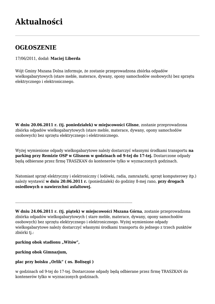 Aktualności OGŁOSZENIE 17/06/2011, dodał: Maciej Liberda Wójt Gminy Mszana Dolna informuje, że zostanie przeprowadzona zbiórka odpadów wielkogabarytowych (stare meble, materace, dywany, opony samochodów osobowych) bez sprzętu elektrycznego i elektronicznego. W dniu 20.06.2011 r. (tj. poniedziałek) w miejscowości Glisne, zostanie przeprowadzona zbiórka odpadów wielkogabarytowych (stare meble, materace, dywany, opony samochodów osobowych) bez sprzętu elektrycznego i elektronicznego. Wyżej wymienione odpady wielkogabarytowe należy dostarczyć własnymi środkami transportu na parking przy Remizie OSP w Glisnem w godzinach od 9-tej do 17-tej. Dostarczone odpady będą odbierane przez firmę TRASZKAN do kontenerów tylko w wyznaczonych godzinach. Natomiast sprzęt elektryczny i elektroniczny ( lodówki, radia, zamrażarki, sprzęt komputerowy itp.) należy wystawić w dniu 20.06.2011 r. (poniedziałek) do godziny 8-mej rano, przy drogach osiedlowych o nawierzchni asfaltowej. ....................................................................................................... W dniu 24.06.2011 r. (tj. piątek) w miejscowości Mszana Górna, zostanie przeprowadzona zbiórka odpadów wielkogabarytowych ( stare meble, materace, dywany, opony samochodów osobowych) bez sprzętu elektrycznego i elektronicznego. Wyżej wymienione odpady wielkogabarytowe należy dostarczyć własnymi środkami transportu do jednego z trzech punktów zbiórki tj.: parking obok stadionu „Witów”, parking obok Gimnazjum, plac przy boisku „Orlik” ( os. Bolisęgi ) w godzinach od 9-tej do 17-tej. Dostarczone odpady będą odbierane przez firmę TRASZKAN do kontenerów tylko w wyznaczonych godzinach. Sprzęt elektryczny i elektroniczny ( lodówki, radia, zamrażarki, sprzęt komputerowy itp.) będzie odbierany w terminie późniejszym. ......................................................................................... W dniu 20.06.2011 r. (tj. poniedziałek) w miejscowości Olszówka, zostanie przeprowadzona zbiórka odpadów wielkogabarytowych ( stare meble, materace, dywany, opony samochodów osobowych) bez sprzętu elektrycznego i elektronicznego, który będzie odbierany w terminie późniejszym. Wyżej wymienione odpady wielkogabarytowe należy dostarczyć własnymi środkami transportu na parking przy Remizie OSP w Olszówce, w godzinach od 9-tej do 17-tej. Dostarczone odpady będą odbierane przez firmę TRASZKAN do kontenerów tylko w wyznaczonych godzinach. Sprzęt elektryczny i elektroniczny ( lodówki, radia, zamrażarki, sprzęt komputerowy itp.) będzie odbierany w terminie późniejszym. .................................................................................................. W dniu 20.06.2011 r. (tj. poniedziałek) w miejscowości Raba Niżna, zostanie przeprowadzona zbiórka odpadów wielkogabarytowych ( stare meble, materace, dywany, opony samochodów osobowych) bez sprzętu elektrycznego i elektronicznego. Wyżej wymienione odpady wielkogabarytowe należy dostarczyć własnymi środkami transportu na plac przy Remizie OSP w Rabie Niżnej w godzinach od 9-tej do 17-tej. Dostarczone odpady będą odbierane przez firmę TRASZKAN do kontenerów tylko w wyznaczonych godzinach. Sprzęt elektryczny i elektroniczny ( lodówki, radia, zamrażarki, sprzęt komputerowy itp.) będzie odbierany w terminie późniejszym. ................................................................................................ W dniu 20.06.2011 r. (tj. poniedziałek) w miejscowościach: Kasinka Mała, Kasina Wielka, Łostówka i Glisne, zostanie przeprowadzona zbiórka zużytego sprzętu elektrycznego i elektronicznego ( lodówki, radia, zamrażarki, sprzęt komputerowy itp.). Zużyty sprzęt elektryczny I elektroniczny należy wystawić do odbioru w dniu 20.06.2011r. (tj. poniedziałek) do godziny 8-mej (rano) przy drogach osiedlowych o nawierzchni asfaltowej. Informacje dodatkowe można uzyskać pod nr tel. 728851798 w godz. od 7-mej do 15-tej. Sprzęt elektryczny i elektroniczny ( lodówki, radia, zamrażarki, sprzęt komputerowy itp.) będzie odbierany w terminie późniejszym. Wójt Gminy Mszana Dolna