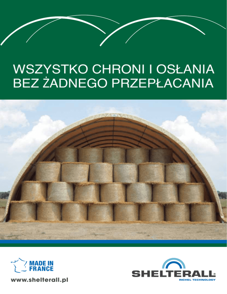 Wszystko chroni i osłania bez żadnego przepłacania www.shelterall.pl SZEROKA GAMA DLA WSZYSTKICH ZASTOSOWAN N osc w o Maszyny Słoma i siano Sprzęt rolniczy Big-bagi Materiały sypkie Drewno opałowe Hodowla bydła mlecznego Owczarnia Hodowla bydła mięsnego Shelterall® może wymagać uprzedniego uzyskania pozwolenia na budowę lub zgłoszenia robót budowlanych. Stosowne informacje w tym zakresie nabywca powinien uzyskać we właściwym urzędzie. Optymalny rozmiar strefy składowania Szybki montaż Dzięki nowoczesnym rozwiązaniom technicznym, takim jak system kotwienia nie wymagający fundamentowania czy niespawane łączniki krzyżakowe, czas montażu i demontażu Shelterall® został ograniczony do niezbędnego minimum. Profil łukowy pojedynczy Posiadamy w ofercie modele o szerokości od 4,5 m do 25 m. Kształt Shelterall® umożliwia swobodne przemieszczanie się przy wewnętrznych krawędziach tunelu na całej jego długości. 1,40 2,15 2,10 0,50 0,50 4,50 m 0,50 8m 9,30 m 6,75 5,00 4,70 2,50 3,12 2,30 0,50 0,50 10 m Konstrukcja kratownicowa 3,99 3,60 2,25 1 10 m 12 m NNoOw UVE oAsUc NNoOw U Vo EAsU c 11 7,90 3 3 1 1 15,80 m 25 m Kolor pokrycia : Beżowy Zielono-biały Szaro-biały opcje dostosowane do panstwa potrzeb 3,99 3,99 FRONTONY BLACHY OSLONOWE MOCOWANIA 6,75 6,75 12 12 Kotwa śrubowa Fronton z plandeki z bramą rolowaną Kotwa chwytakowa IZOLACJA AU AU 11 11 3 3 1 1 Fronton sztywny z bramą przesuwną dwuskrzydłową Pokrycie zewnętrzne (plandeka brezentowa) Izolacja z wełny Folia mineralnej wewnętrzna Stalowe przęsło nośne Stopy podporowe Shelterall® wykorzystuje technologię i niezawodność grupy Richel, największego w Europie producenta szklarni uprawowych. Projekt koncepcyjny tej konstrukcji oraz jej produkcja uzyskały dopuszczenie SOCOTEC. Szkielet nośny wykonany ze stali ocynkowanej (zgodnie z metodą Sendzimira NF EN 10346) spełnia wymogi europejskie NF EN 13031-1 oraz polskie i europejskie normy budowlane (Eurokody). Naciągane na niego pokrycie z plandeki ma 10-letnią gwarancję*. Profil OV90 ze stali o wysokiej granicy sprężystości, 2 razy bardziej wytrzymały niż rura OV60 ze zwykłej stali. Łącznik krzyżakowy niespawany, technika opatentowana przez firmę Richel (Patent nr 2954960). Klips Richel do mocowania i napinania pokrycia. Konstrukcja kratownicowa pozwala zwiększyć szerokość obiektu przy równoczesnej optymalizacji zużycia materiału. To najlepsze rozwiązanie techniczne dla rozpiętości powyżej 15 m. Nasz dystrybutor Producent: Richel Group Quartier de la Gare - 13810 Eygalières - France Tel.: +48 789 416 164 - Fax: +33 (0)1 46 52 79 30 E-mail: [email protected] www.shelterall.pl *Patrz ogólne warunki sprzedaży. / Graphic adaptation: www.graphito-communication.fr / avril 2016 PL TECHNOLOGIA rICHEL