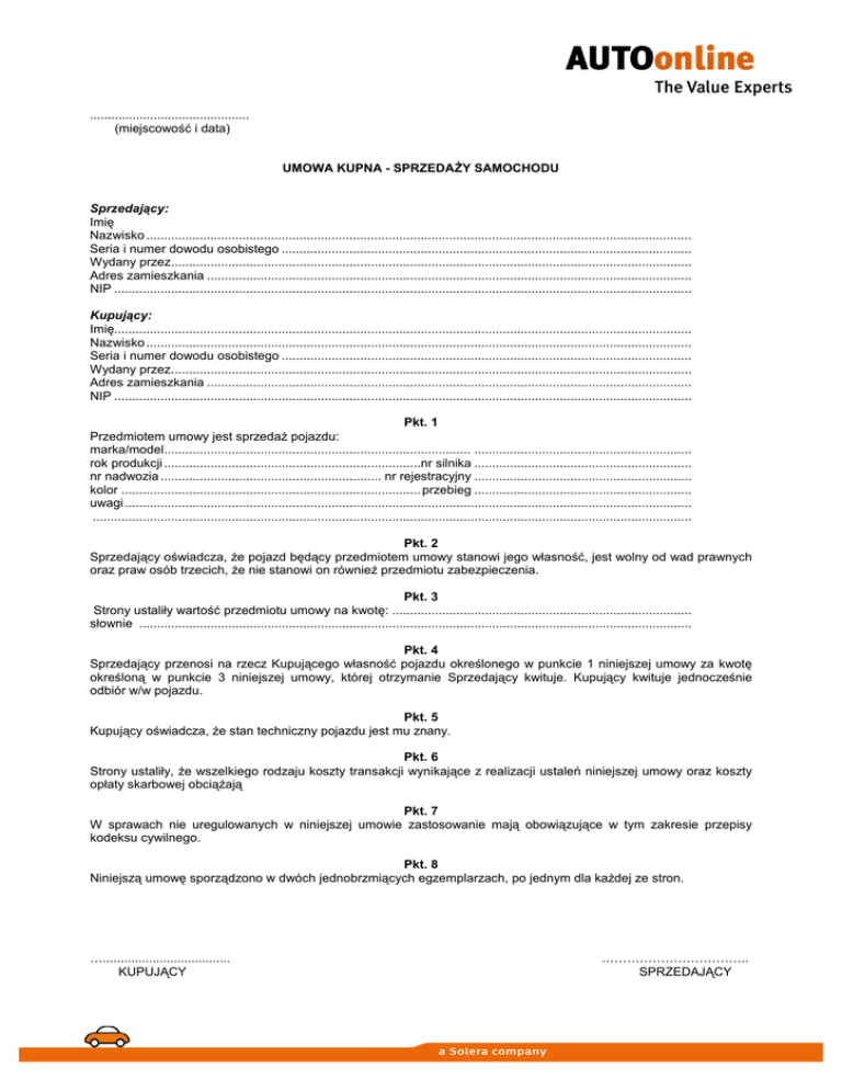 ............................................. (miejscowość i data) UMOWA KUPNA - SPRZEDAśY SAMOCHODU Sprzedający: Imię Nazwisko ......................................................................................................................................................... Seria i numer dowodu osobistego ................................................................................................................... Wydany przez .................................................................................................................................................. Adres zamieszkania ........................................................................................................................................ NIP .................................................................................................................................................................. Kupujący: Imię.................................................................................................................................................................. Nazwisko ......................................................................................................................................................... Seria i numer dowodu osobistego ................................................................................................................... Wydany przez. ................................................................................................................................................. Adres zamieszkania ........................................................................................................................................ NIP .................................................................................................................................................................. Pkt. 1 Przedmiotem umowy jest sprzedaŜ pojazdu: marka/model...................................................................................... ............................................................. rok produkcji ........................................................................nr silnika ............................................................. nr nadwozia .............................................................. nr rejestracyjny ............................................................. kolor .................................................................................... przebieg ............................................................. uwagi ............................................................................................................................................................... ........................................................................................................................................................................ Pkt. 2 Sprzedający oświadcza, Ŝe pojazd będący przedmiotem umowy stanowi jego własność, jest wolny od wad prawnych oraz praw osób trzecich, Ŝe nie stanowi on równieŜ przedmiotu zabezpieczenia. Pkt. 3 Strony ustaliły wartość przedmiotu umowy na kwotę: .................................................................................... słownie ........................................................................................................................................................... Pkt. 4 Sprzedający przenosi na rzecz Kupującego własność pojazdu określonego w punkcie 1 niniejszej umowy za kwotę określoną w punkcie 3 niniejszej umowy, której otrzymanie Sprzedający kwituje. Kupujący kwituje jednocześnie odbiór w/w pojazdu. Pkt. 5 Kupujący oświadcza, Ŝe stan techniczny pojazdu jest mu znany. Pkt. 6 Strony ustaliły, Ŝe wszelkiego rodzaju koszty transakcji wynikające z realizacji ustaleń niniejszej umowy oraz koszty opłaty skarbowej obciąŜają Pkt. 7 W sprawach nie uregulowanych w niniejszej umowie zastosowanie mają obowiązujące w tym zakresie przepisy kodeksu cywilnego. Pkt. 8 Niniejszą umowę sporządzono w dwóch jednobrzmiących egzemplarzach, po jednym dla kaŜdej ze stron. ….................................... KUPUJĄCY …………………………….. SPRZEDAJĄCY