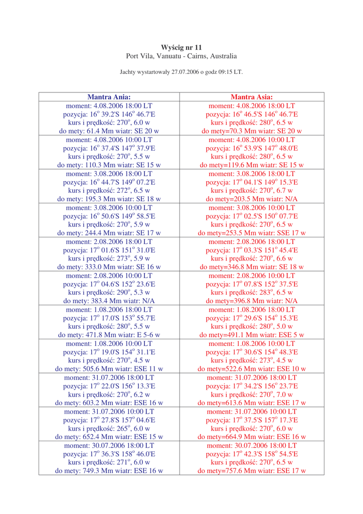 Wy cig nr 11 Port Vila, Vanuatu - Cairns, Australia Jachty wystartowały 27.07.2006 o godz 09:15 LT. Mantra Ania: moment: 4.08.2006 18:00 LT pozycja: 16o 39.2'S 146o 46.7'E kurs i pr dko : 270o, 6.0 w do mety: 61.4 Mm wiatr: SE 20 w moment: 4.08.2006 10:00 LT pozycja: 16o 37.4'S 147o 37.9'E kurs i pr dko : 270o, 5.5 w do mety: 110.3 Mm wiatr: SE 15 w moment: 3.08.2006 18:00 LT pozycja: 16o 44.7'S 149o 07.2'E kurs i pr dko : 272o, 6.5 w do mety: 195.3 Mm wiatr: SE 18 w moment: 3.08.2006 10:00 LT pozycja: 16o 50.6'S 149o 58.5'E kurs i pr dko : 270o, 5.9 w do mety: 244.4 Mm wiatr: SE 17 w moment: 2.08.2006 18:00 LT pozycja: 17o 01.6'S 151o 31.0'E kurs i pr dko : 273o, 5.9 w do mety: 333.0 Mm wiatr: SE 16 w moment: 2.08.2006 10:00 LT pozycja: 17o 04.6'S 152o 23.6'E kurs i pr dko : 290o, 5.3 w do mety: 383.4 Mm wiatr: N/A moment: 1.08.2006 18:00 LT pozycja: 17o 17.0'S 153o 55.7'E kurs i pr dko : 280o, 5.5 w do mety: 471.8 Mm wiatr: E 5-6 w moment: 1.08.2006 10:00 LT pozycja: 17o 19.0'S 154o 31.1'E kurs i pr dko : 270o, 4.5 w do mety: 505.6 Mm wiatr: ESE 11 w moment: 31.07.2006 18:00 LT pozycja: 17o 22.0'S 156o 13.3'E kurs i pr dko : 270o, 6.2 w do mety: 603.2 Mm wiatr: ESE 16 w moment: 31.07.2006 10:00 LT pozycja: 17o 27.8'S 157o 04.6'E kurs i pr dko : 265o, 6.0 w do mety: 652.4 Mm wiatr: ESE 15 w moment: 30.07.2006 18:00 LT pozycja: 17o 36.3'S 158o 46.0'E kurs i pr dko : 271o, 6.0 w do mety: 749.3 Mm wiatr: ESE 16 w Mantra Asia: moment: 4.08.2006 18:00 LT pozycja: 16o 46.5'S 146o 46.7'E kurs i pr dko : 280o, 6.5 w do mety=70.3 Mm wiatr: SE 20 w moment: 4.08.2006 10:00 LT pozycja: 16o 53.9'S 147o 48.0'E kurs i pr dko : 280o, 6.5 w do mety=119.6 Mm wiatr: SE 15 w moment: 3.08.2006 18:00 LT pozycja: 17o 04.1'S 149o 15.3'E kurs i pr dko : 270o, 6.7 w do mety=203.5 Mm wiatr: N/A moment: 3.08.2006 10:00 LT pozycja: 17o 02.5'S 150o 07.7'E kurs i pr dko : 270o, 6.5 w do mety=253.5 Mm wiatr: SSE 17 w moment: 2.08.2006 18:00 LT pozycja: 17o 03.3'S 151o 45.4'E kurs i pr dko : 270o, 6.6 w do mety=346.8 Mm wiatr: SE 18 w moment: 2.08.2006 10:00 LT pozycja: 17o 07.8'S 152o 37.5'E kurs i pr dko : 283o, 6.5 w do mety=396.8 Mm wiatr: N/A moment: 1.08.2006 18:00 LT pozycja: 17o 29.6'S 154o 15.3'E kurs i pr dko : 280o, 5.0 w do mety=491.1 Mm wiatr: ESE 5 w moment: 1.08.2006 10:00 LT pozycja: 17o 30.6'S 154o 48.3'E kurs i pr dko : 273o, 4.5 w do mety=522.6 Mm wiatr: ESE 10 w moment: 31.07.2006 18:00 LT pozycja: 17o 34.2'S 156o 23.7'E kurs i pr dko : 270o, 7.0 w do mety=613.6 Mm wiatr: ESE 17 w moment: 31.07.2006 10:00 LT pozycja: 17o 37.5'S 157o 17.3'E kurs i pr dko : 270o, 6.0 w do mety=664.9 Mm wiatr: ESE 16 w moment: 30.07.2006 18:00 LT pozycja: 17o 42.3'S 158o 54.5'E kurs i pr dko : 270o, 6.5 w do mety=757.6 Mm wiatr: ESE 17 w moment: 30.07.2006 10:00 LT pozycja: 17o 40.8'S 159o 41.4'E kurs i pr dko : 269o, 6.1 w do mety: 802.3 Mm wiatr: ESE 16 w moment: 29.07.2006 18:00 LT pozycja: 17o 43.1'S 161o 30.2'E kurs i pr dko : 270o, 6.0 w do mety: 906.0 Mm wiatr: E 18 w Mantra Ania ustanowiła swój nowy rekord przebiegu dobowego: 176Mm moment: 29.07.2006 10:00 LT pozycja: 17o 42.9'S 162o 23.4'E kurs i pr dko : 270o, 7.2 w do mety: 956.7 Mm wiatr: E 20-22 w moment: 28.07.2006 18:00 LT pozycja: 17o 43.8'S 164o 17.0'E kurs i pr dko : 275o, 7.5 w do mety: 1065.1 Mm wiatr: ESE 25 w moment: 28.07.2006 10:00 LT pozycja: 17o 45.0'S 165o 14.5'E kurs i pr dko : 270o, 7.2 w do mety: 1119.9 Mm wiatr: ESE 25 w moment: 27.07.2006 18:00 LT pozycja: 17o 45.1'S 167o 14.5'E kurs i pr dko : 270o, 7.5 w do mety: 1234.4 Mm wiatr: ESE 25 w moment: 30.07.2006 10:00 LT pozycja: 17o 43.3'S 159o 48.4'E kurs i pr dko : 270o, 7.0 w do mety=809.0 Mm wiatr: E 18 w moment: 29.07.2006 18:00 LT pozycja: 17o 37.8'S 161o 35.0'E kurs i pr dko : 270o, 7.8 w do mety=910.5 Mm wiatr: ESE 25 w moment: 29.07.2006 10:00 LT pozycja: 17o 35.2'S 162o 30,1'E kurs i pr dko : 270o, 7.0 w do mety=963.1 Mm wiatr: ESE 20 w moment: 28.07.2006 18:00 LT pozycja: 17o 32.1'S 164o 24,8'E kurs i pr dko : 270o, 7.8 w do mety=1072.5 Mm wiatr: ESE 25 w moment: 28.07.2006 10:00 LT pozycja: 17o 36.9'S 165o 21,3'E kurs i pr dko : 280o, 7.5 w do mety=1226.4 Mm wiatr: ESE 25 w moment: 27.07.2006 18:00 LT pozycja: 17o 45.0'S 167o 16.8'E kurs i pr dko : 270o, 6.8 w do mety=1236.6 Mm wiatr: SE 23-25 w Na met w Cairns pierwszy przypłyn ł jacht mantra ANIA - 4 sierpnia 2006 23:05LT. Drugi był jacht mantra ASIA - 5 sierpnia 2006, 01:34LT. Po obliczeniu czasu skorygowanego zwyci zc wy cigu został jacht mantra ASIA