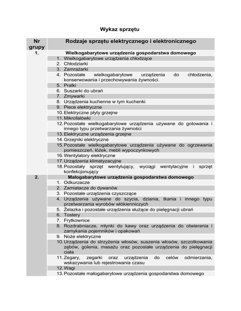Wykaz sprzętu Nr grupy Rodzaje sprzętu elektrycznego i